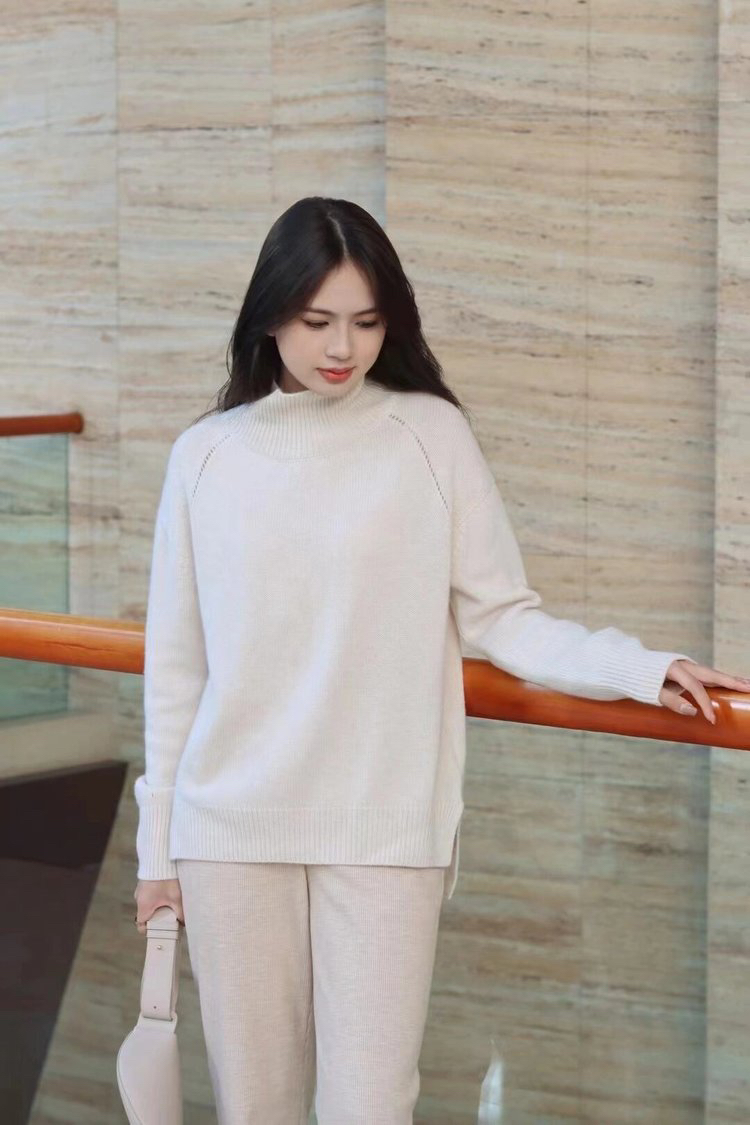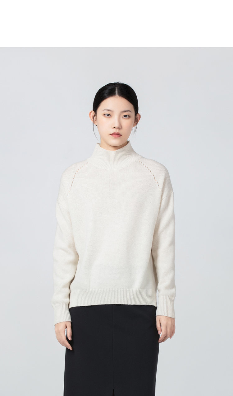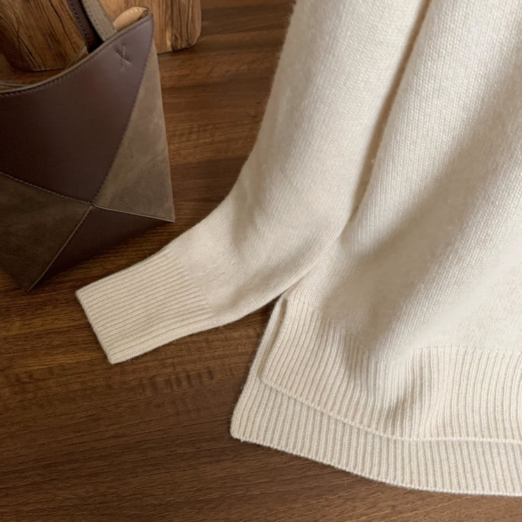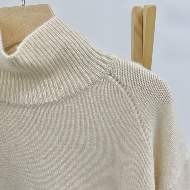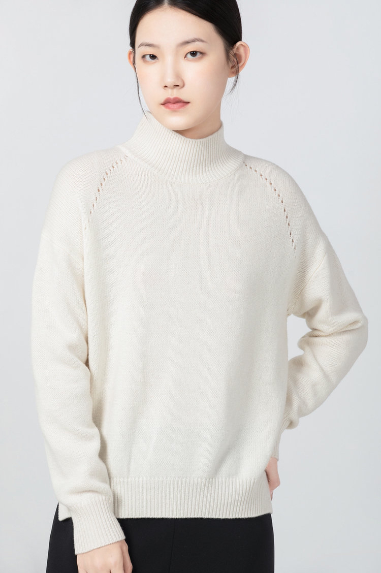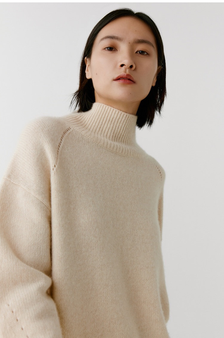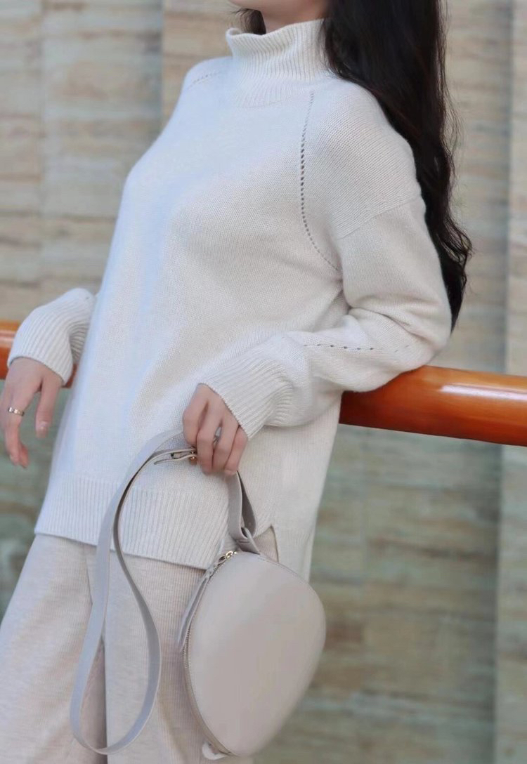 合股羊绒高领乳白色针织衫 97%羊绒+3%羊毛 手感丰厚柔软 宽松版型设计 罗纹高领 下摆开叉