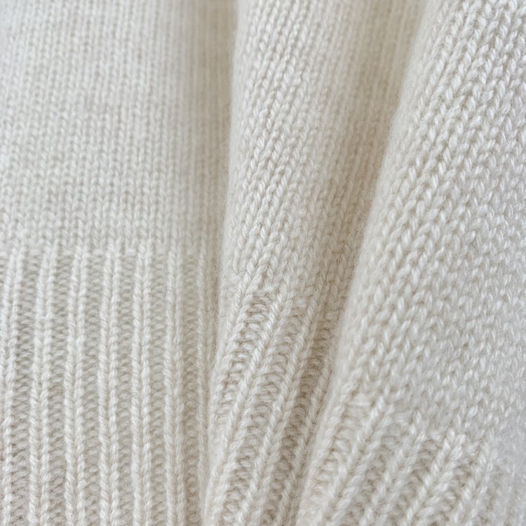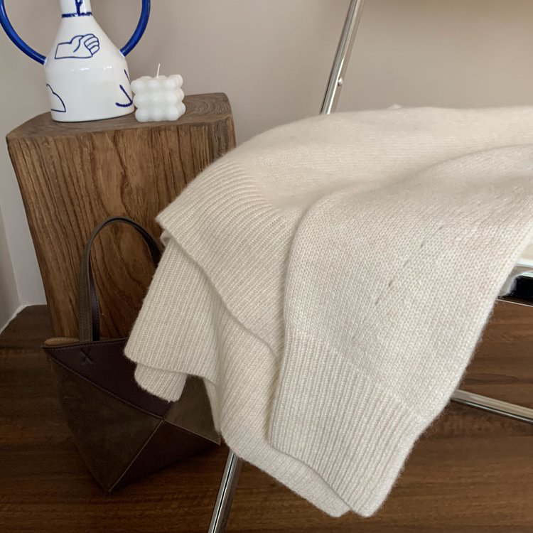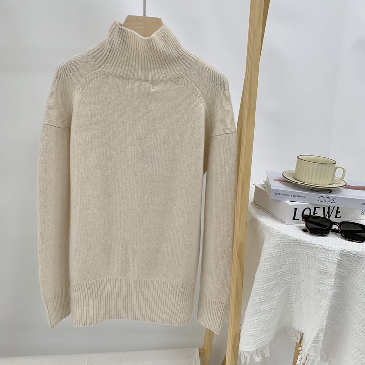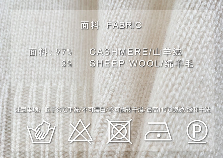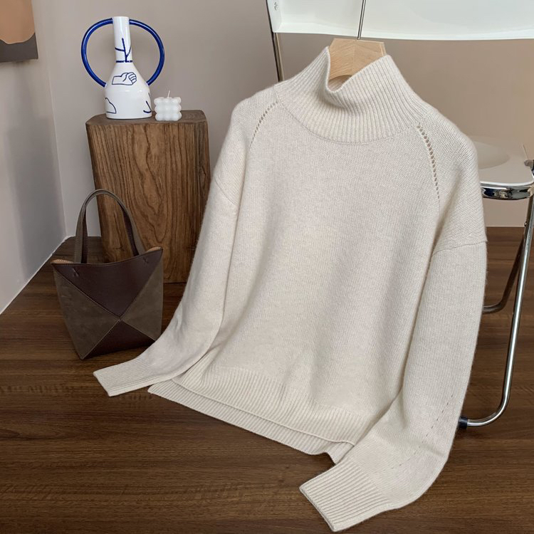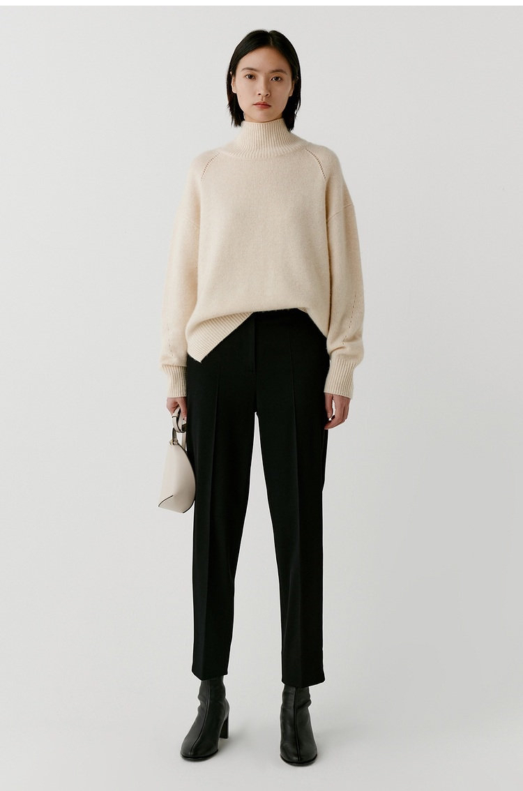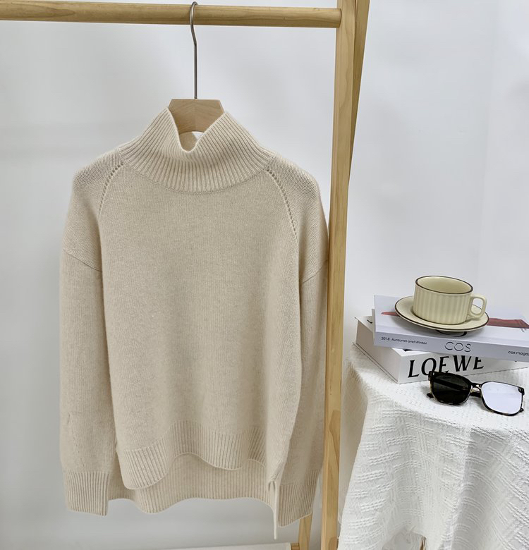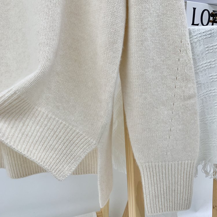 合股羊绒高领乳白色针织衫 97%羊绒+3%羊毛 手感丰厚柔软 宽松版型设计 罗纹高领 下摆开叉