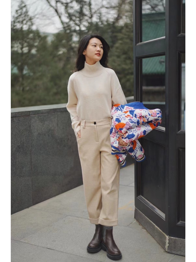高领设计升级温暖感,恰当松量适应多种身型,带来舒适穿着感受,采用合股羊绒纱线织就,使织物更有厚度与密实感,具有较好的舒适性。
