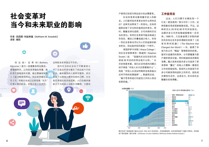 影响职业的不仅仅是技术,社会变革也是重要因素之一。自驾车还没有上路,出租车行业已经受到滴滴的影响。人类寿命大幅度延长;环保、安全越来越受重视;人们生活理念改变……特定职业会以更快的速度消失和诞生,可以终身从事的职业越来越少,一劳永逸的技能不复存在;而且,一个为规定的时间工作而建造的特殊地方已经变得不太重要,工作可以对任何人开放,在任何地方完成;人们可以一直“工作”。