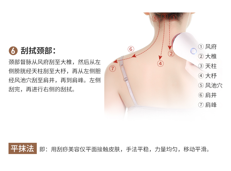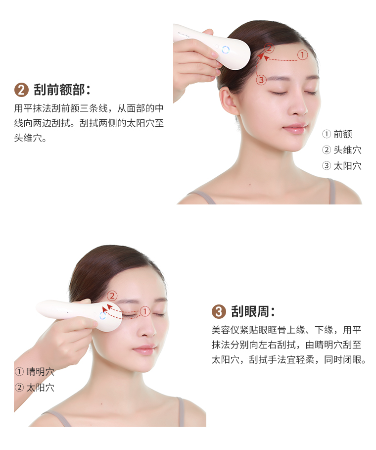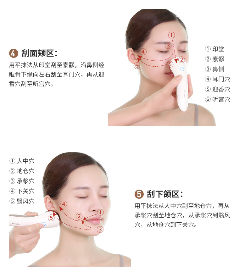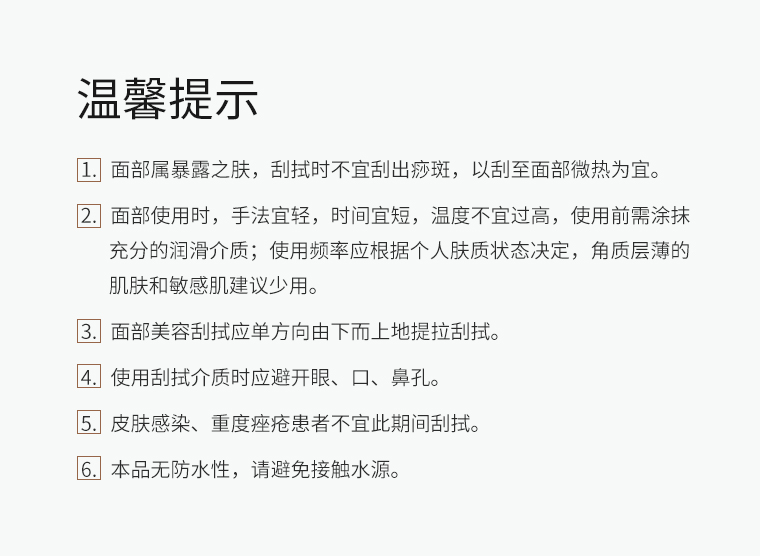 3.面部属暴露之肤,不宜追求刮出痧斑,以按摩至面部微热为宜。