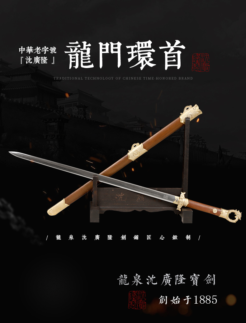 - 龙泉沈广隆剑舖创始于1885年(清光绪)位于浙江省龙泉市,是当地唯一一家“子承父业”一脉相承的中华老字号宝剑生产企业,是国家级非物质文化遗产龙泉宝剑项目保护单位,并以“天下第一剑”闻名于海内外....
