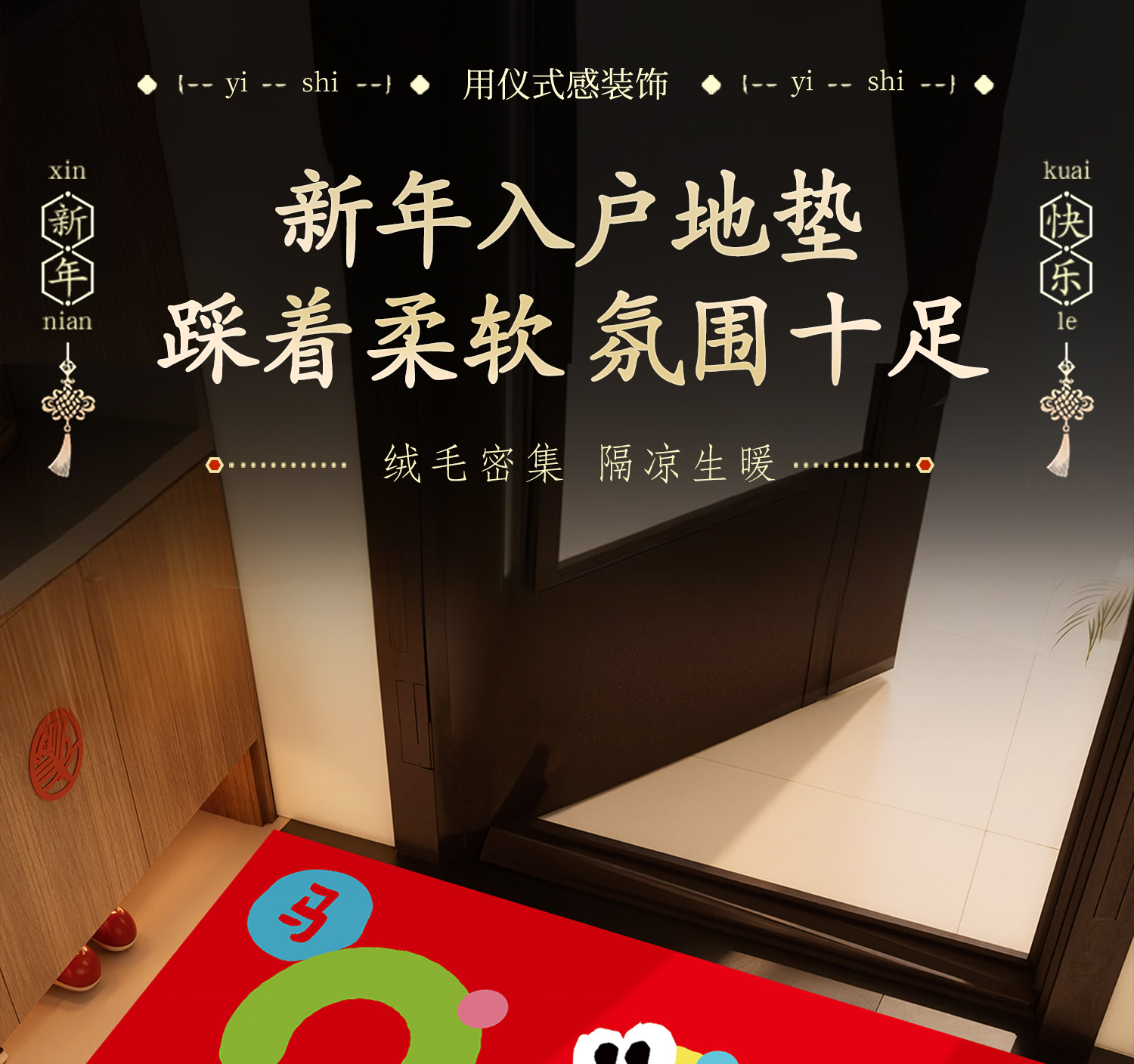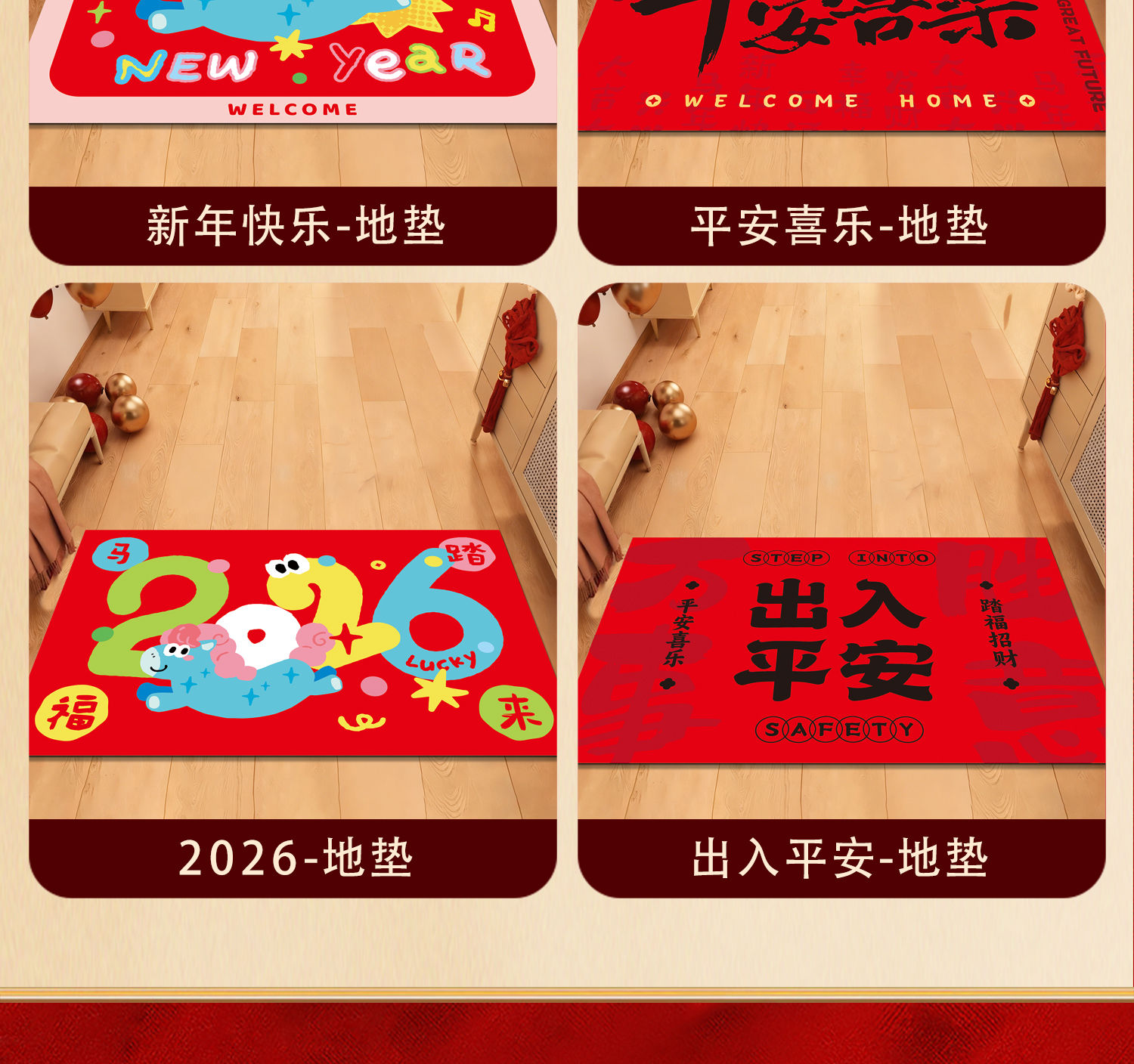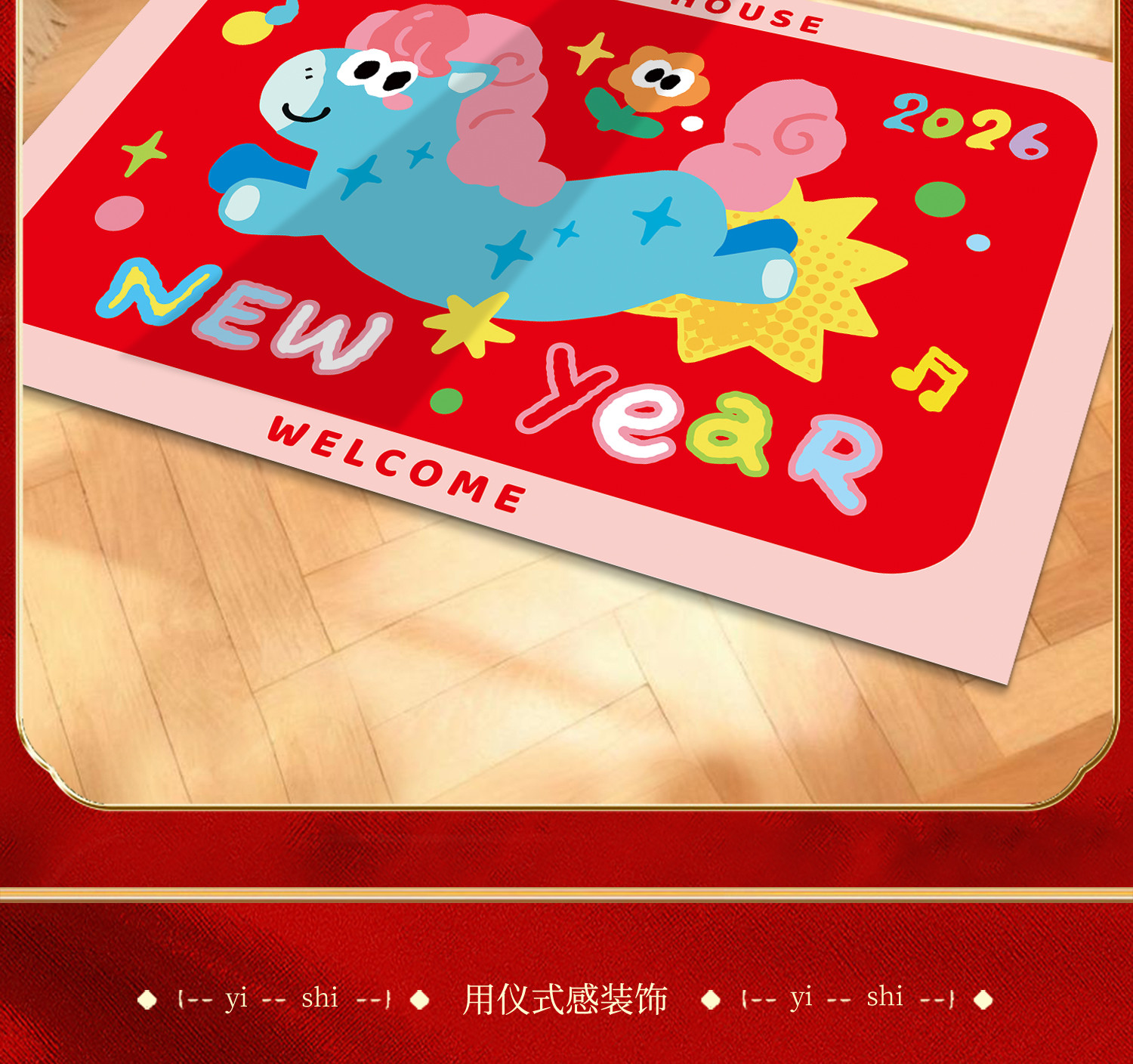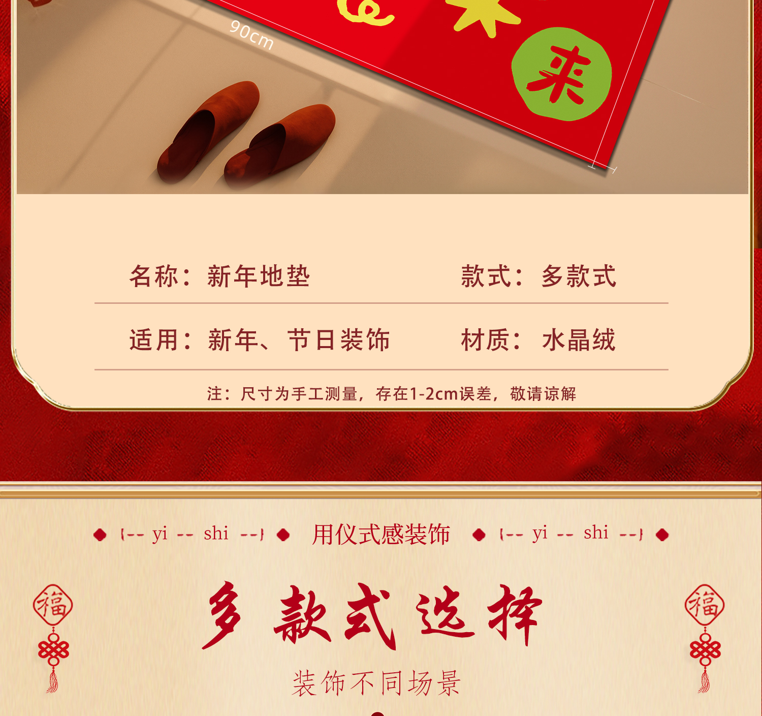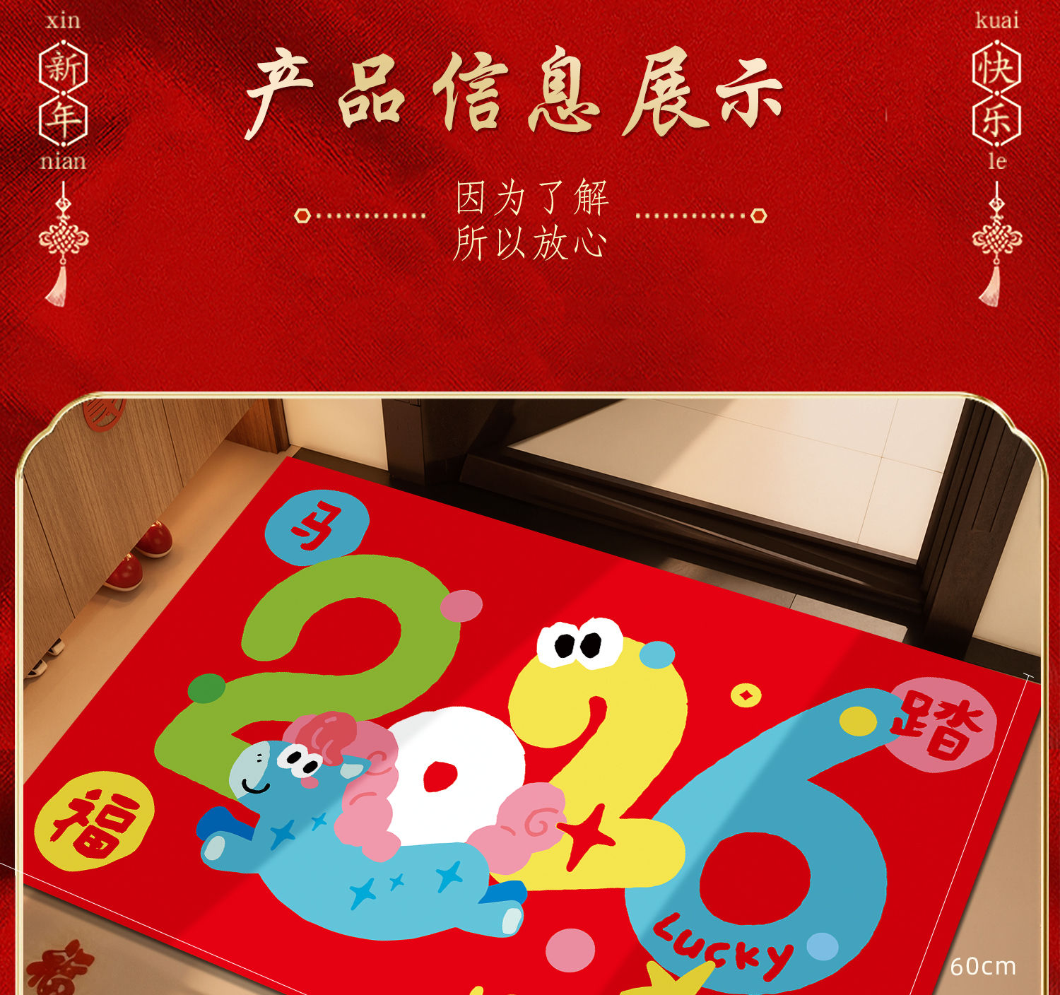 2026年新年马年入户门玄关地垫水晶绒长绒立体图案红色喜庆进门脚垫新年地毯家用防滑门垫子大尺寸60*90