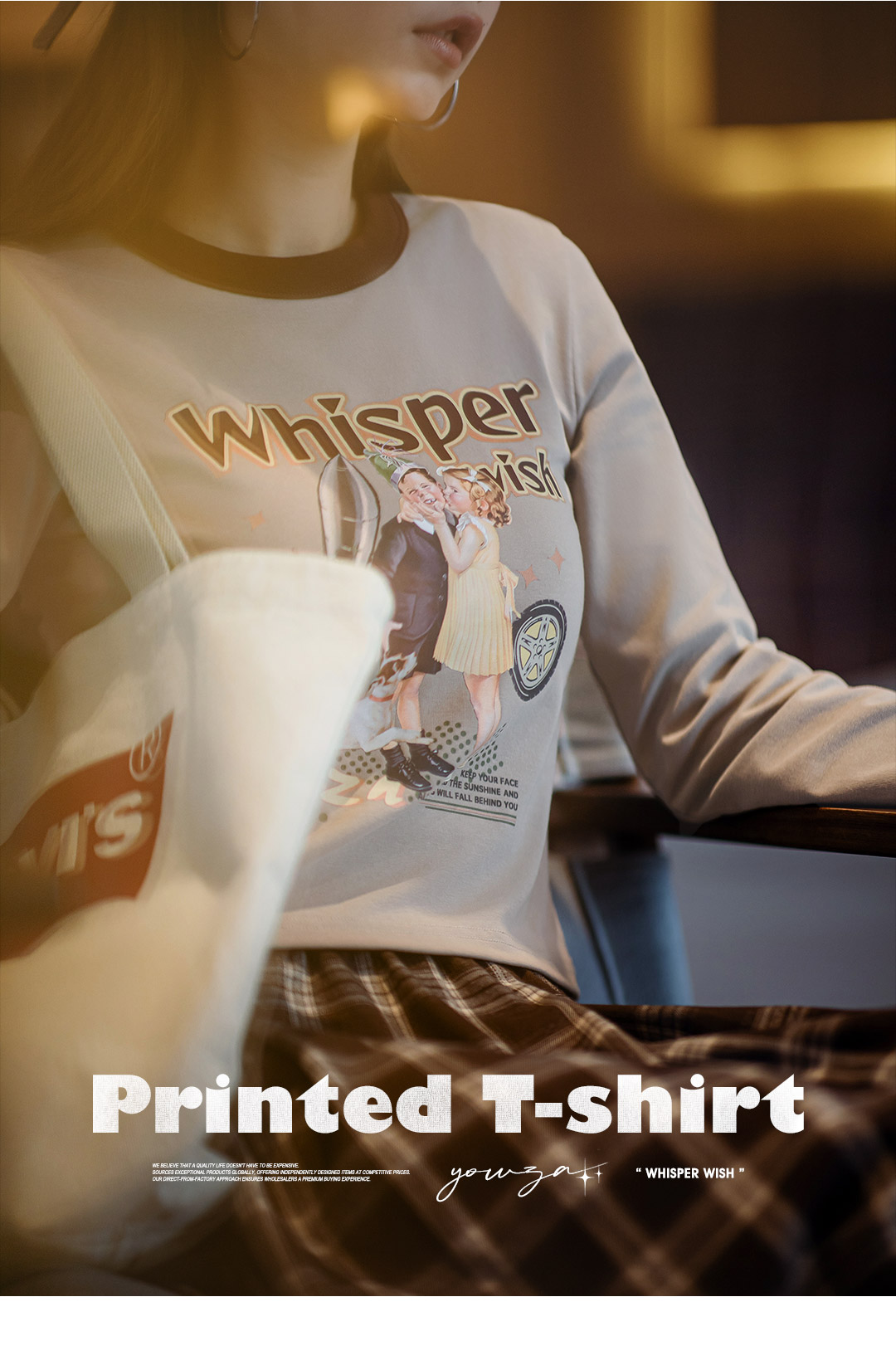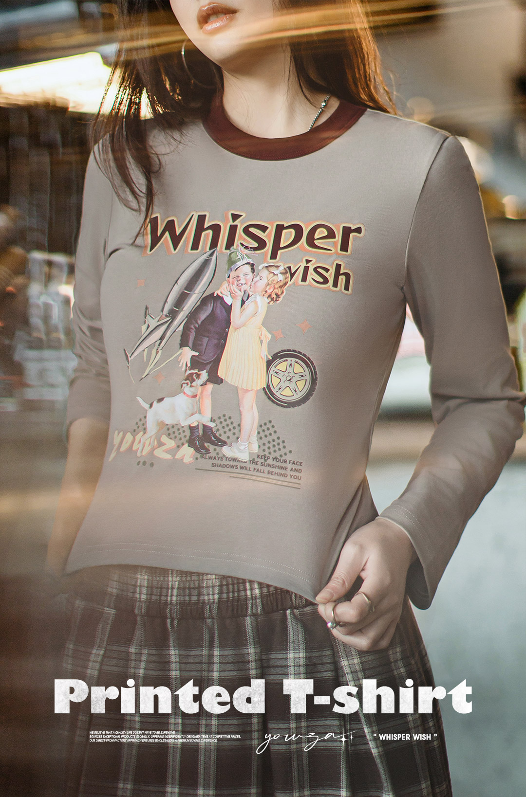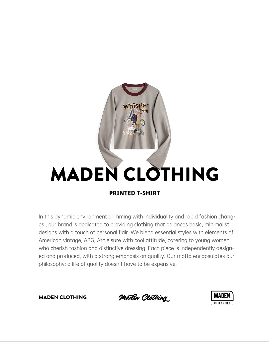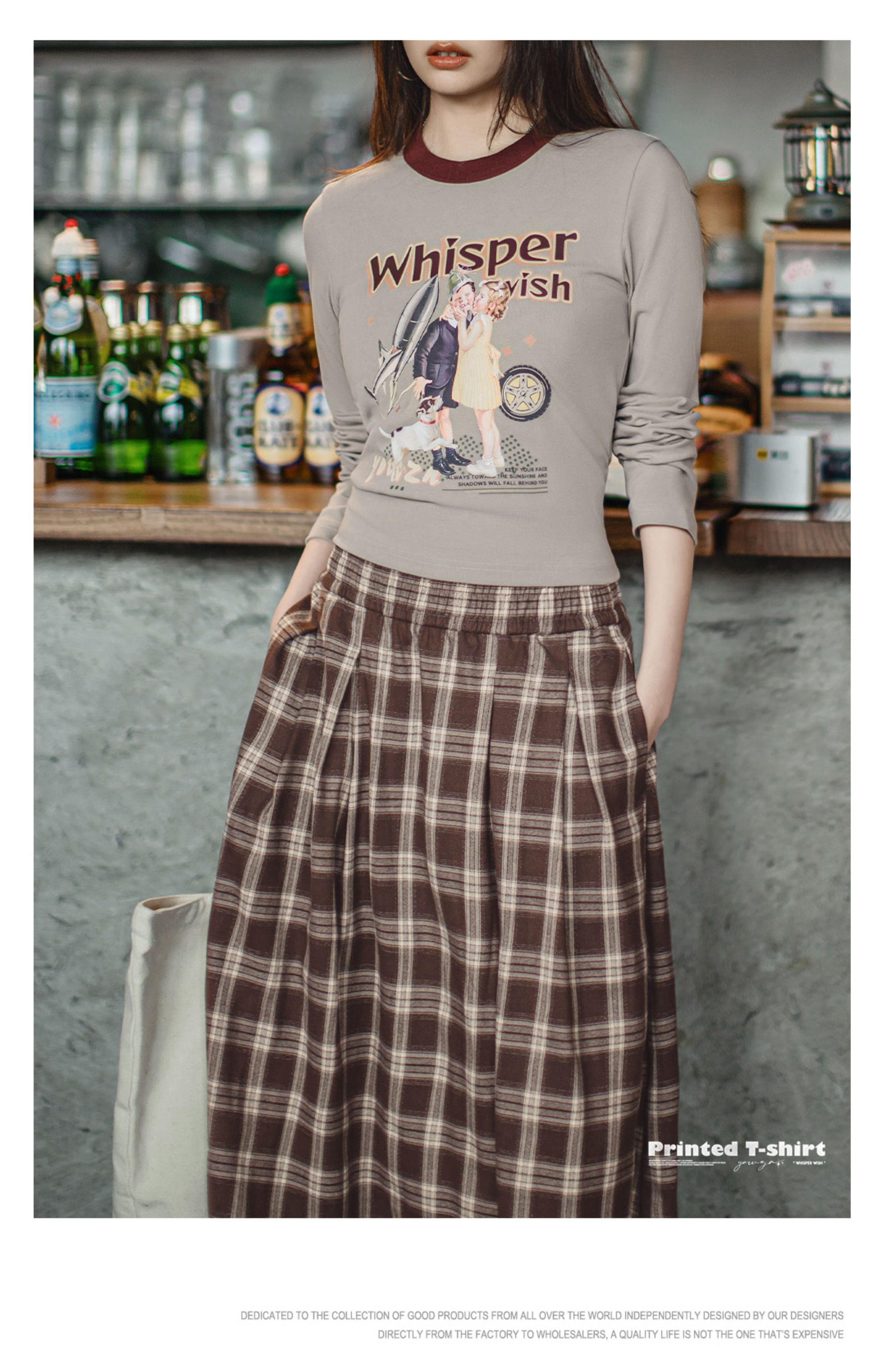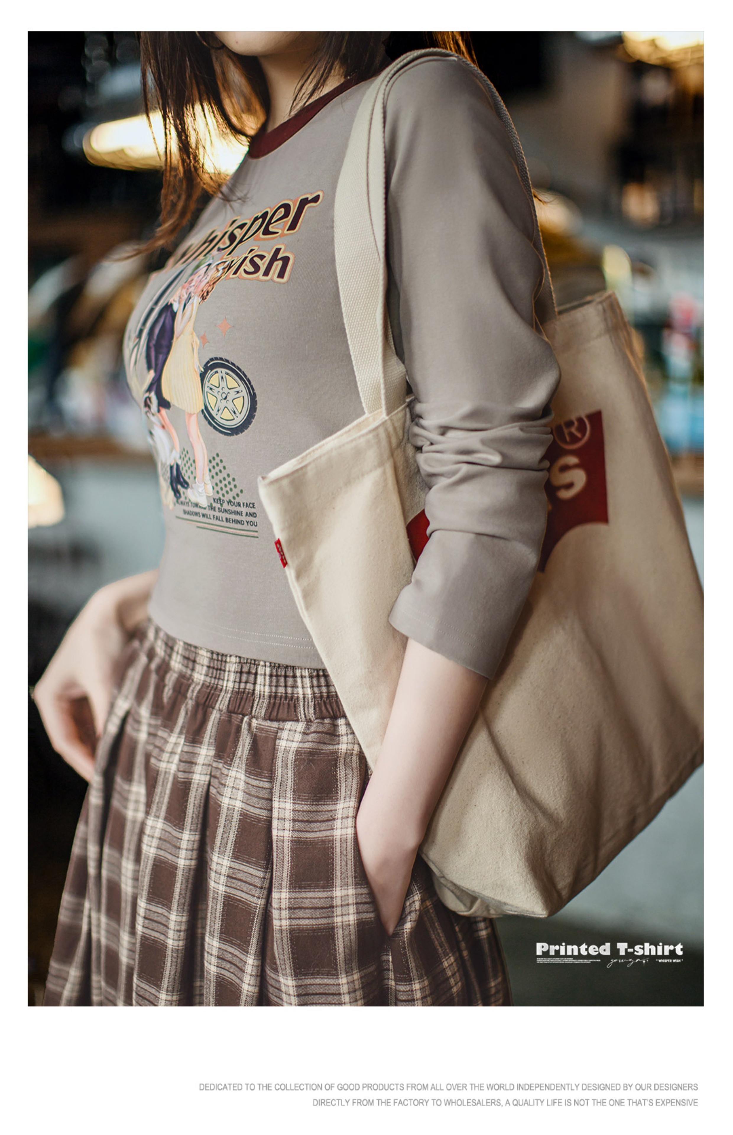 马登美式螺纹撞色T恤卡其色弹力复古印花外穿打底长袖上衣春秋女