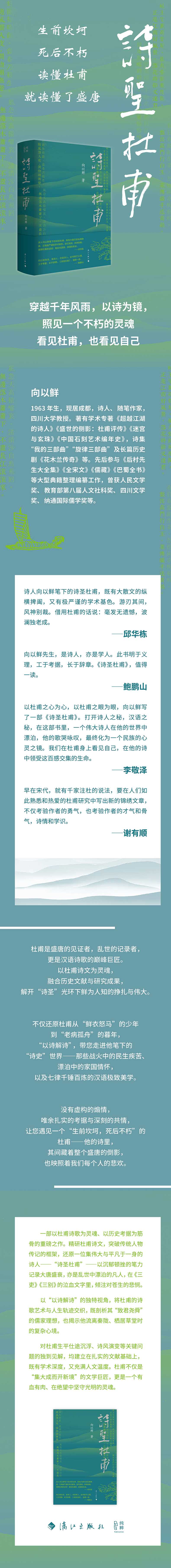 以杜甫之心为心,以杜甫之眼为眼,向以鲜写了一部《诗圣杜甫》。打开诗人之秘,汉语之秘,在这部书里,一个伟大诗人在他的世界中漂泊,他的歌哭咏叹,最终化为一个民族的心灵之镜。我们在杜甫身上看见自己,在他的诗中领受这百感交集的生命。