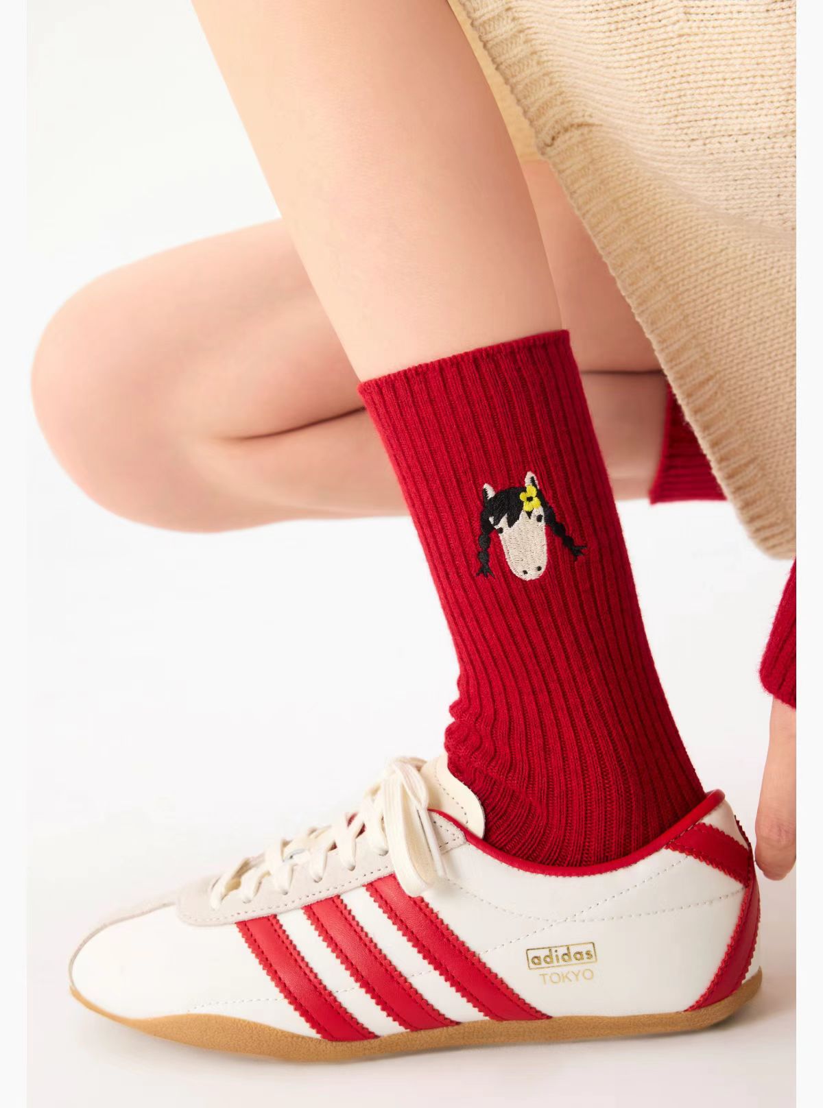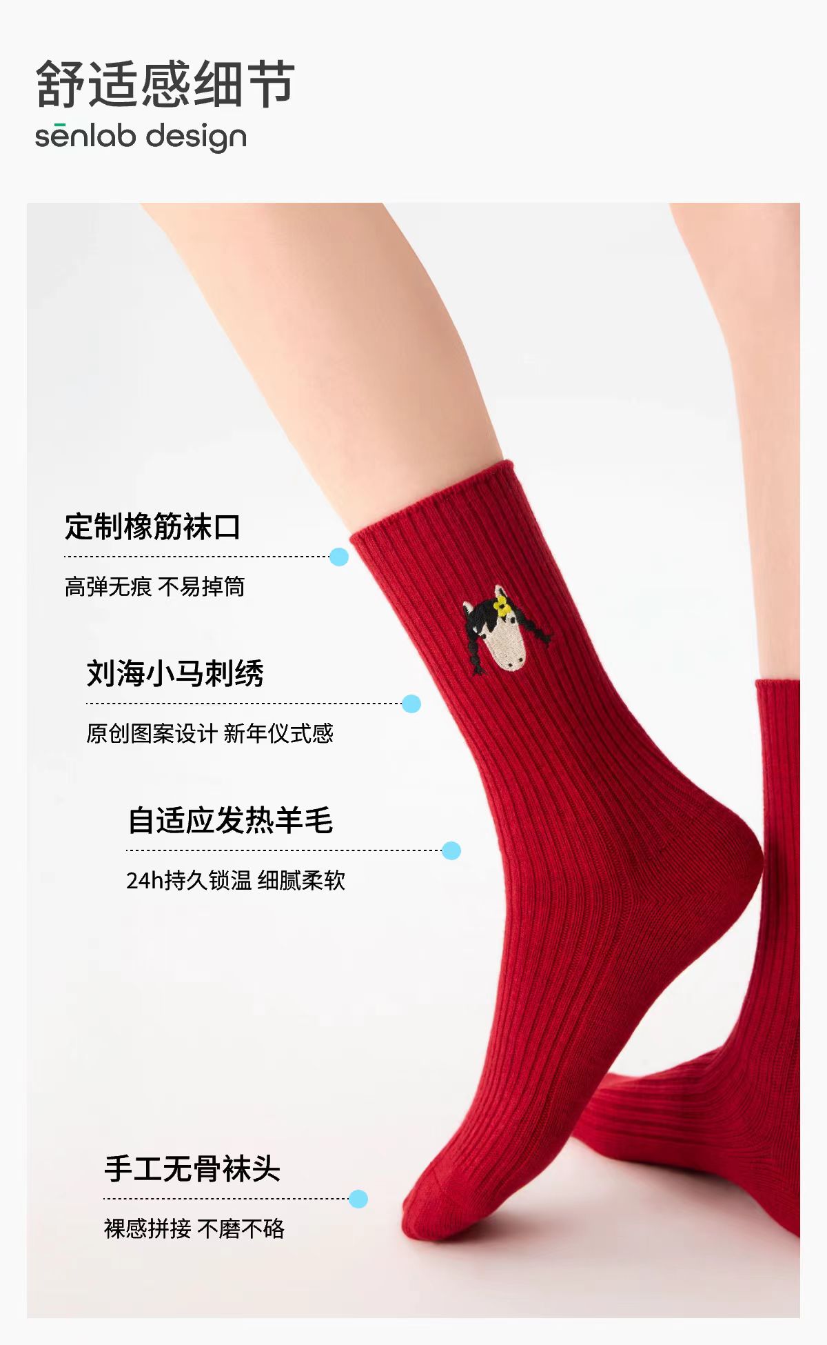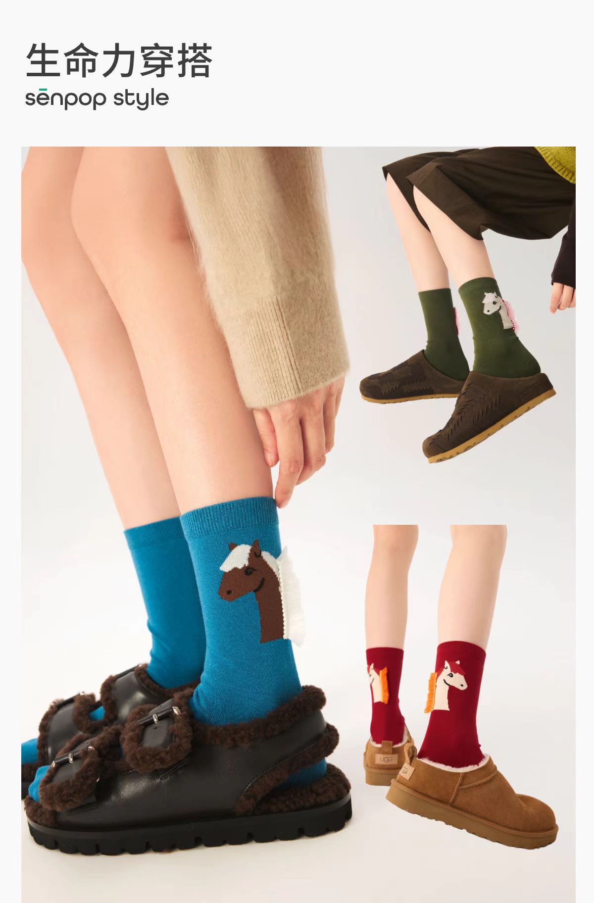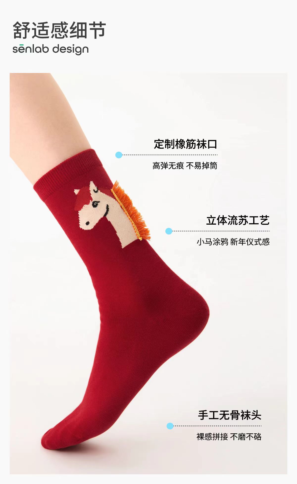 4楼Eubelle欧蓓 上森派系红袜本命年袜 冬马年堆堆袜 小马流苏涂鸦中筒袜 活动价:59.9元