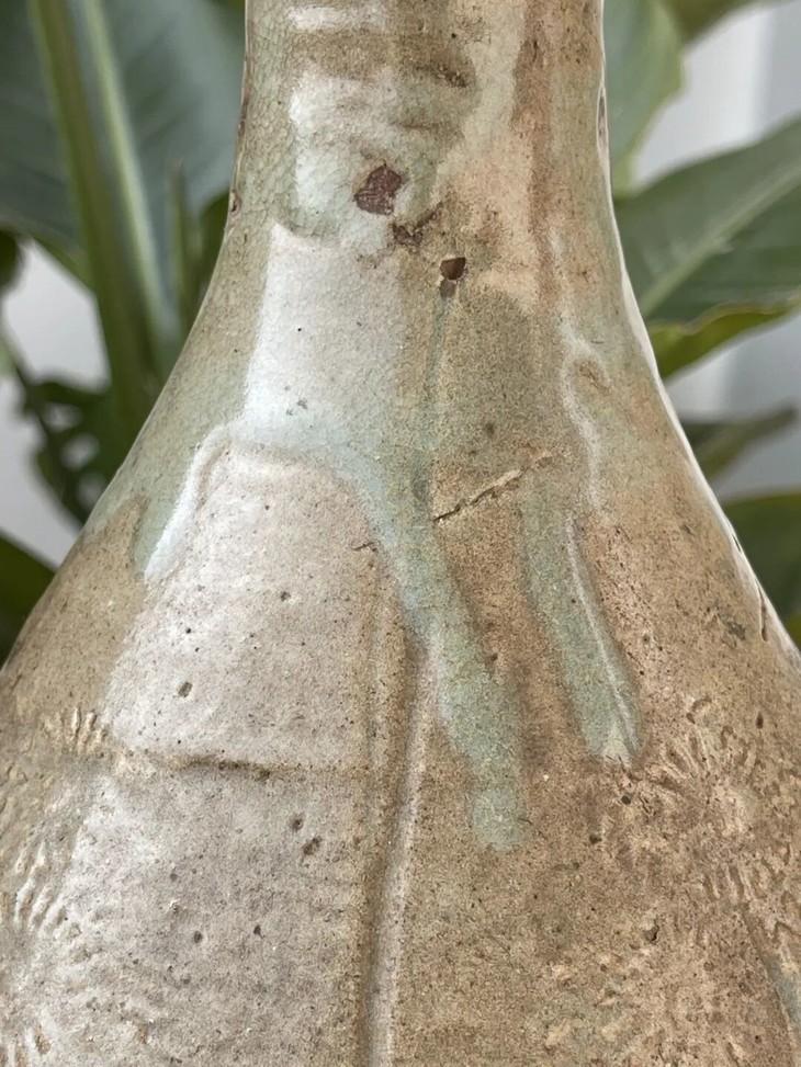 这是一件朝鲜半岛高丽时期风格的青瓷大玉壶春瓶,执壺,造型优美饱满圆融的玉壶春瓶,全器满工象嵌细菊花纹,表面覆盖褐色高丽青瓷釉,呈现典型高丽时代流传的青瓷器物风格,纹饰简约豪迈,风格典雅贵气,底部矮圈足上沾黏石英垫饼痕迹。
