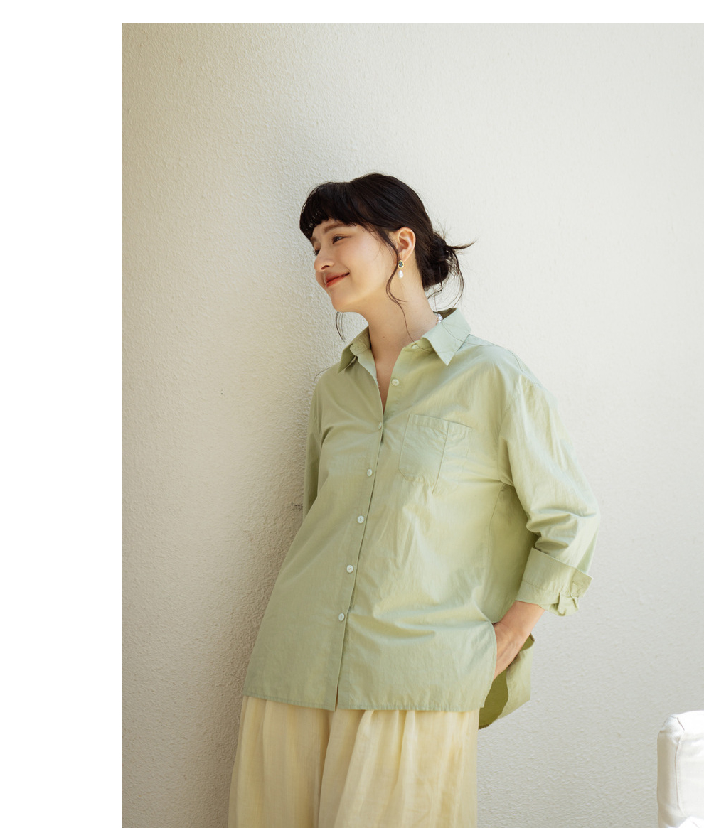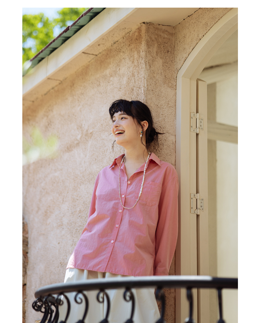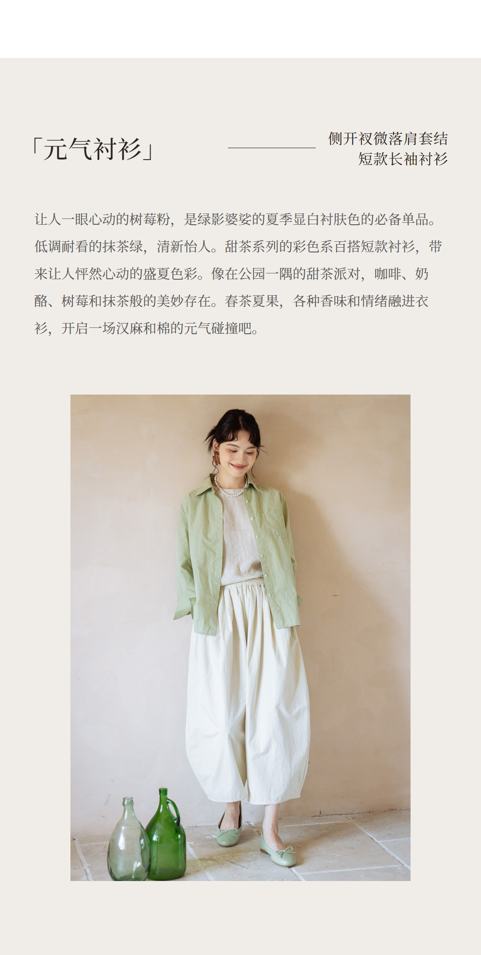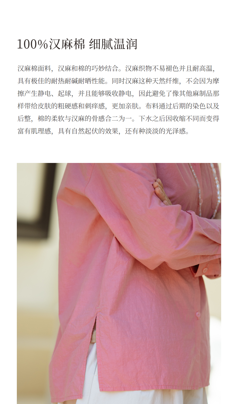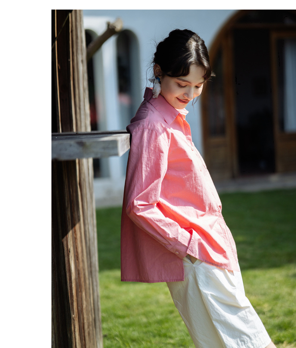 绽放旅行女装403朵/100%汉麻棉侧开衩微落肩套结短款长袖棉麻衬衫