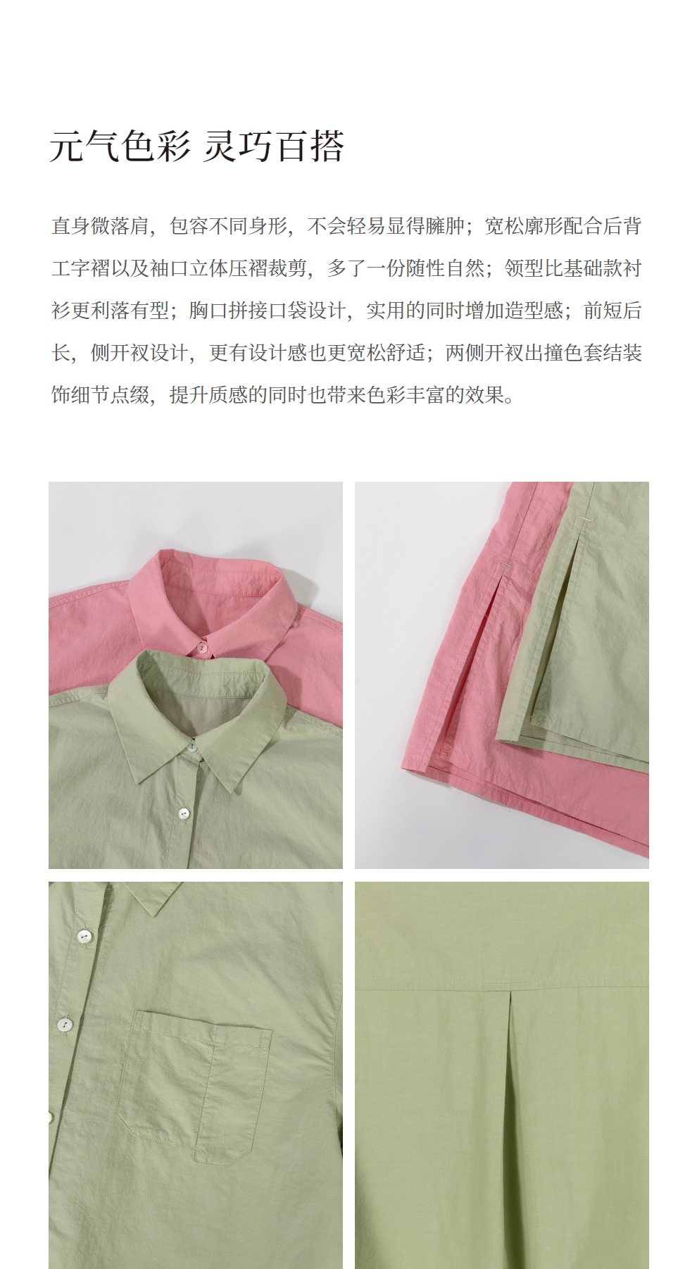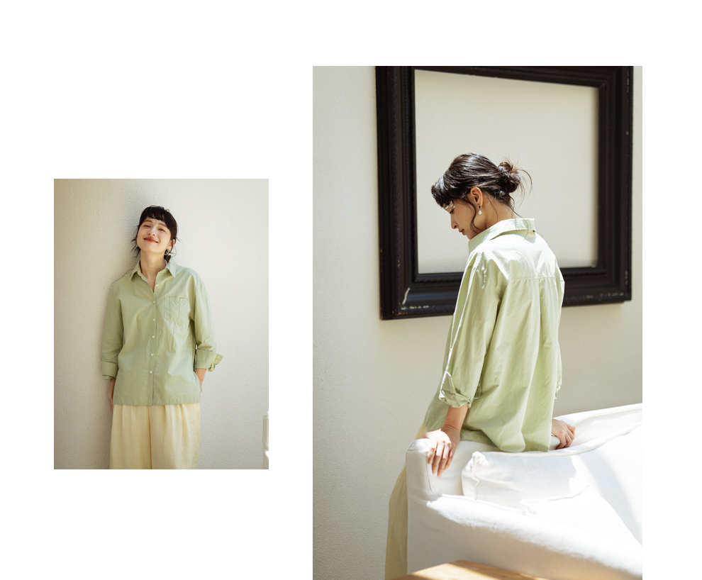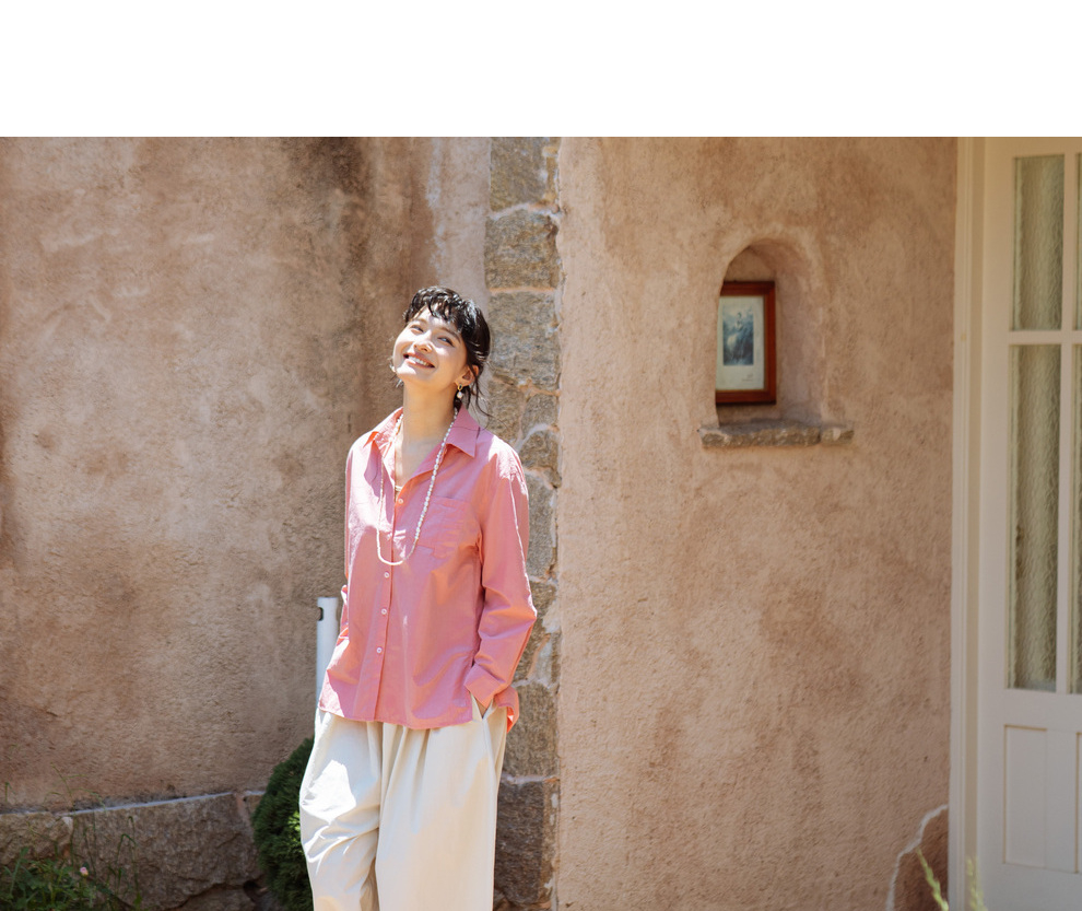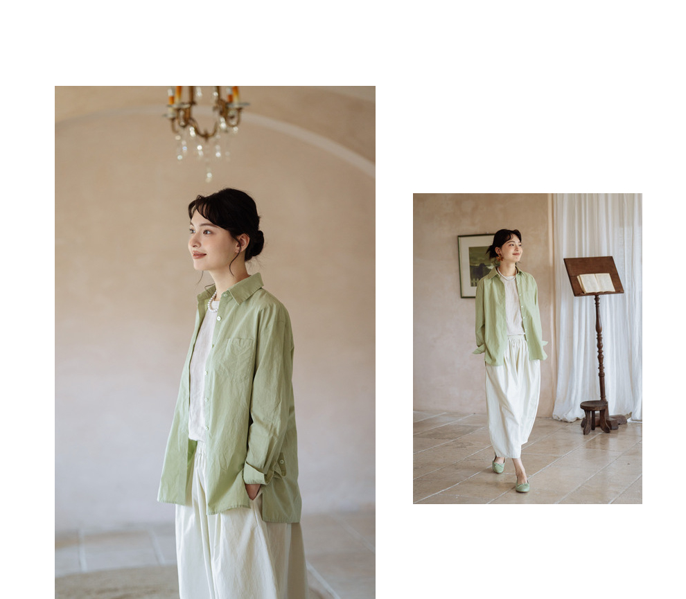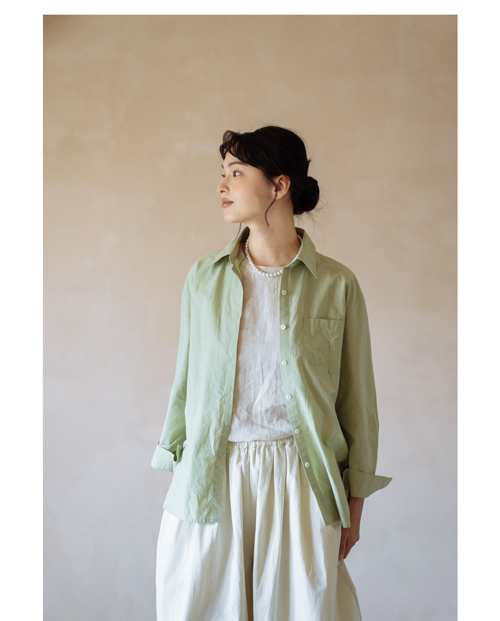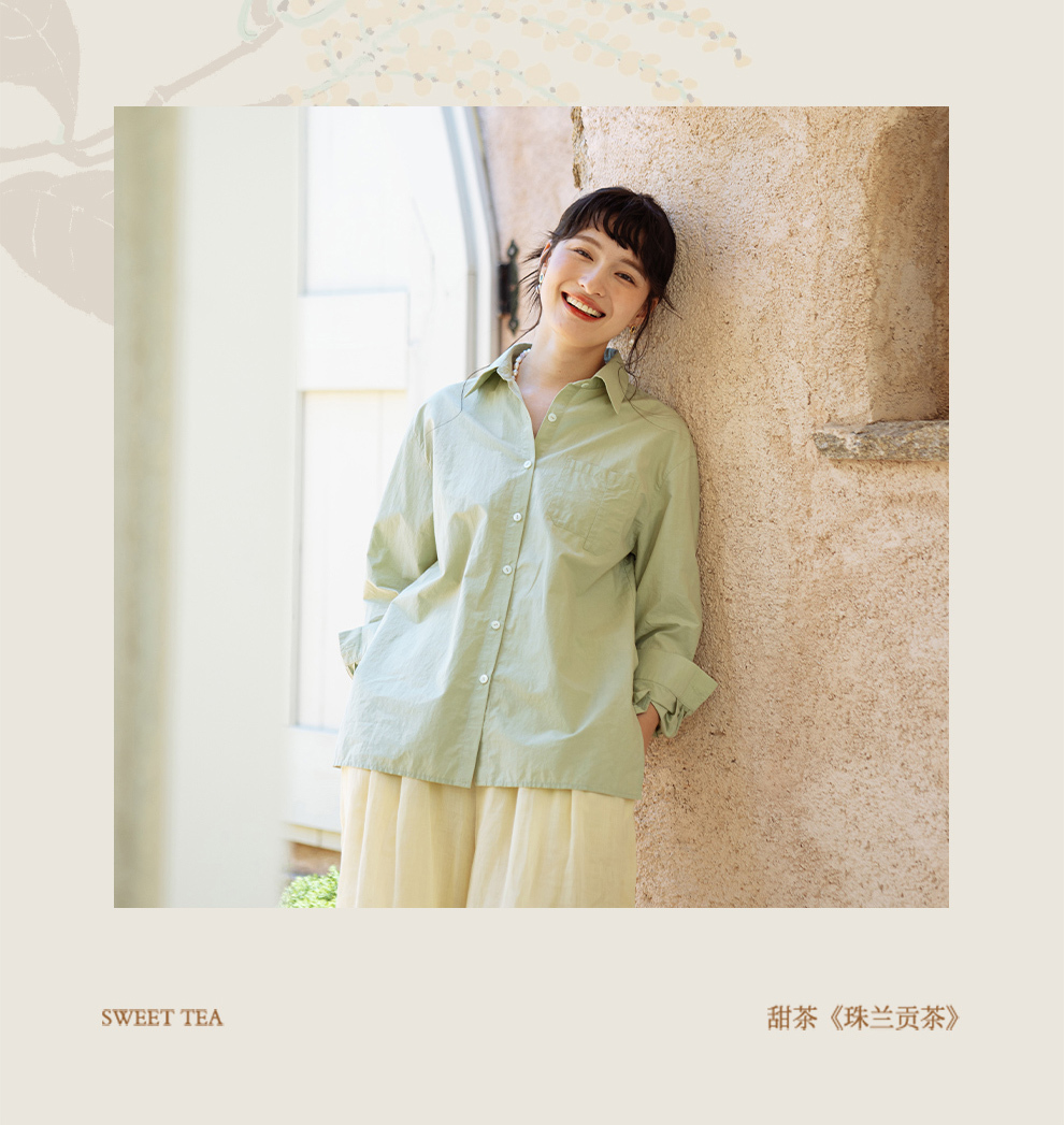 绽放旅行女装403朵/100%汉麻棉侧开衩微落肩套结短款长袖棉麻衬衫
