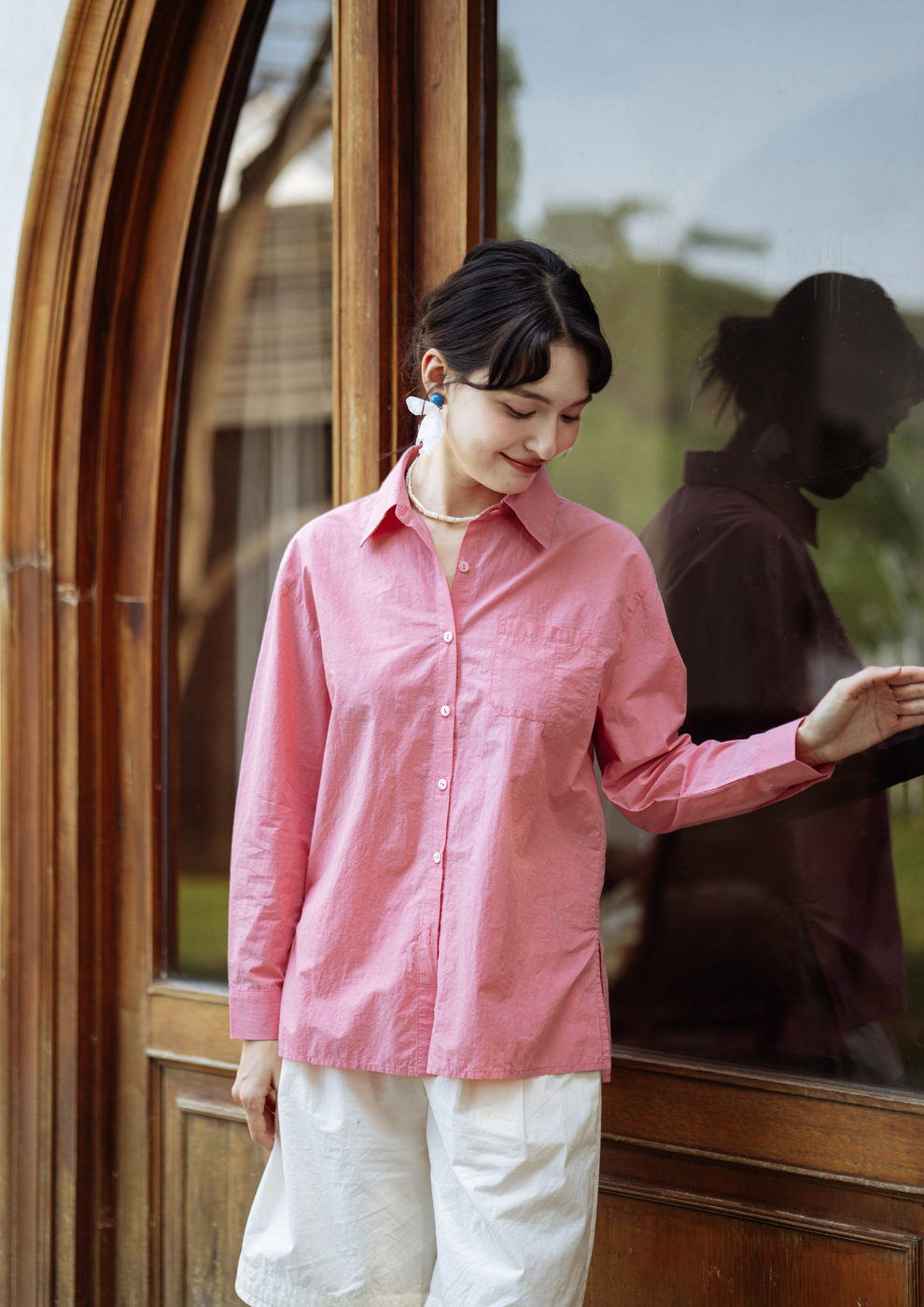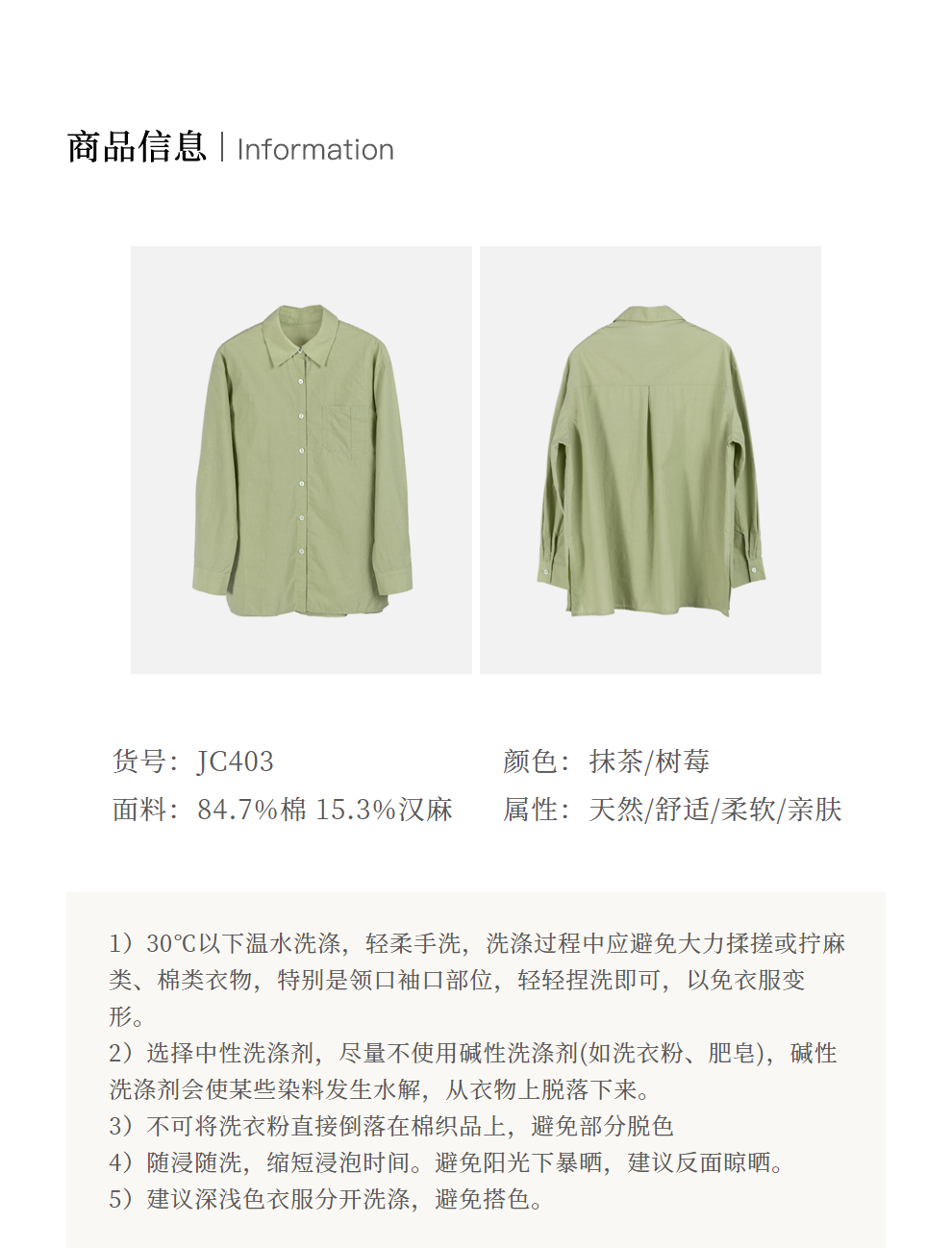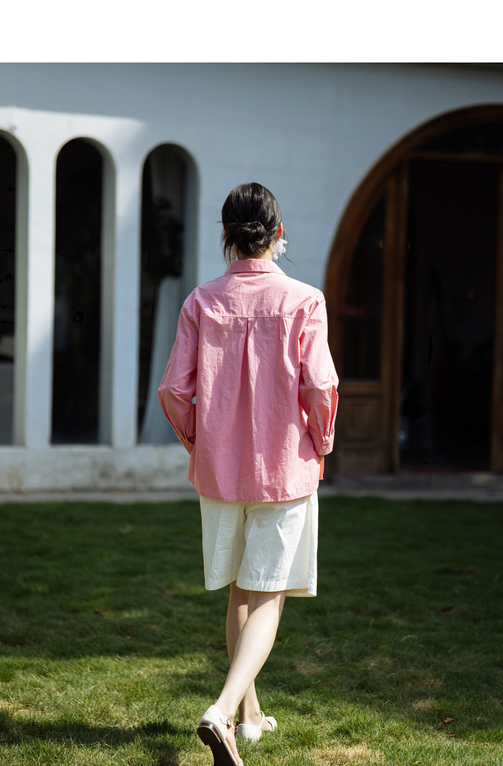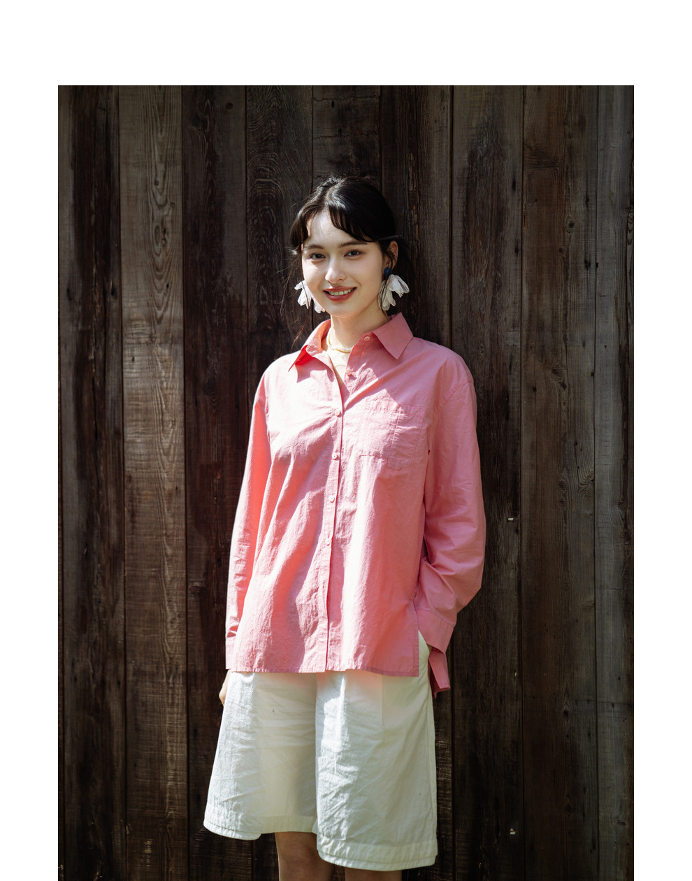 绽放旅行女装403朵/100%汉麻棉侧开衩微落肩套结短款长袖棉麻衬衫