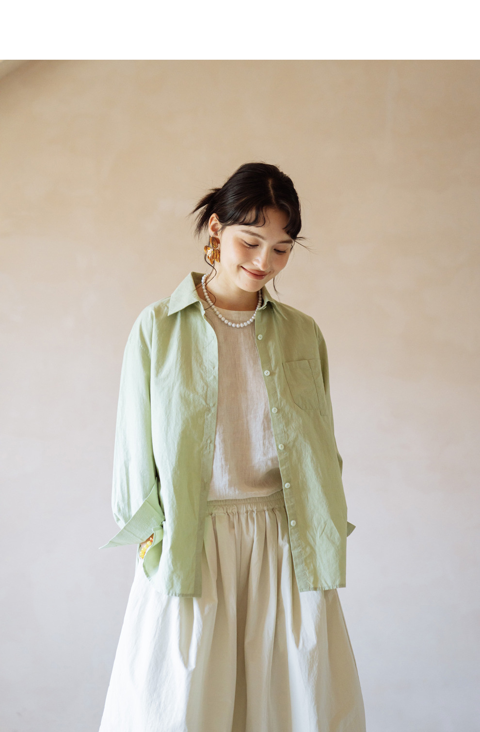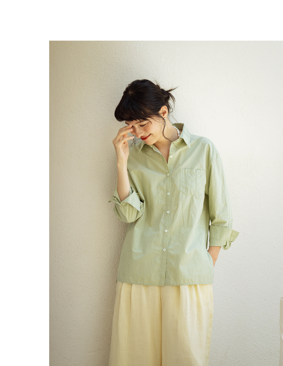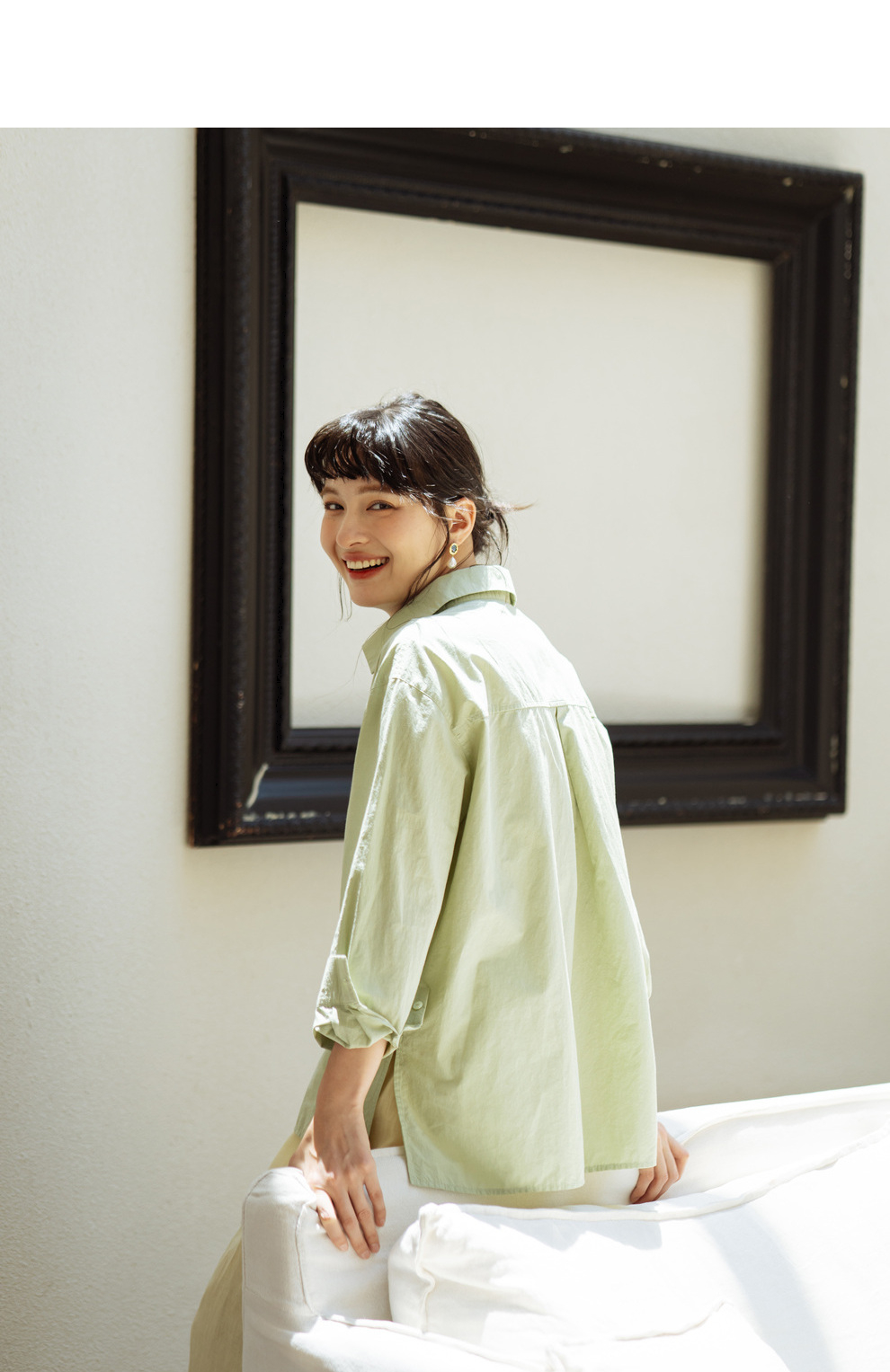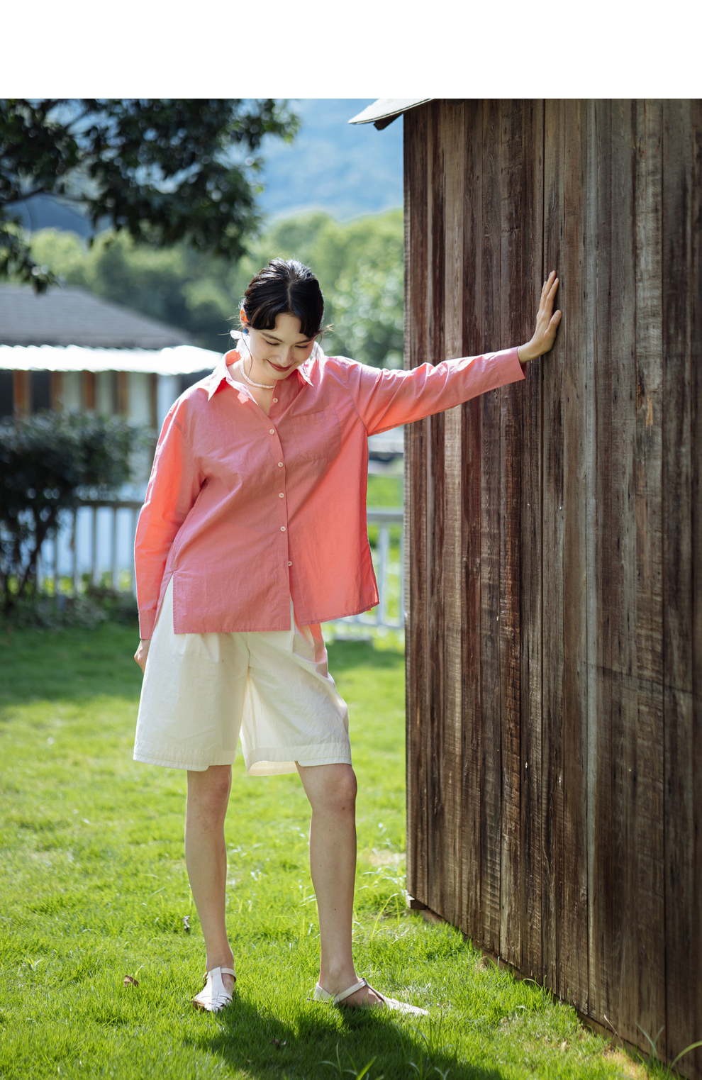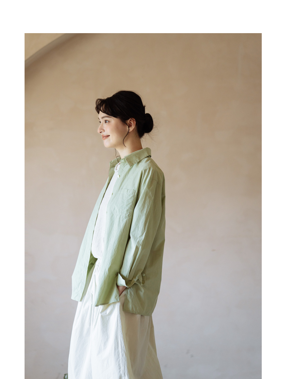 绽放旅行女装403朵/100%汉麻棉侧开衩微落肩套结短款长袖棉麻衬衫