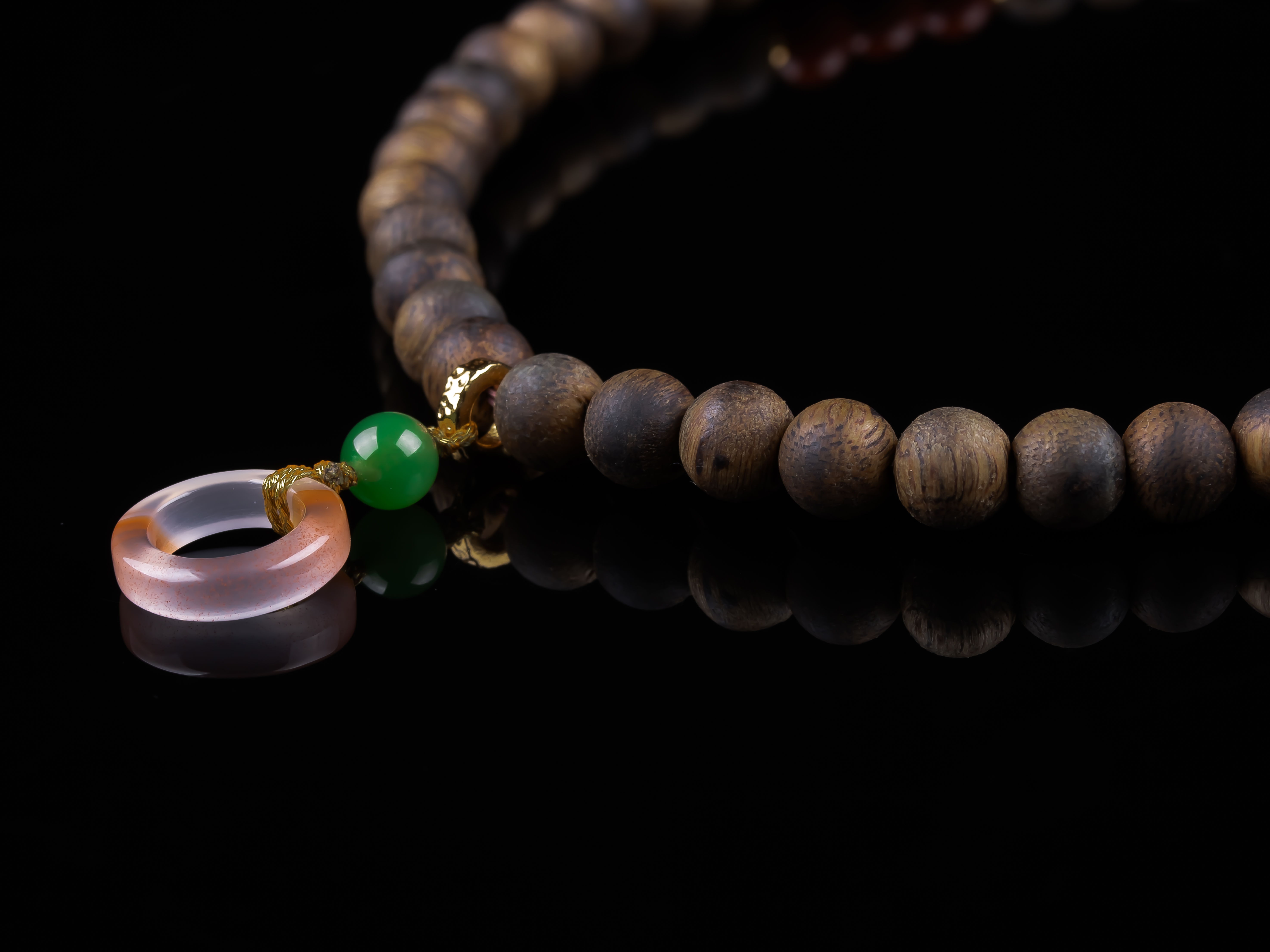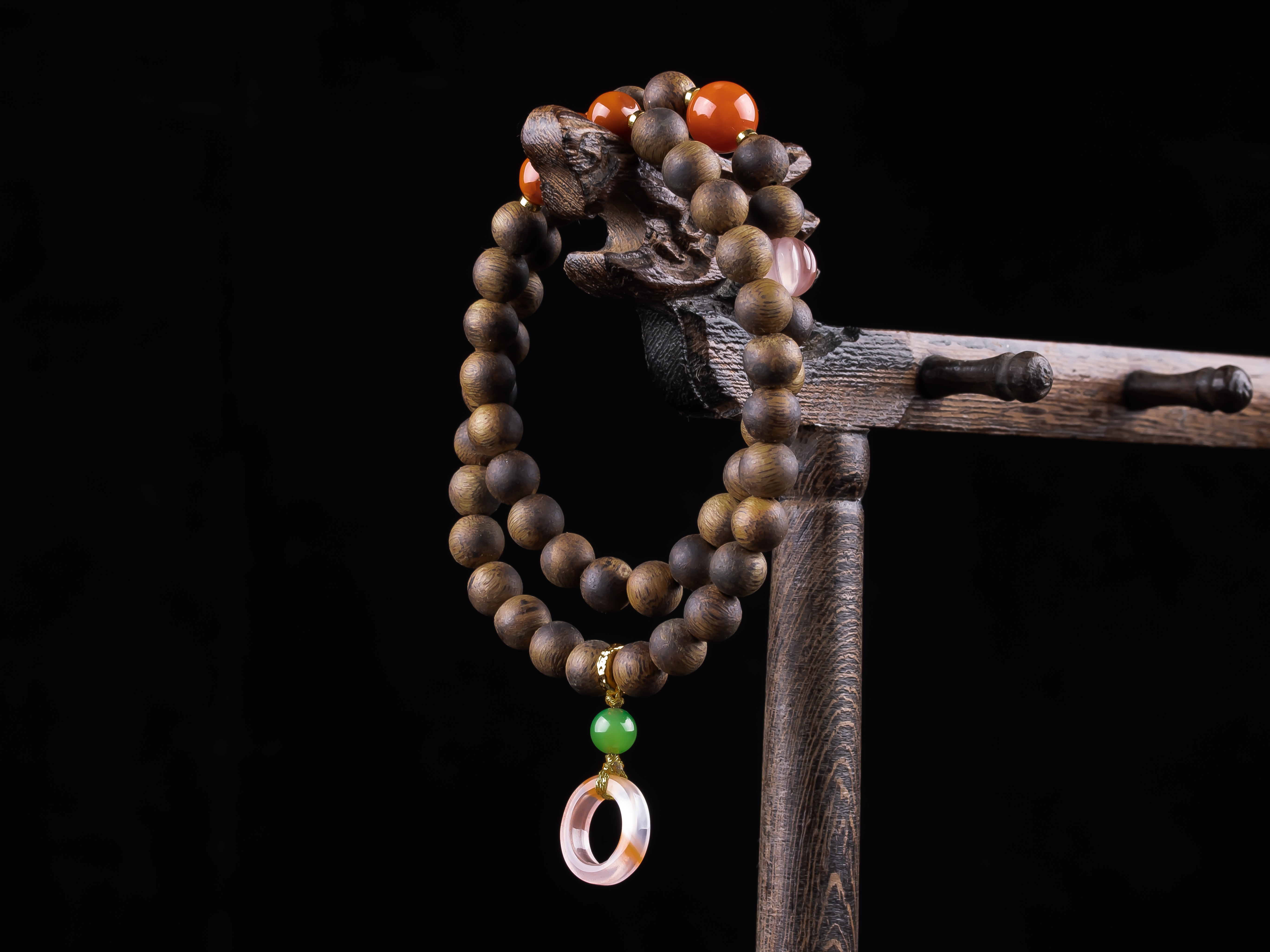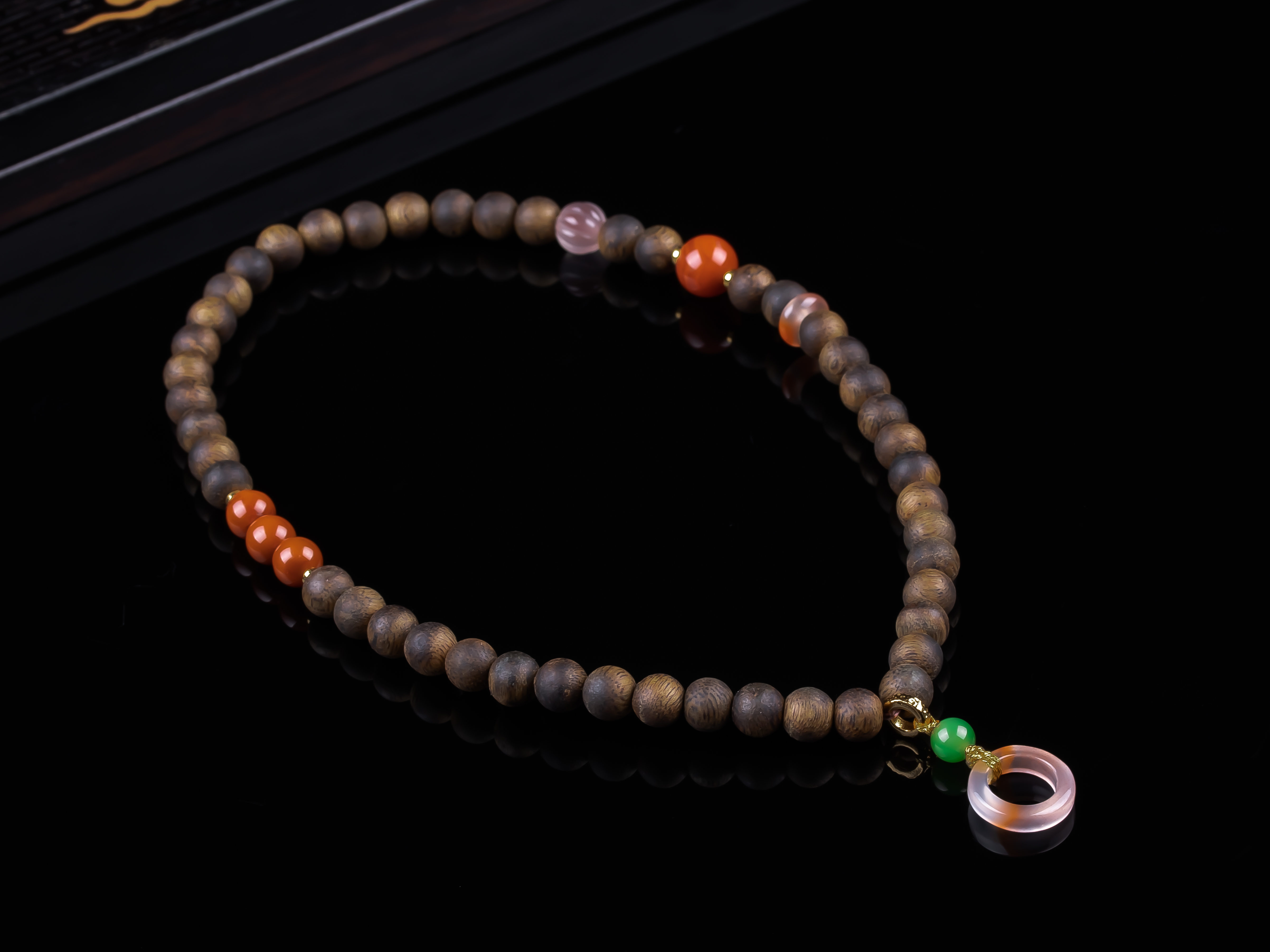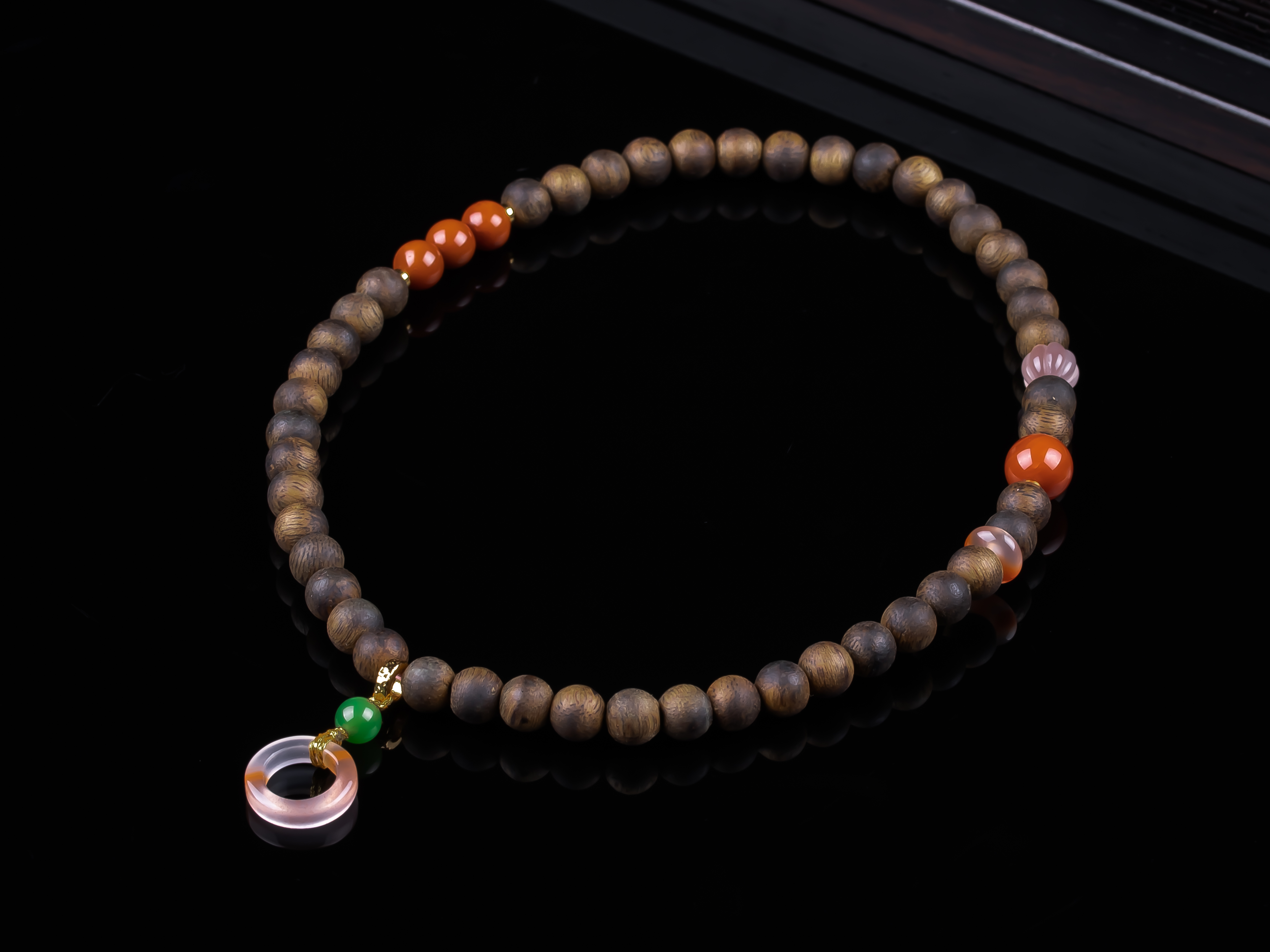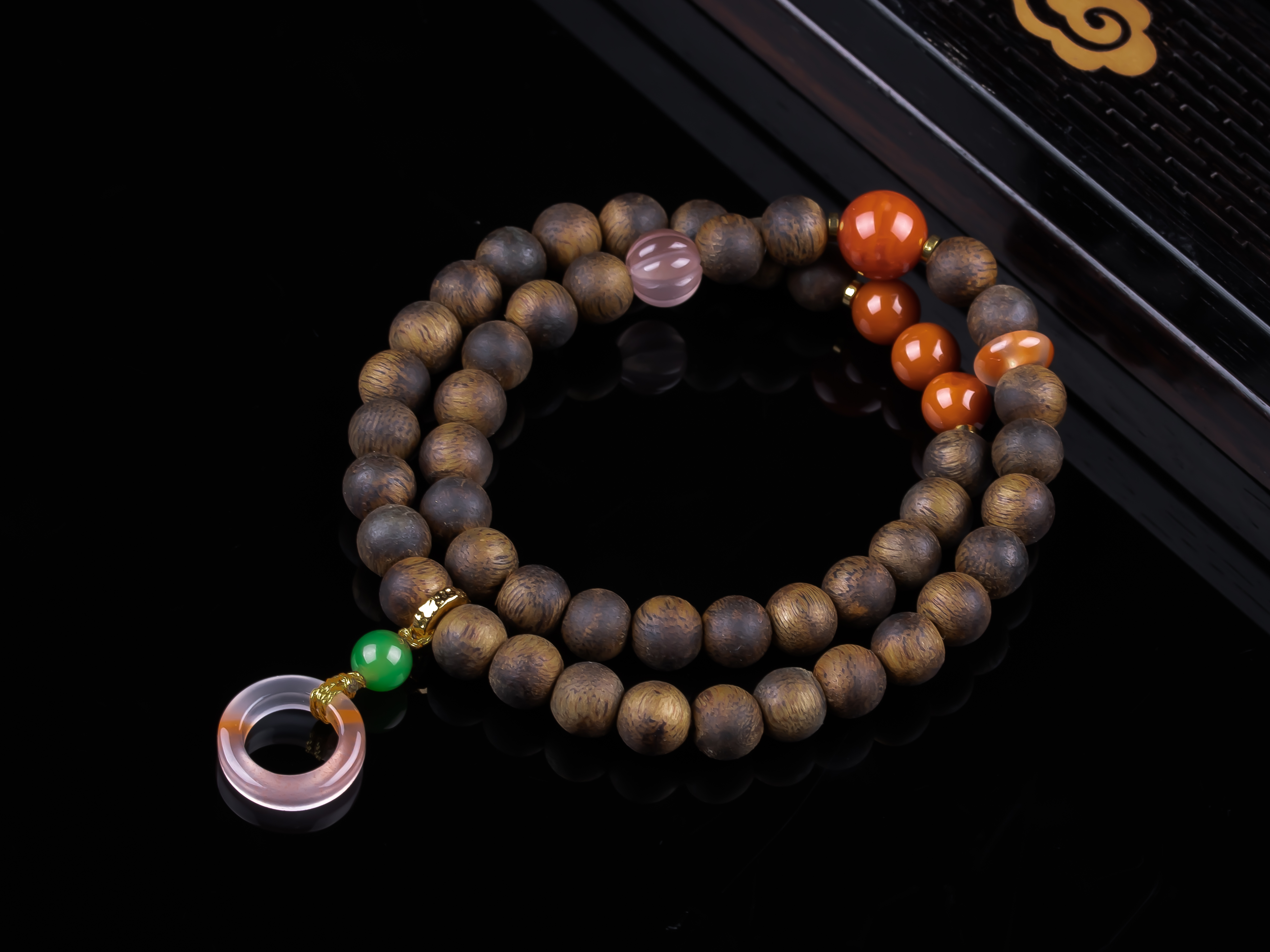 XY0306沉香+南红冰飘跑环坠双圈,天然沉香约7.4mm,原色原味,香味自然清甜,带冰飘南红小坠子的双圈手链,款式独特有个性,同时又保持复古典雅的韵味。