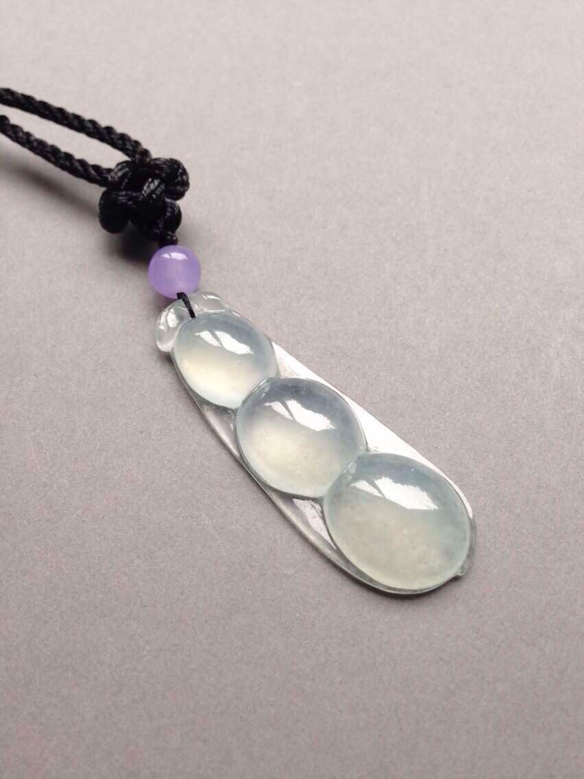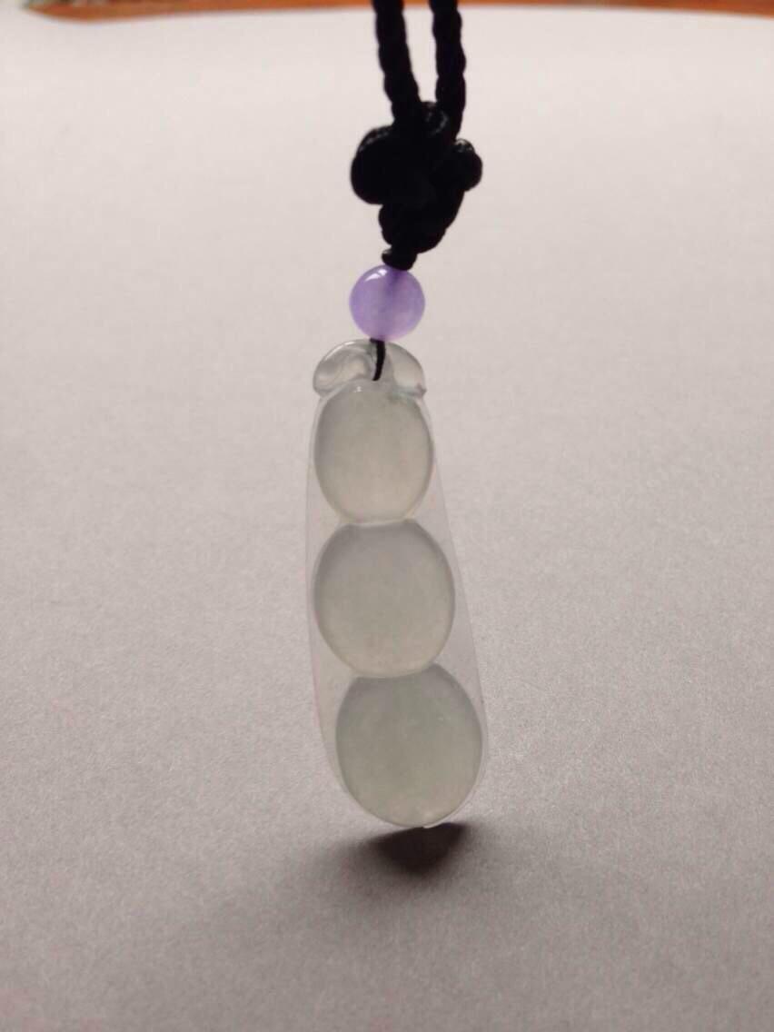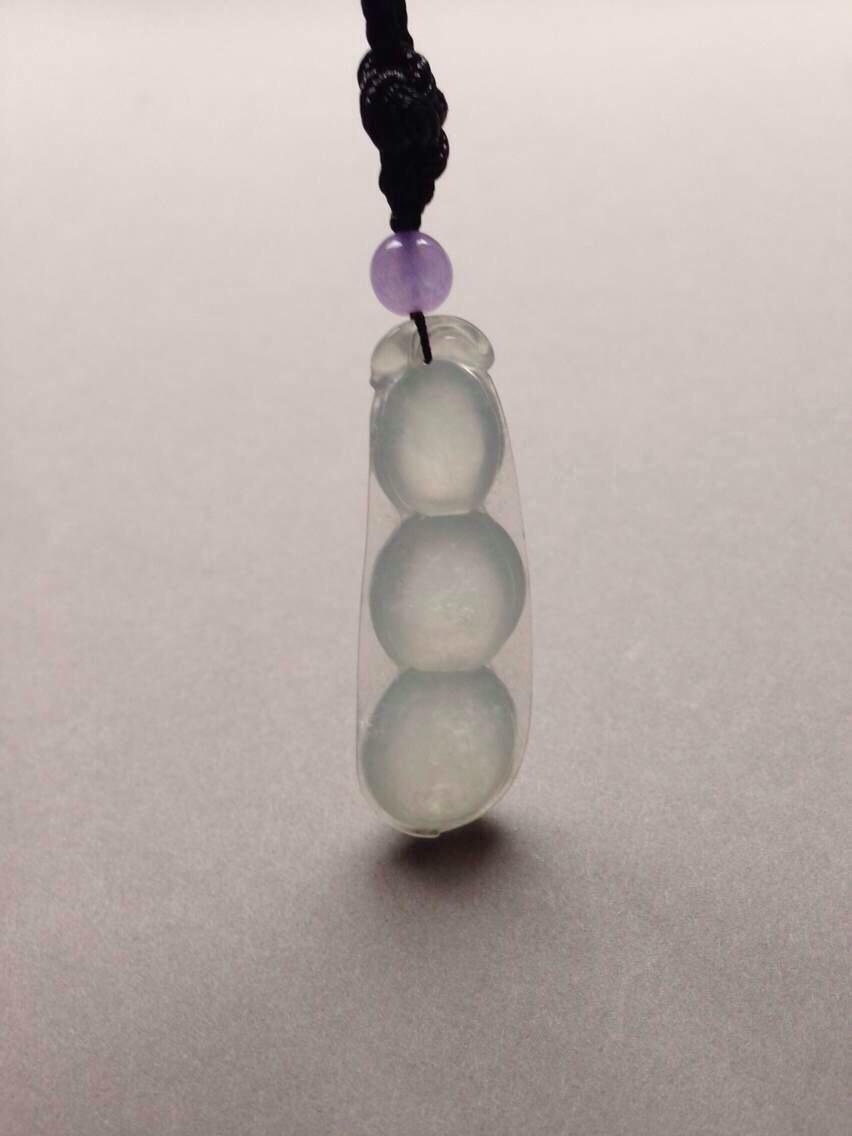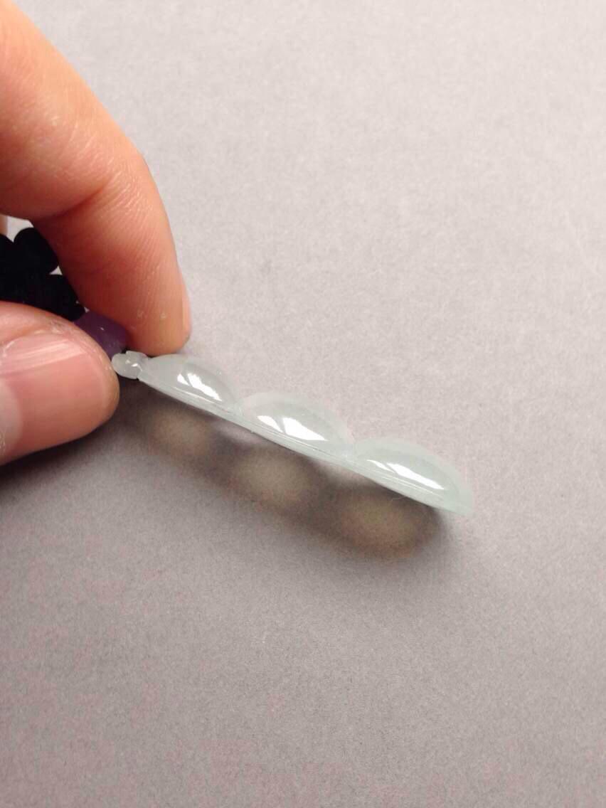 翡翠高冰大豆荚,四季平安,45.1*15.2*6.2mm。种水棒棒哒,种气老,闪荧光,仿佛三个大玻璃蛋一样,长度好大,佩戴有气场强烈,推荐,不可多得的大豆子