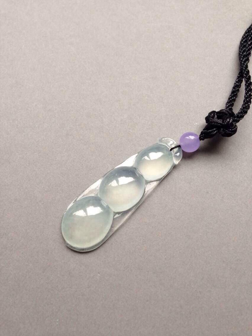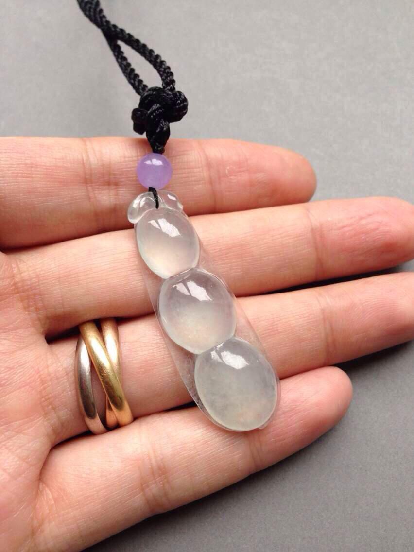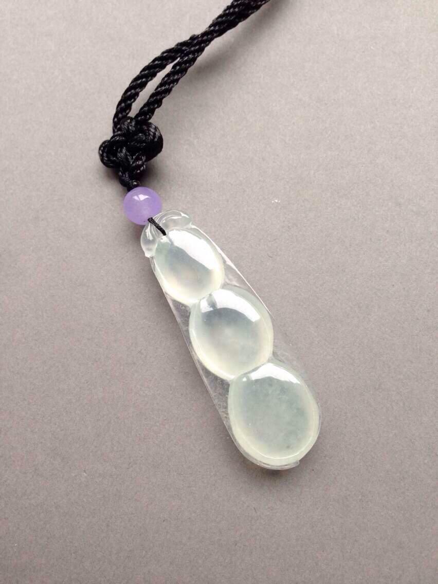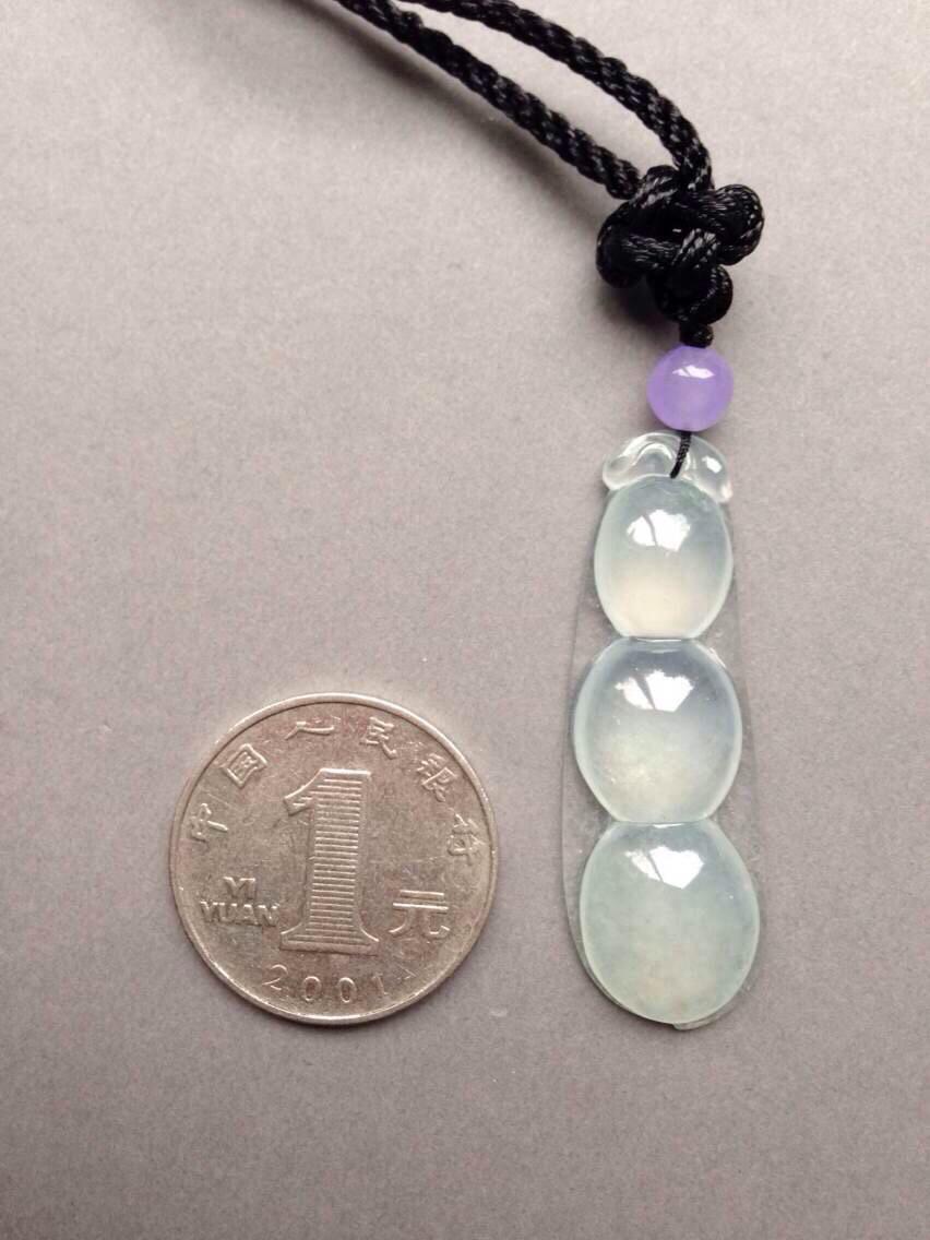 翡翠高冰大豆荚,四季平安,45.1*15.2*6.2mm。种水棒棒哒,种气老,闪荧光,仿佛三个大玻璃蛋一样,长度好大,佩戴有气场强烈,推荐,不可多得的大豆子