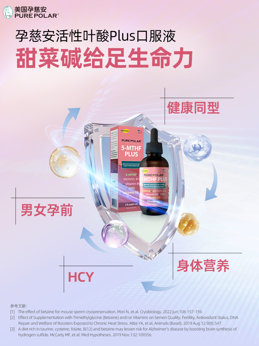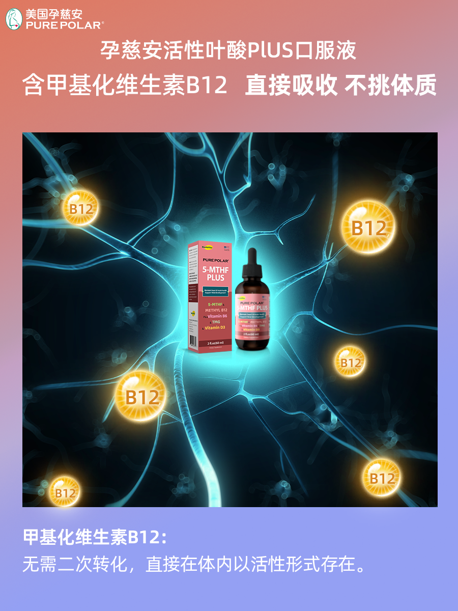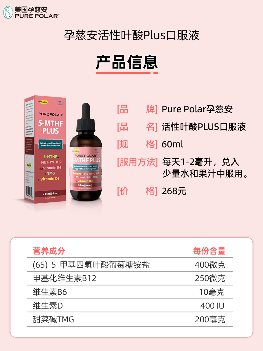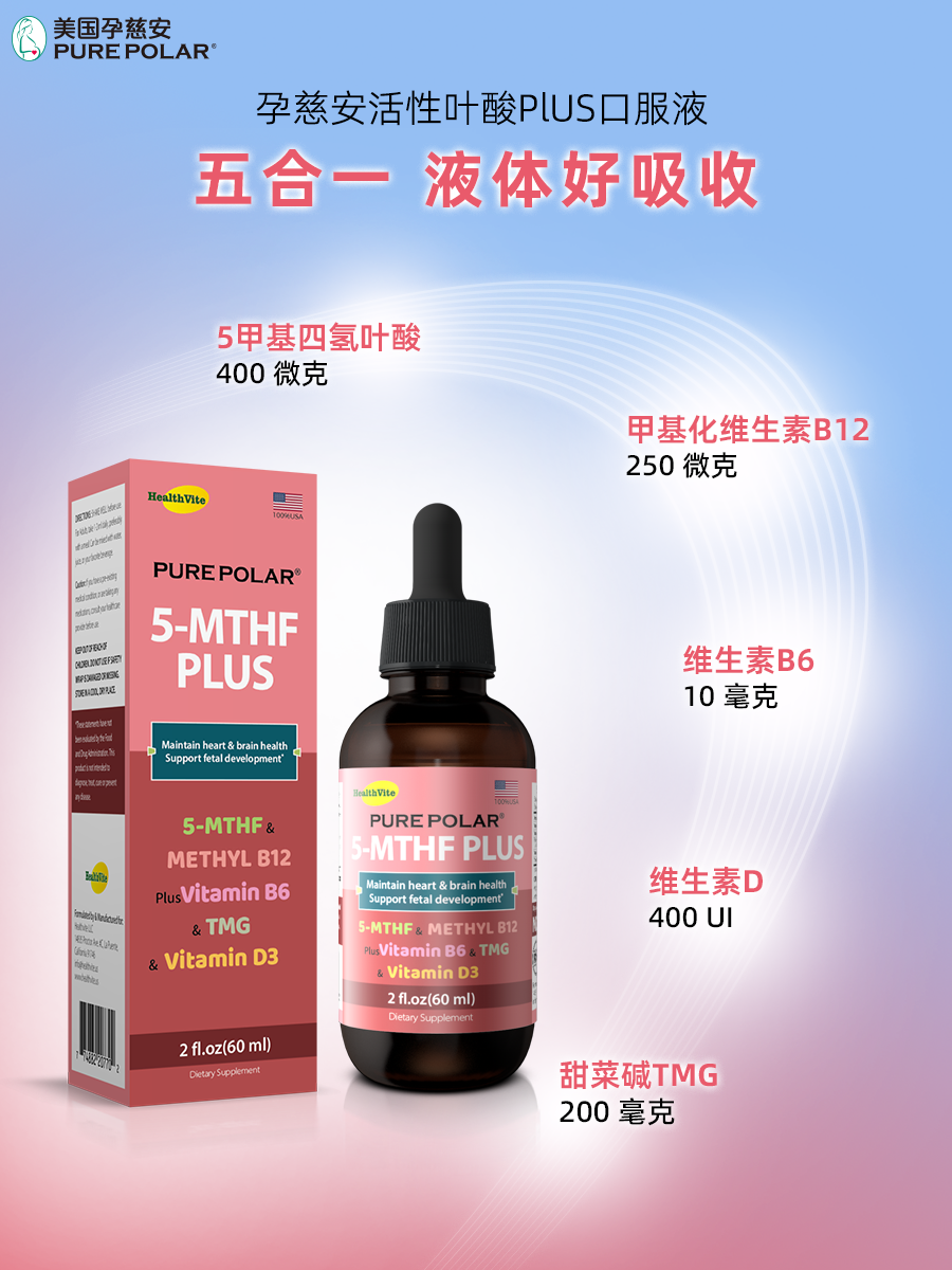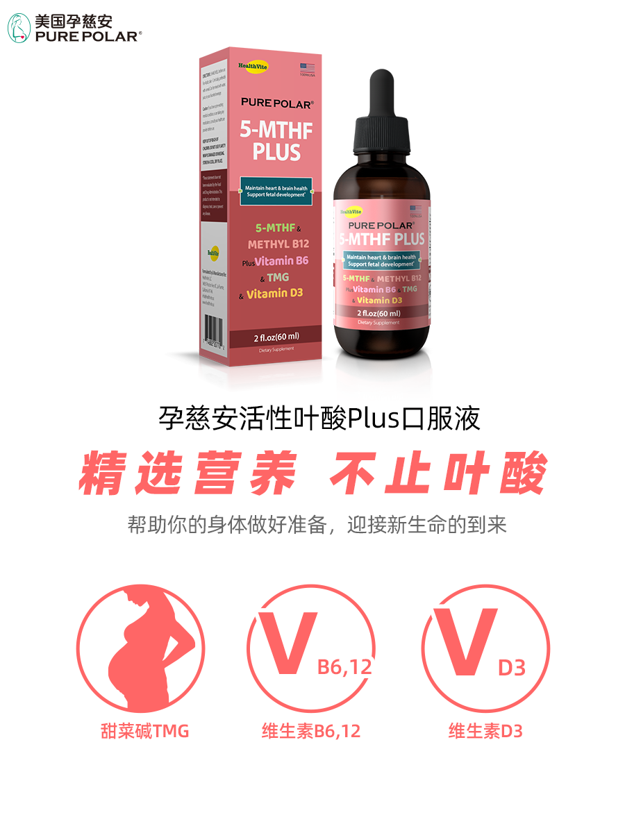 孕慈安活性叶酸Plus口服液含维生素B6B12甜菜碱美国进口pure polar