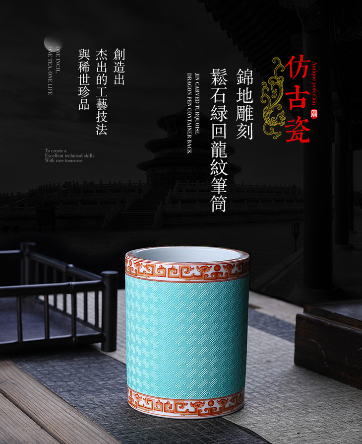 宝瓷林锦地雕刻松石绿回龙纹笔筒 商品图1