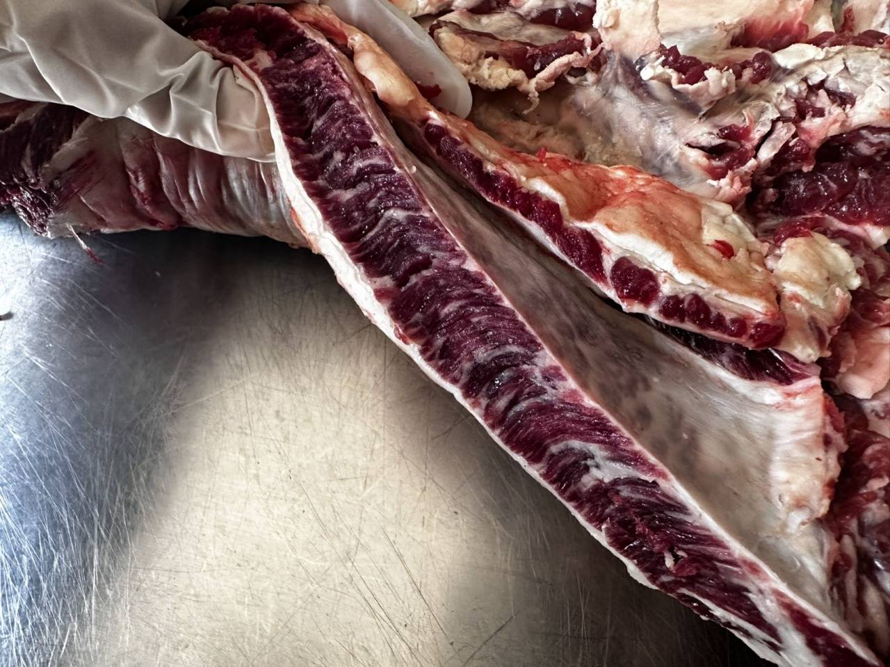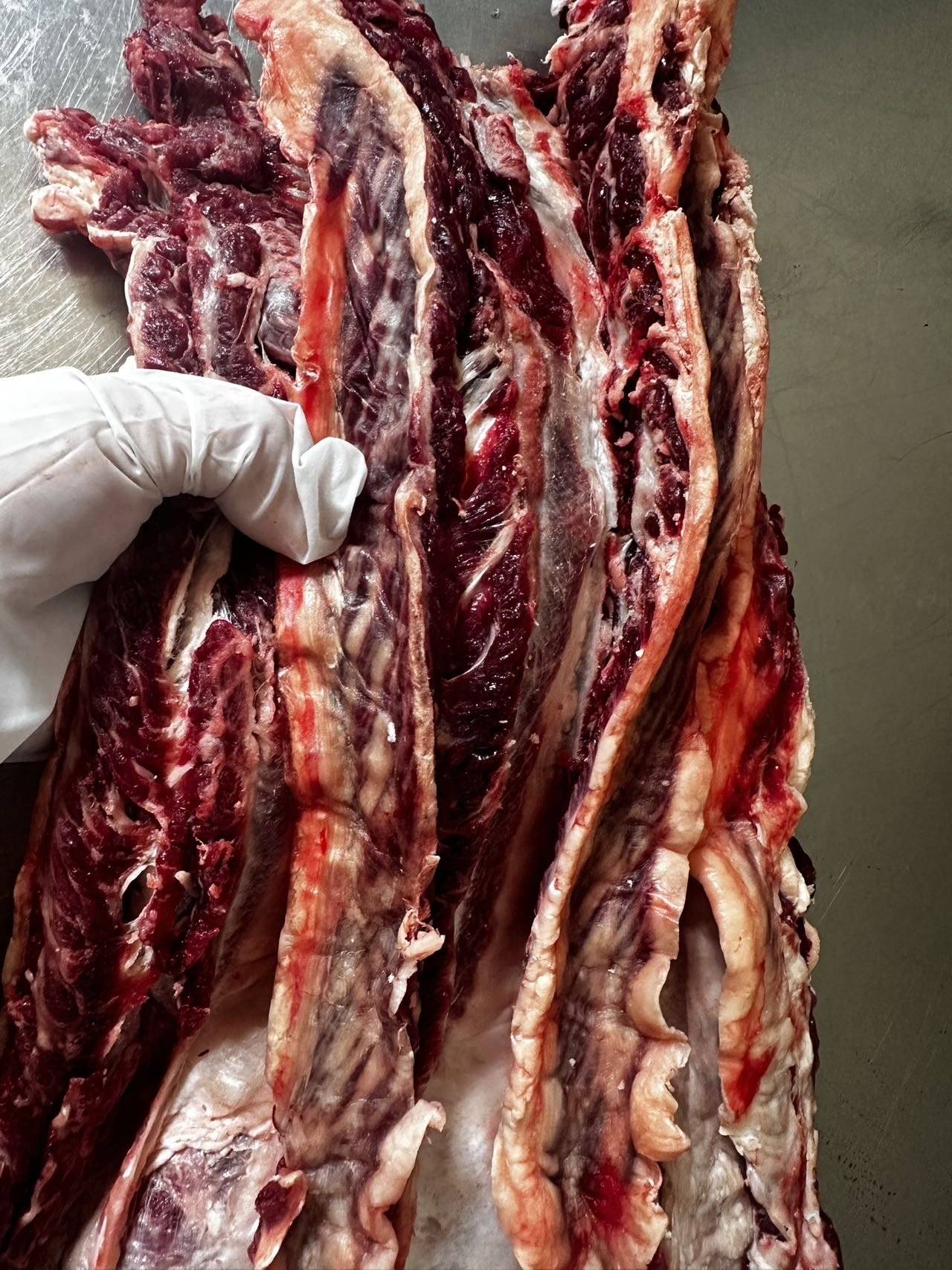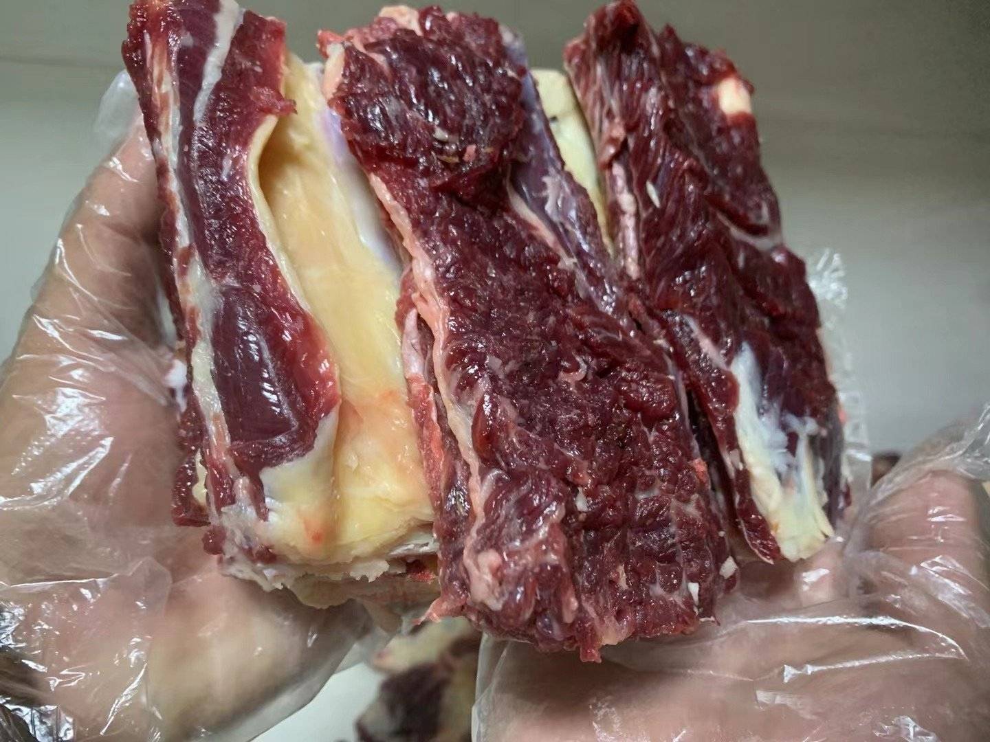 ❹草饲牛肋排 这牛肋排,看这成色就知道它一定是纯草饲的,黄金膘肉呈紫色;看看这干爽度,一定是没注水,品质牛!