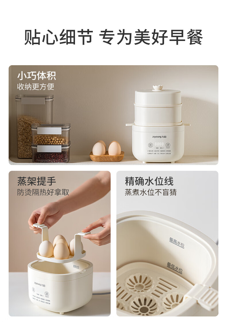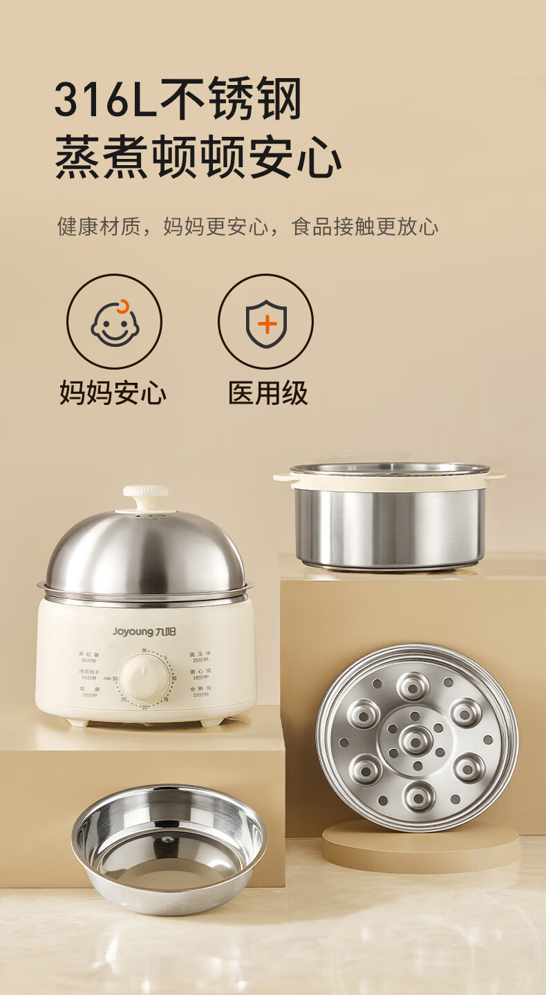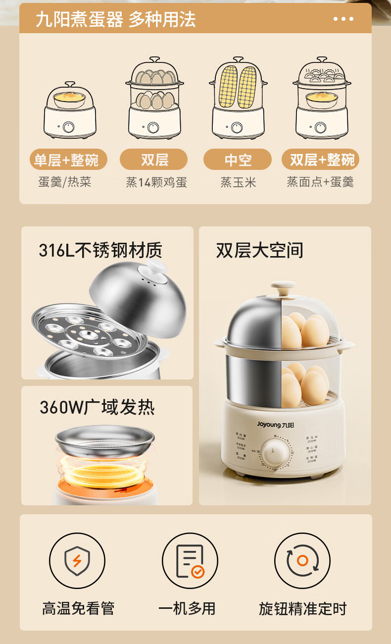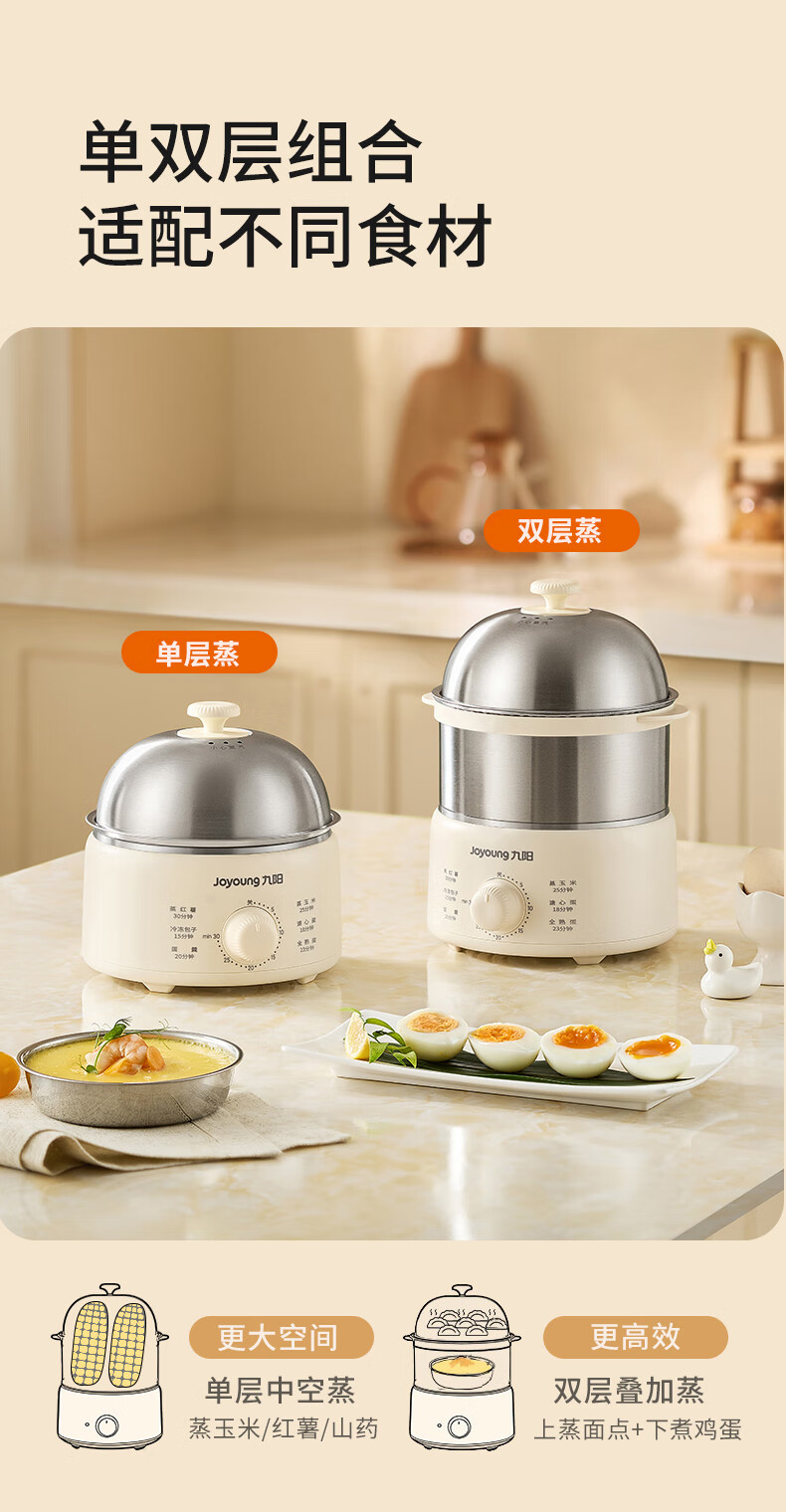 九阳煮蛋器不锈钢双层蒸蛋器定时多功能家用小型电蒸锅蛋羹早餐机