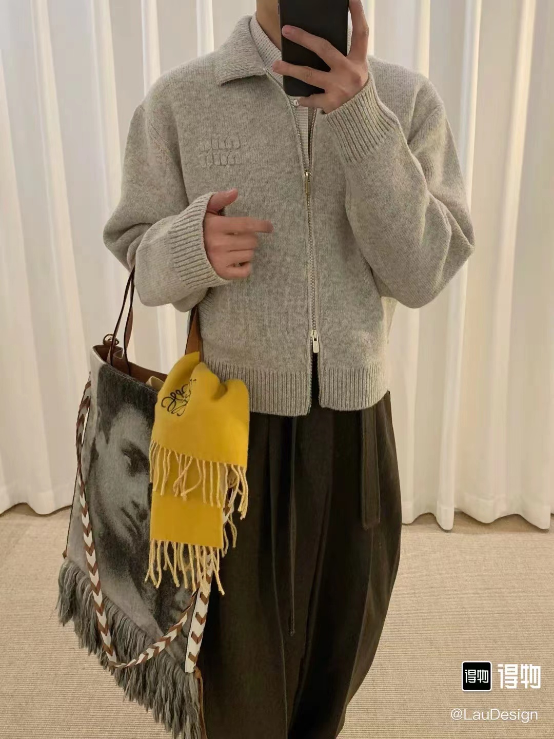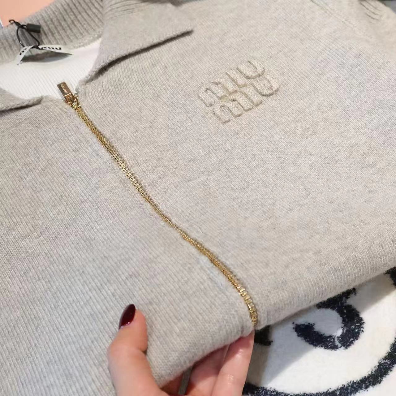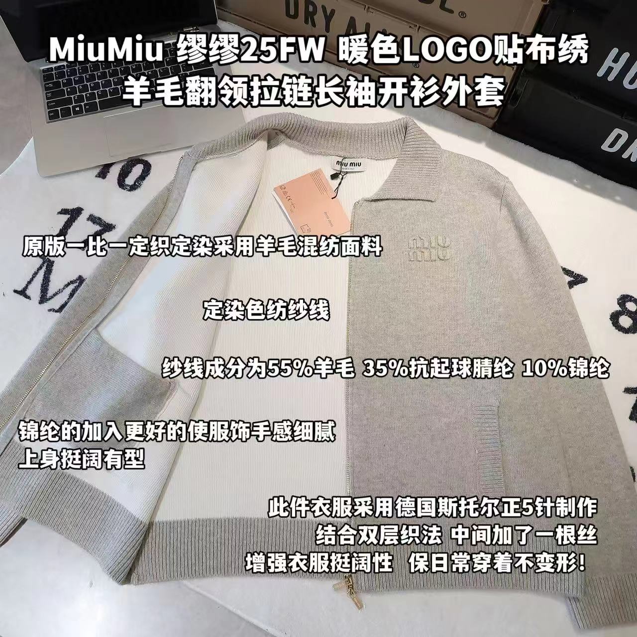 -面料:原版一比一定织定染采用羊毛混纺面料。定染色纺纱线,色纺纱起定量非常大纱线成分为55%羊毛,35%抗起球腈纶,10%锦纶。锦纶的加入更好的使服饰手感细腻,上身挺阔有型。