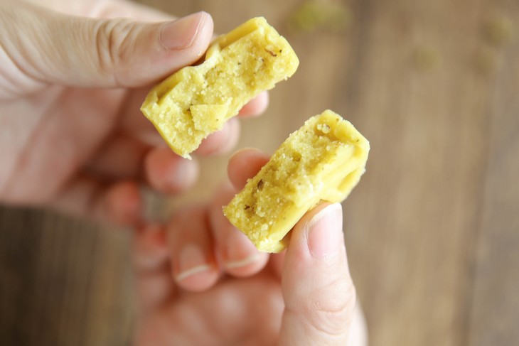 再与海藻糖一起翻炒至抱团,入模具按压,一颗颗饱满的绿豆就变成了一块块细腻顺滑的绿豆糕。