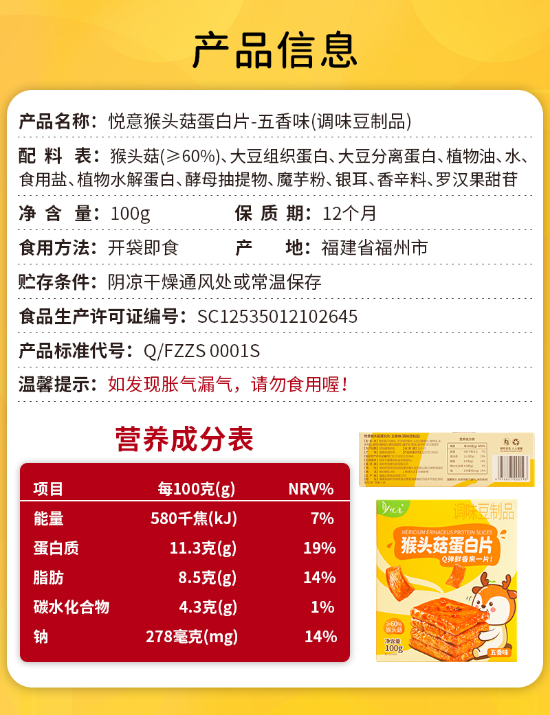 悦意猴头菇蛋白片-五香味B100g*3【产地直发】@szyy