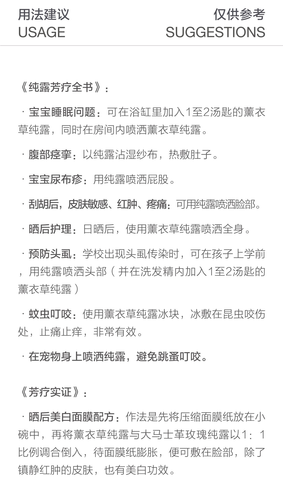 日常可以用来做水膜,能很好的镇静皮肤,帮助收敛和修复,尤其是湿疹、痤疮、红斑、晒伤和瘙痒症,效果卓越,无论是脸部还是身体,都可以加入油浴队伍;如果做日常喷雾,可以根据需要混合玫瑰露、永久花露或檀香露,再加1/10的玫瑰果油,既保湿滋润,又能亮白修复;香薰就更不用多说了,没有比薰衣草更适合睡前闻闻,还可以加玫瑰和香蜂草一起,更香甜!喝喝也是,很推荐搭配香蜂草和玫瑰精露,可以各来10ml,再加入300ml的温水,缓解压力,也能很好的助眠,长期坚持,好处多多!