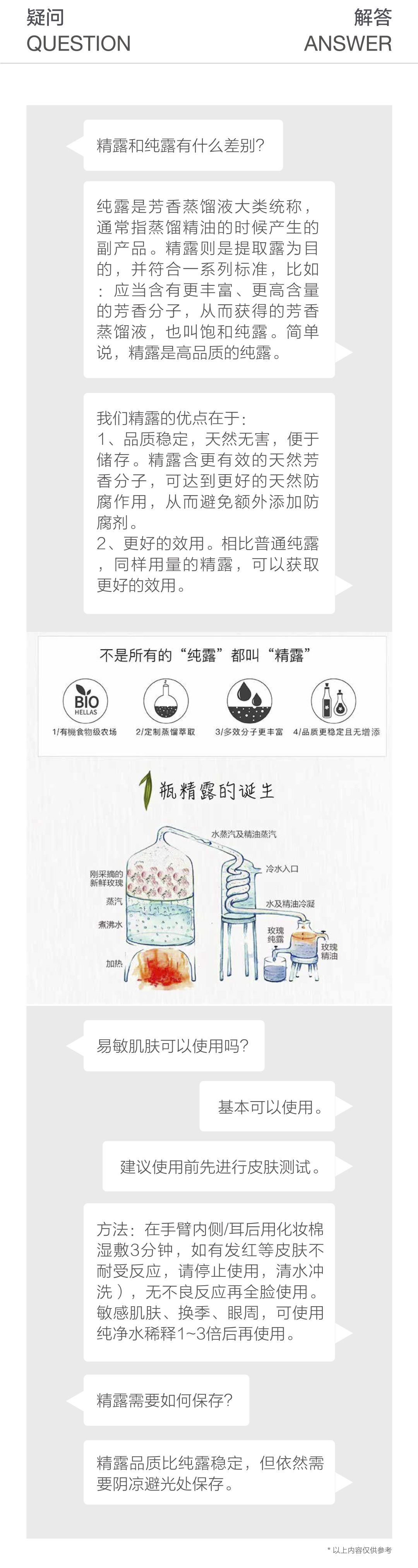 AyuSkAma的精露,真的太厉害!必入!所谓精露,就是以提取露为目的,并且符合一系列标准,比如:应当含有更丰富、更高含量的芳香分子,从而获得的芳香蒸馏液,也叫饱和纯露。简单说,可以理解为,精露是更高品质的纯露,因为本身含有天然芳香分子可达到更好的活性防腐,从而避免添加其它防腐剂、酒精等添加剂,品质稳定,也更容易储存。相比普通纯露,精露的用量较小,减轻使用者的各种负担,同时有更好的效用。AyuSkAma的精露都是采用德国先进蒸馏设备,由蒸馏大师把控蒸馏细节,采用天然矿泉水和植物原料萃取蒸馏而成。