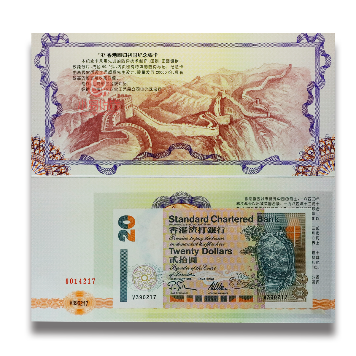 包含一张香港渣打银行发行的面值20元纸币,并赠送一枚999足银纪念卡(约2-3克),卡面图案为香港尖沙咀钟楼与港岛风光,线条清晰,浮雕立体,具有很高的收藏与鉴赏价值。