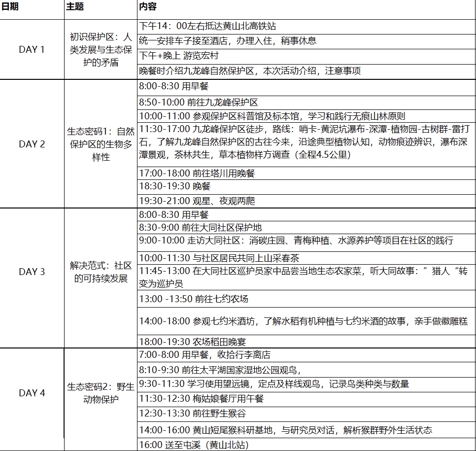 本次我们联合黄山绿满江淮自然保护中心,通过可持续的生态旅行方式让更多人了解生物多样性保护、自然守护者的工作、与周边社区共生共赢的探索。