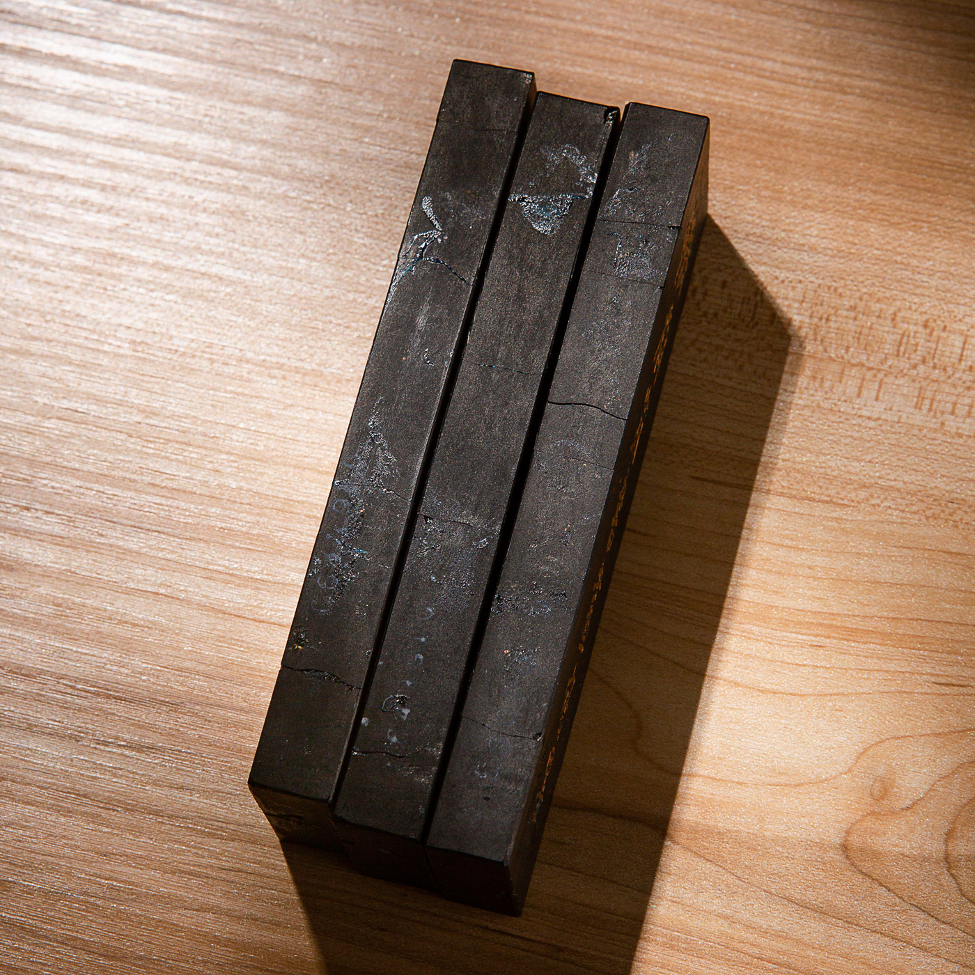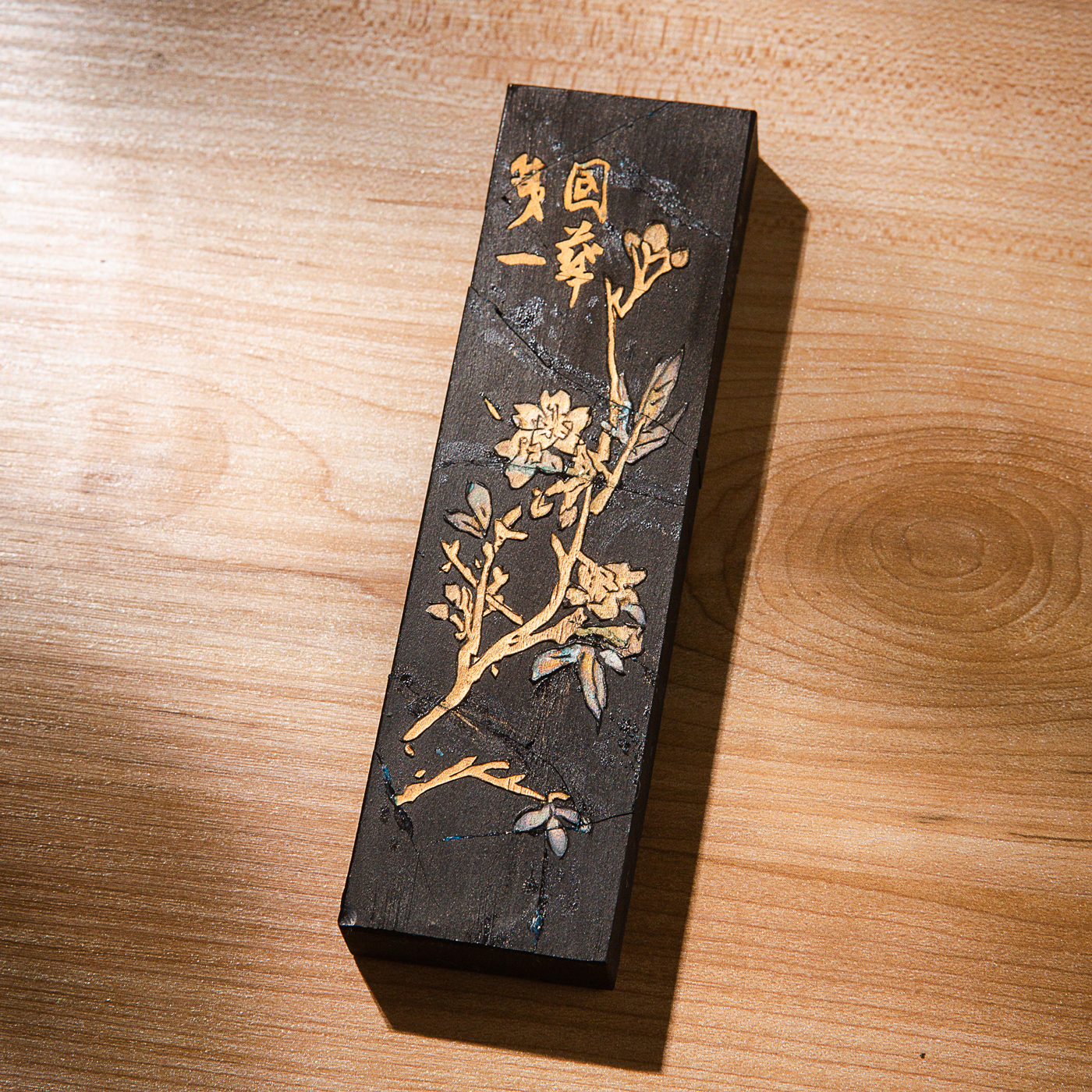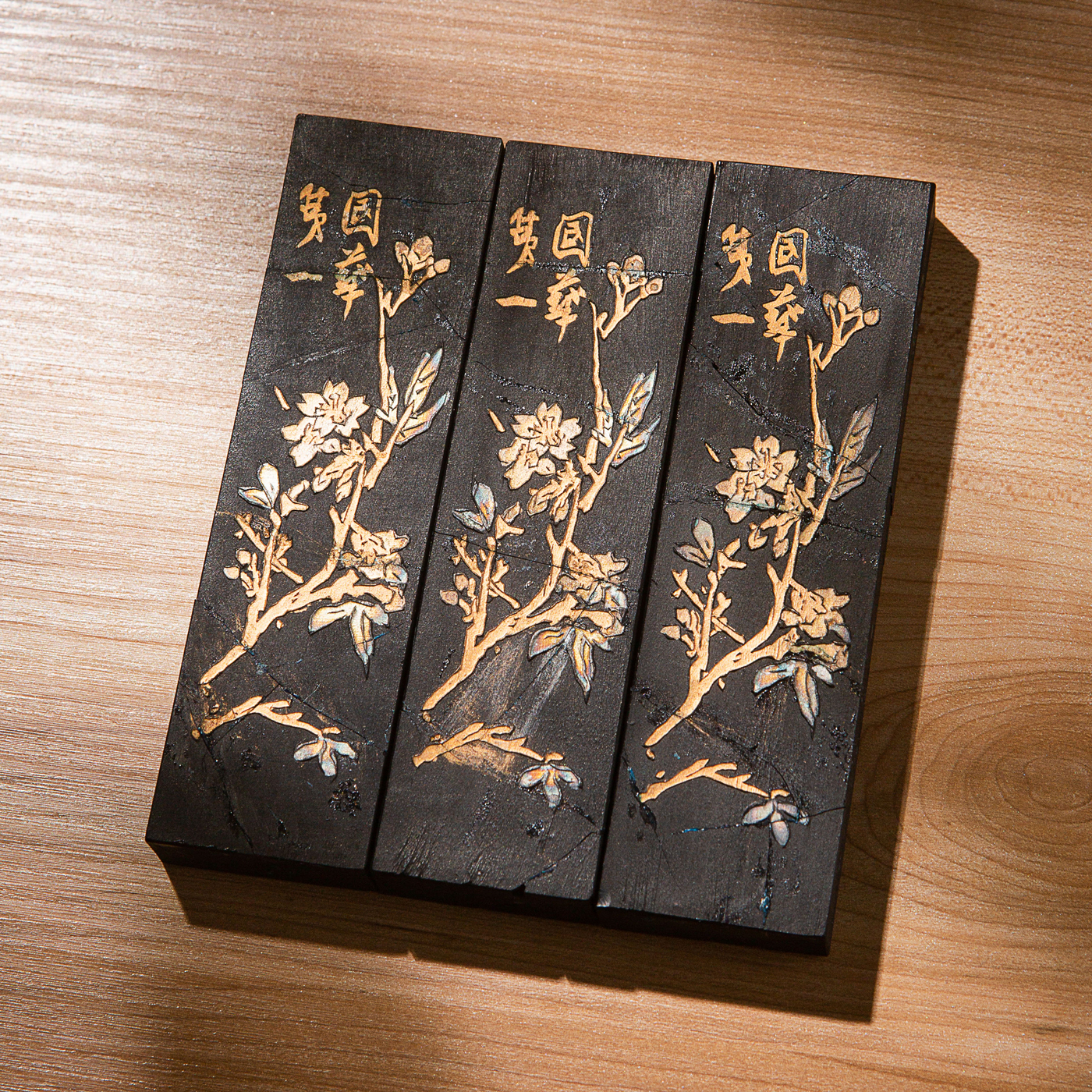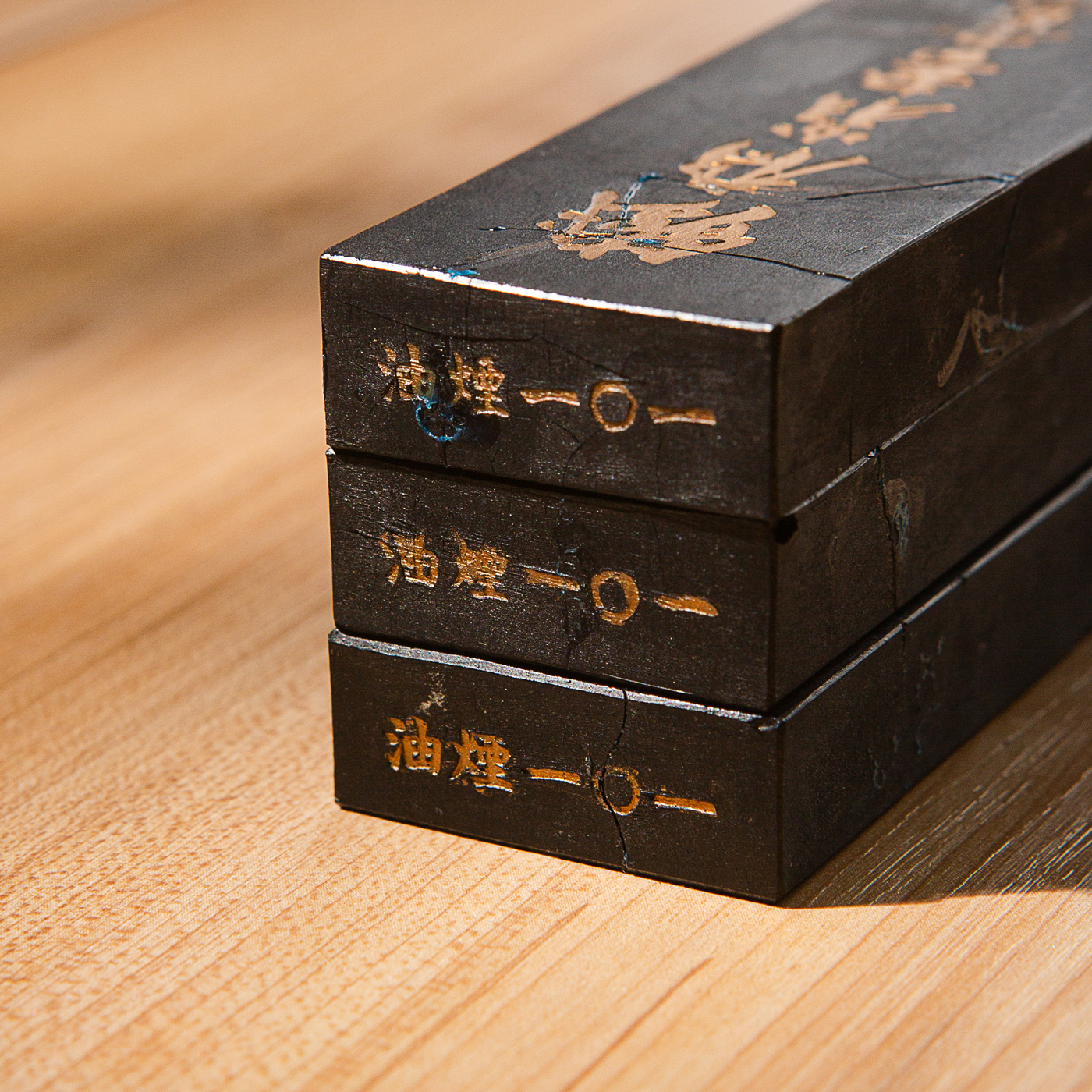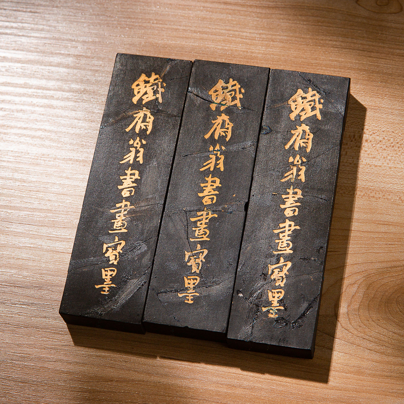 80年代上海墨厂制“铁斋翁书画宝墨”,每锭略有瑕疵,重二两,油烟101材质,用料精细,雕版精美,墨色油亮,胶性轻顺,是难得之佳品。