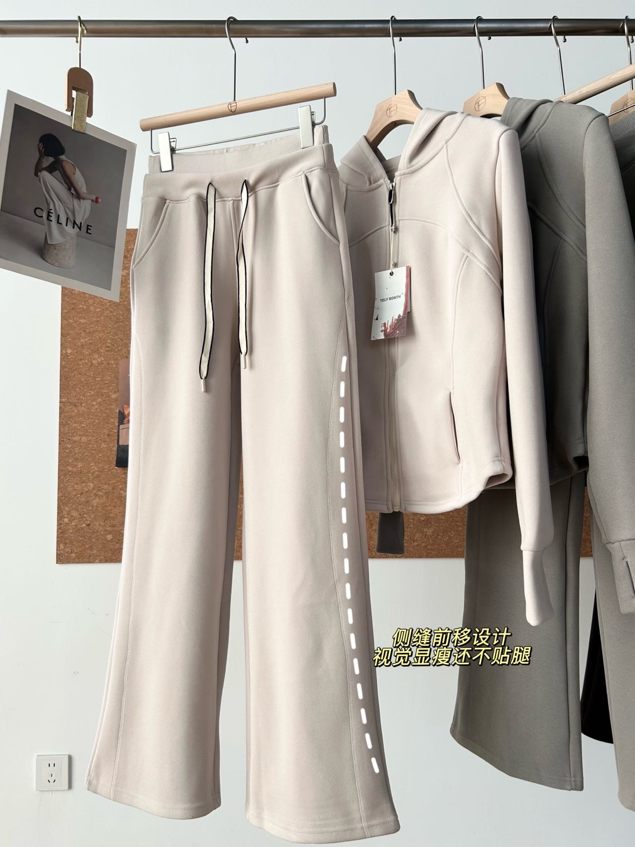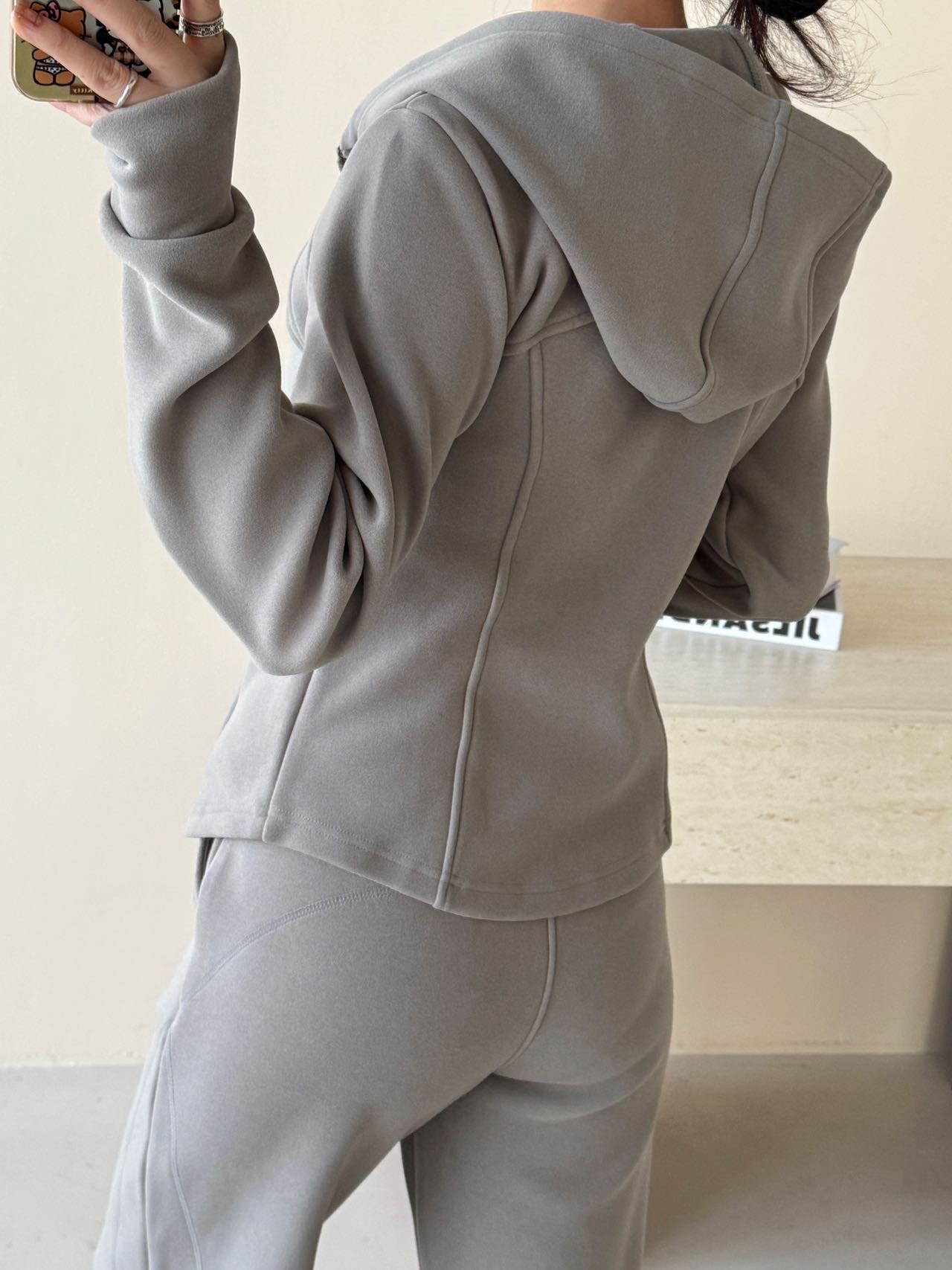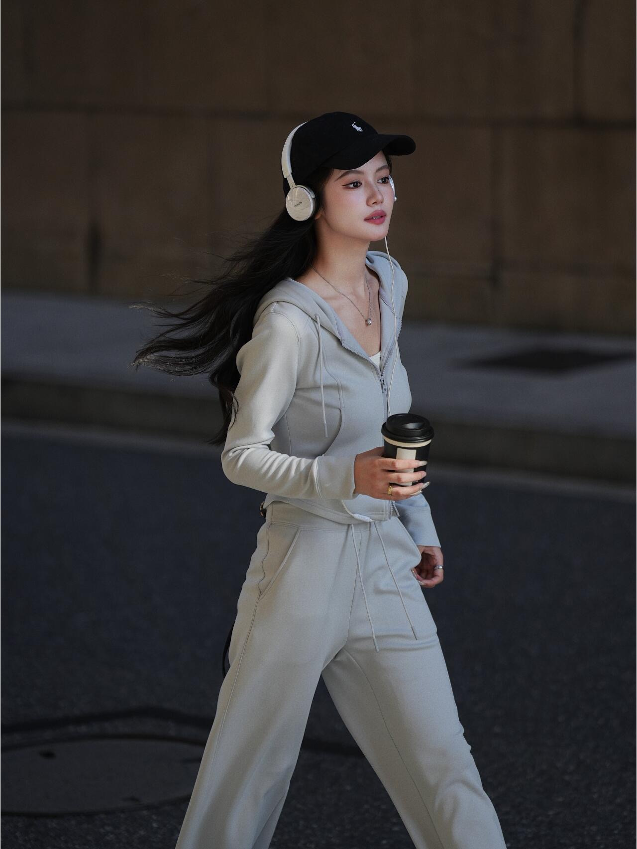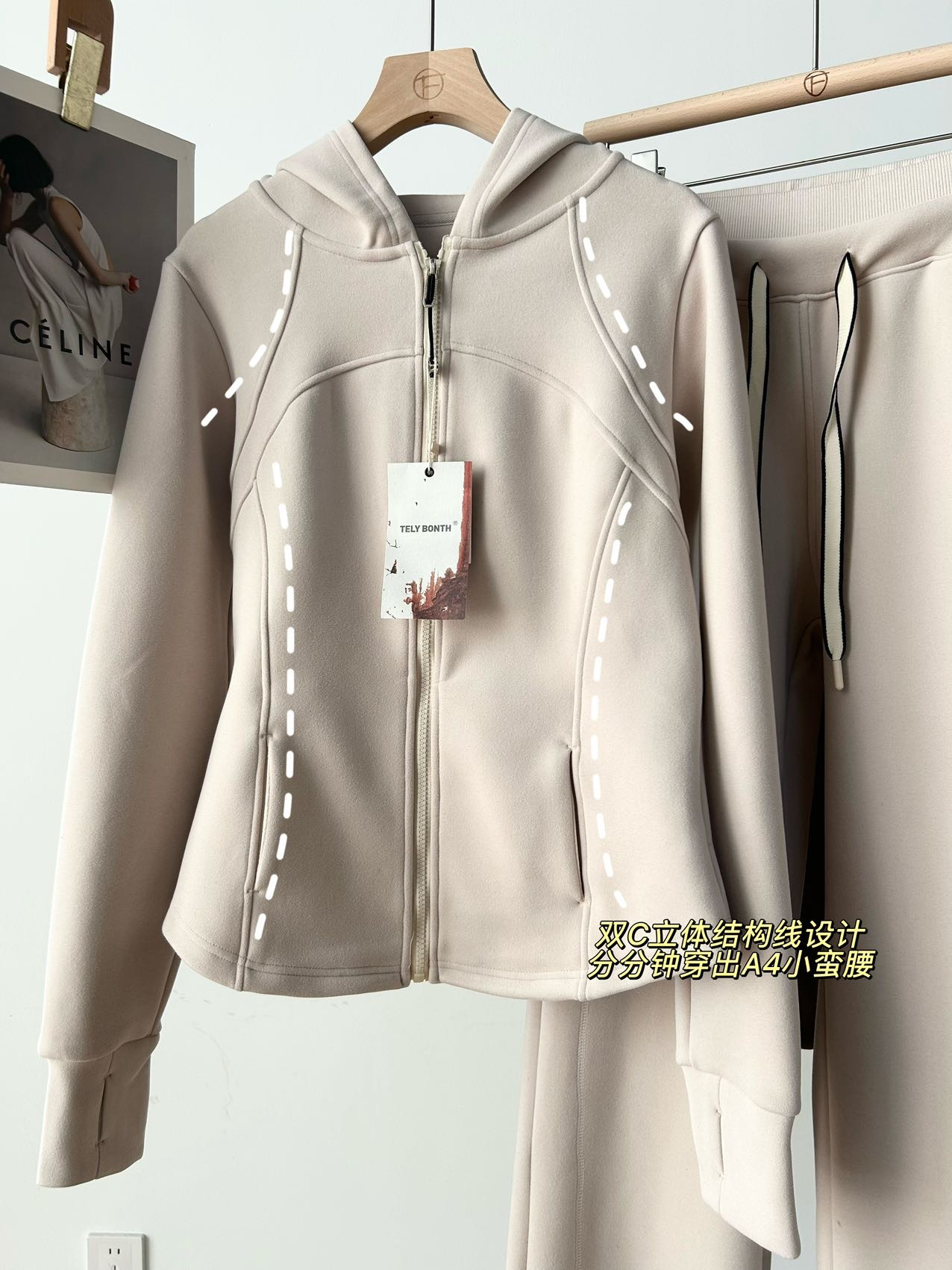 上衣双侧立体鱼骨线,掐腰显瘦显腿长。