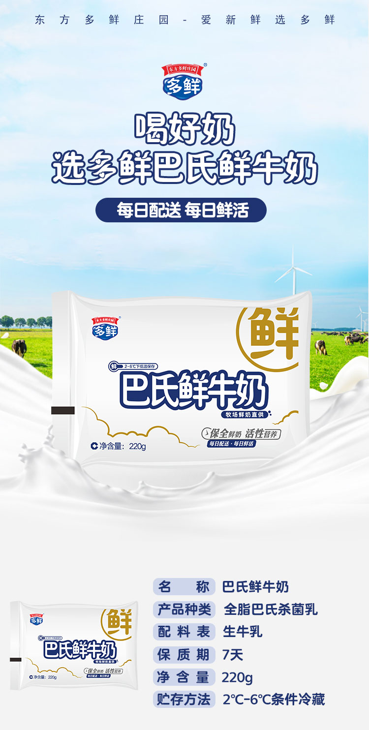【特别推荐】多鲜巴氏鲜牛奶袋装220g (月套餐 每日配送)-外埠