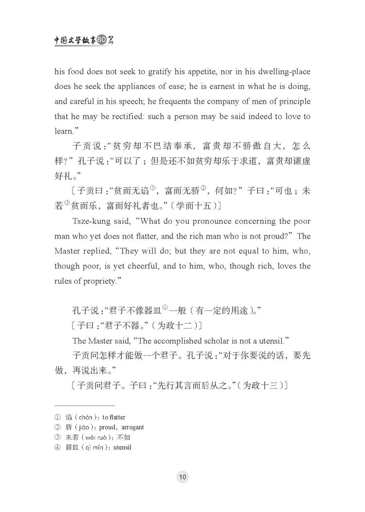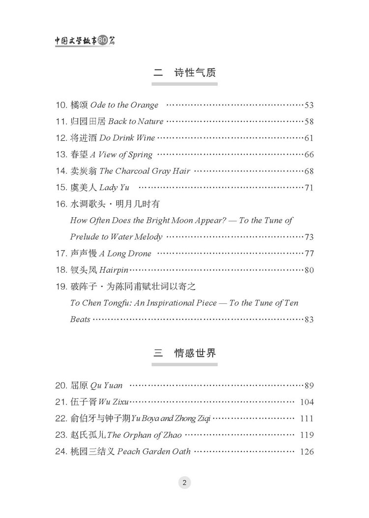 《中国文学故事80篇》的目标读者是已经具有一定词汇量的汉语学习者,为便于学习和阅读,除经典语录选段和古典诗词、现代诗歌附有英译文外,其他大部分作品,均以原作为底本进行了程度不同的简写,避免因生词、知识点过多而影响阅读,对于必要的生词和知识点则注以拼音和英文解释。简写力求保持故事、思想的完整性并呈现作家的语言风格。