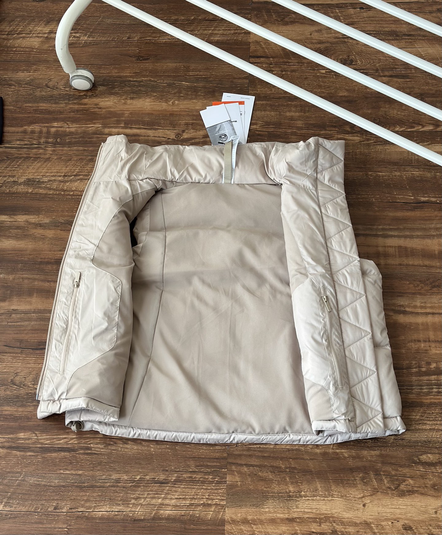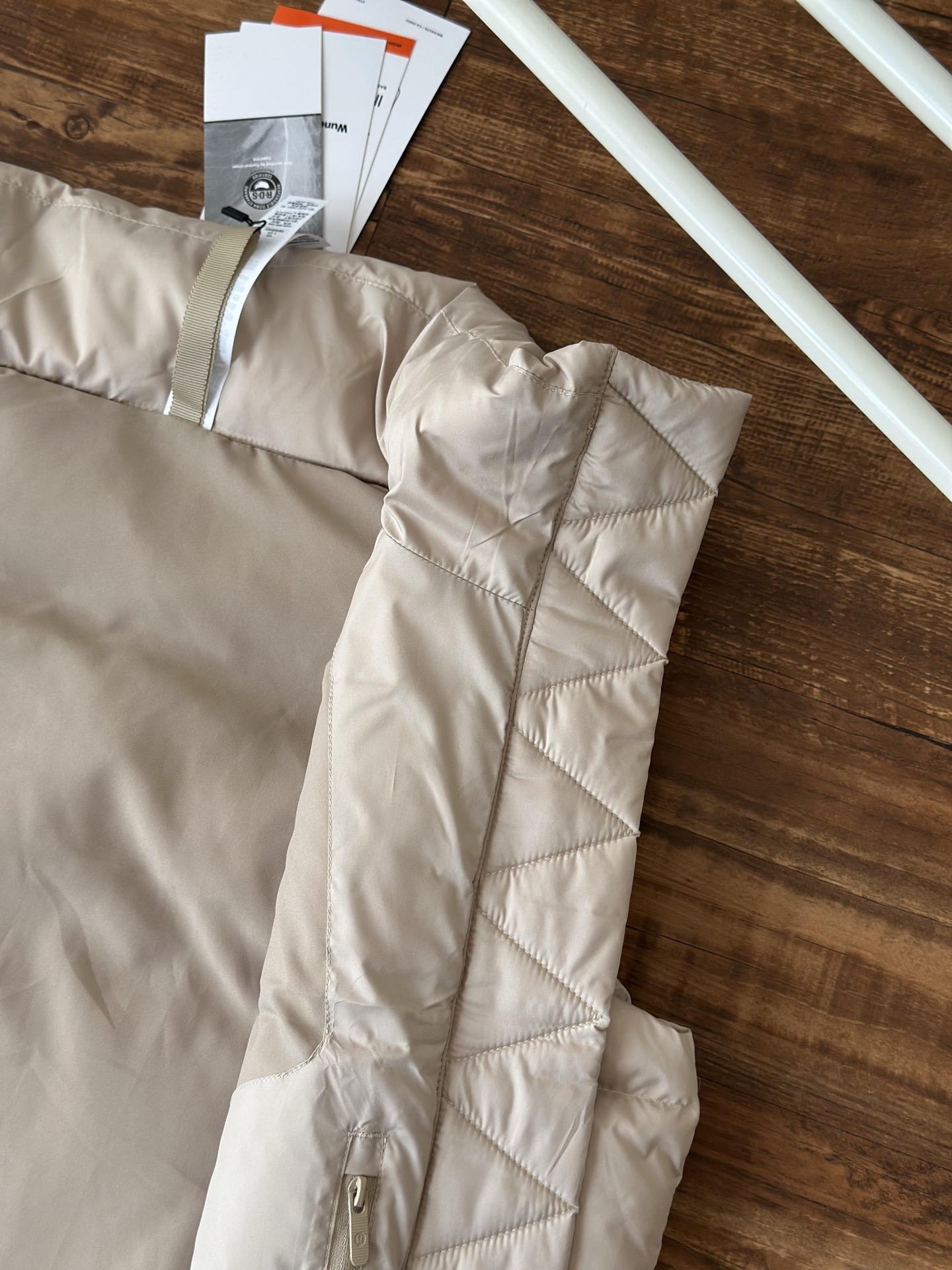 主拉链,两个外插口袋,2个内侧口袋,都带有ykk定制拉链logo专属!全部采用进口YKK拉链,采用的辅料真YKK拉链,两侧口袋拉链设计,口袋里还有隐藏式手机袋,设计贴心!包含腰围与即下摆都可调节松紧效果。整件衣服采用SoftMatte面料可挡风还生活防水效果,都做了三防处理,防油,防污,防水 蓬松感超好,测试蓬松效果充绒量是进口全自动直充,充绒机对比手工充绒精确度到位,充绒量均匀且准确!全自动直充机器充绒,使每件成衣各角度充绒精确无差蓬松效果更是没得说!回放效果非常好!可拆卸优质保温兜帽logo元素采用四合按扣固定并目填充了羽绒,给头部和脖颈周围带来更大的柔软感,不喜欢戴帽子的,可以拆下来直接当羽绒夹克上身,风格多变!门襟部分采用三层防漏风,四合扣采用菱角凹槽扣固定结实!