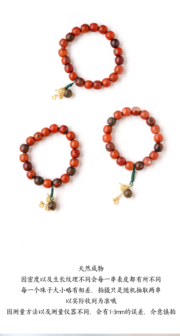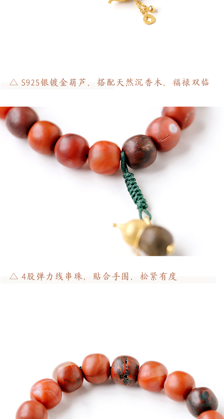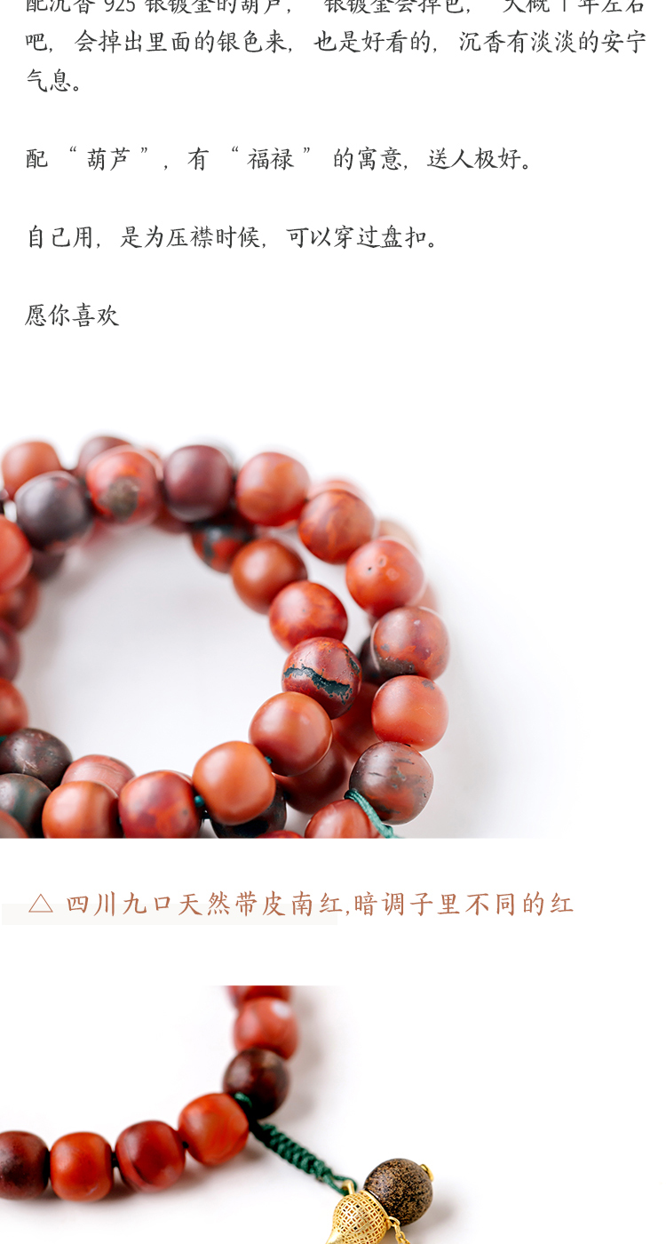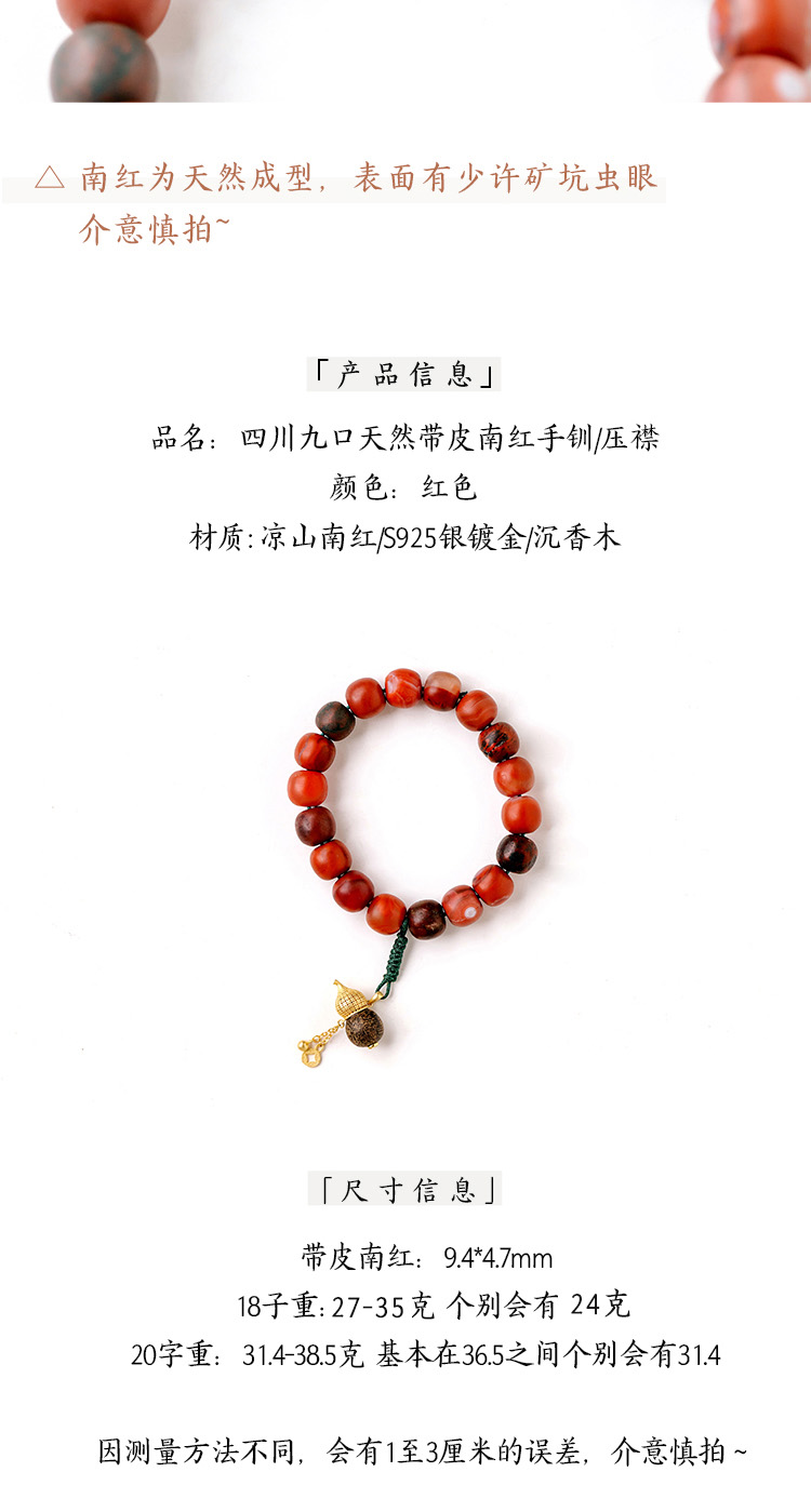 米马生活 四川九口天然带皮南红手钏/压襟 配沉香925银镀金“福禄”
