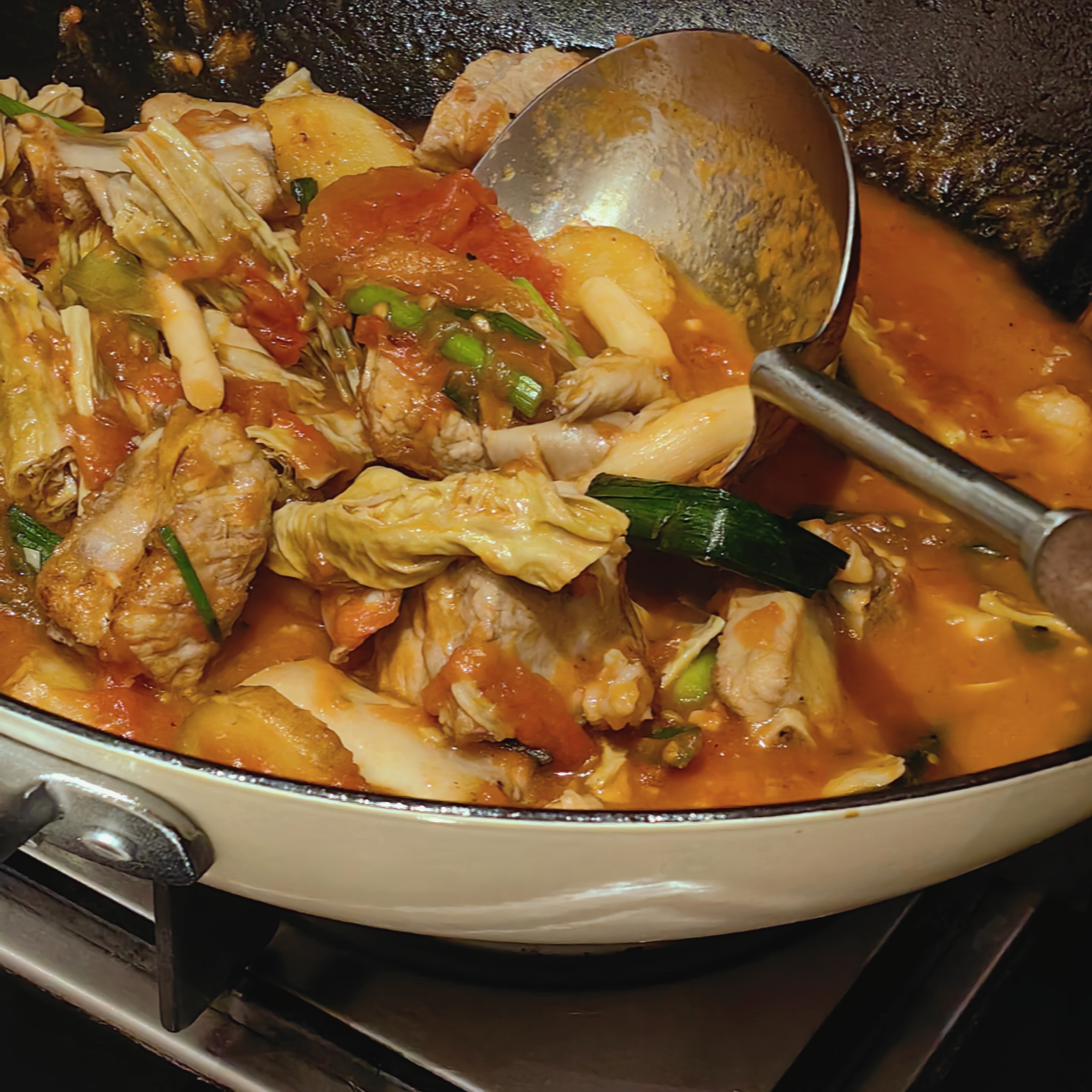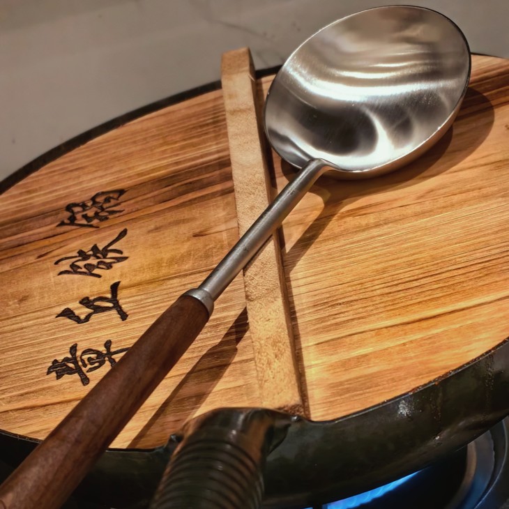 值得一提的是,老饭骨的炒勺在传统基础上进行了改良创新,更大更浅,在颠炒过程中,能有效减少与锅底的撞击,保护炒锅免受损伤。同时,铲把与勺铲夹角的角度优化,使得勾芡、浇汁等技术动作更加得心应手,推勺时省力且易于盘活锅气,让菜肴的香气与味道达到新的高度!加上章丘铁锅,真是做中餐的顶配了,没有涂层,可以潇洒翻飞,锅勺碰撞的热闹,真是硅胶和不粘锅比不了的!而且我发现,长长的勺柄也确实更适合热炒,老祖宗绝对是有被油溅到过手!