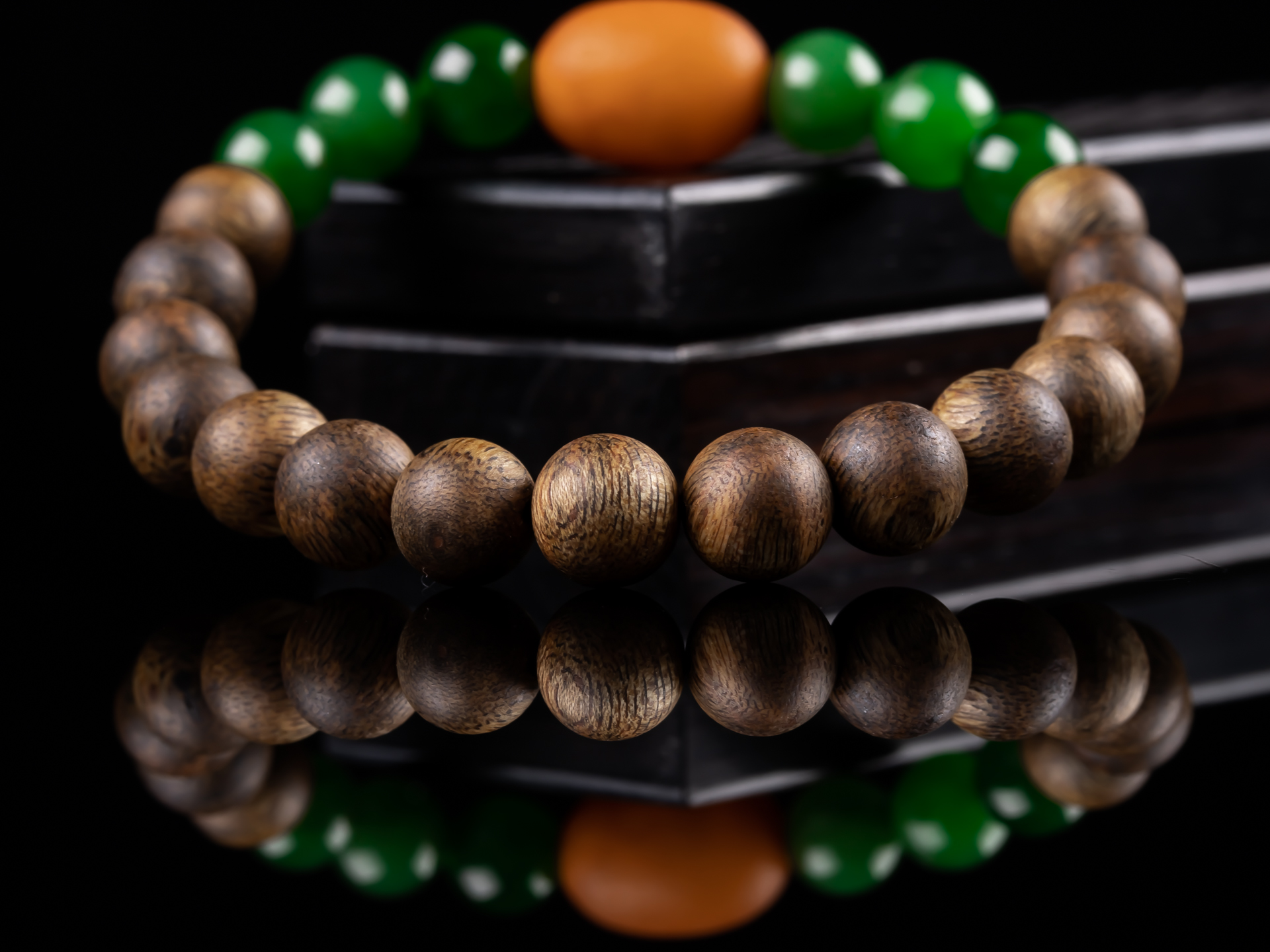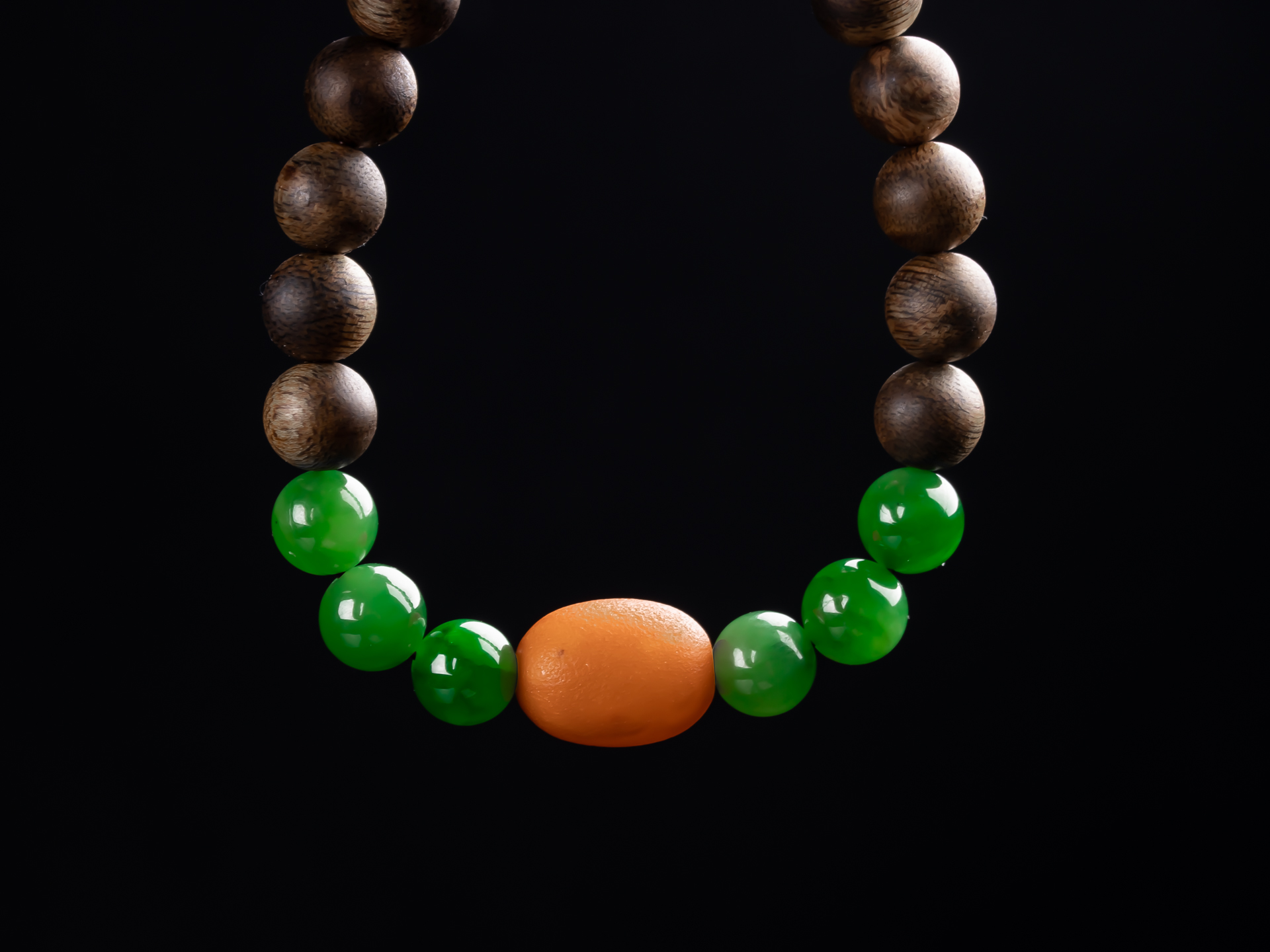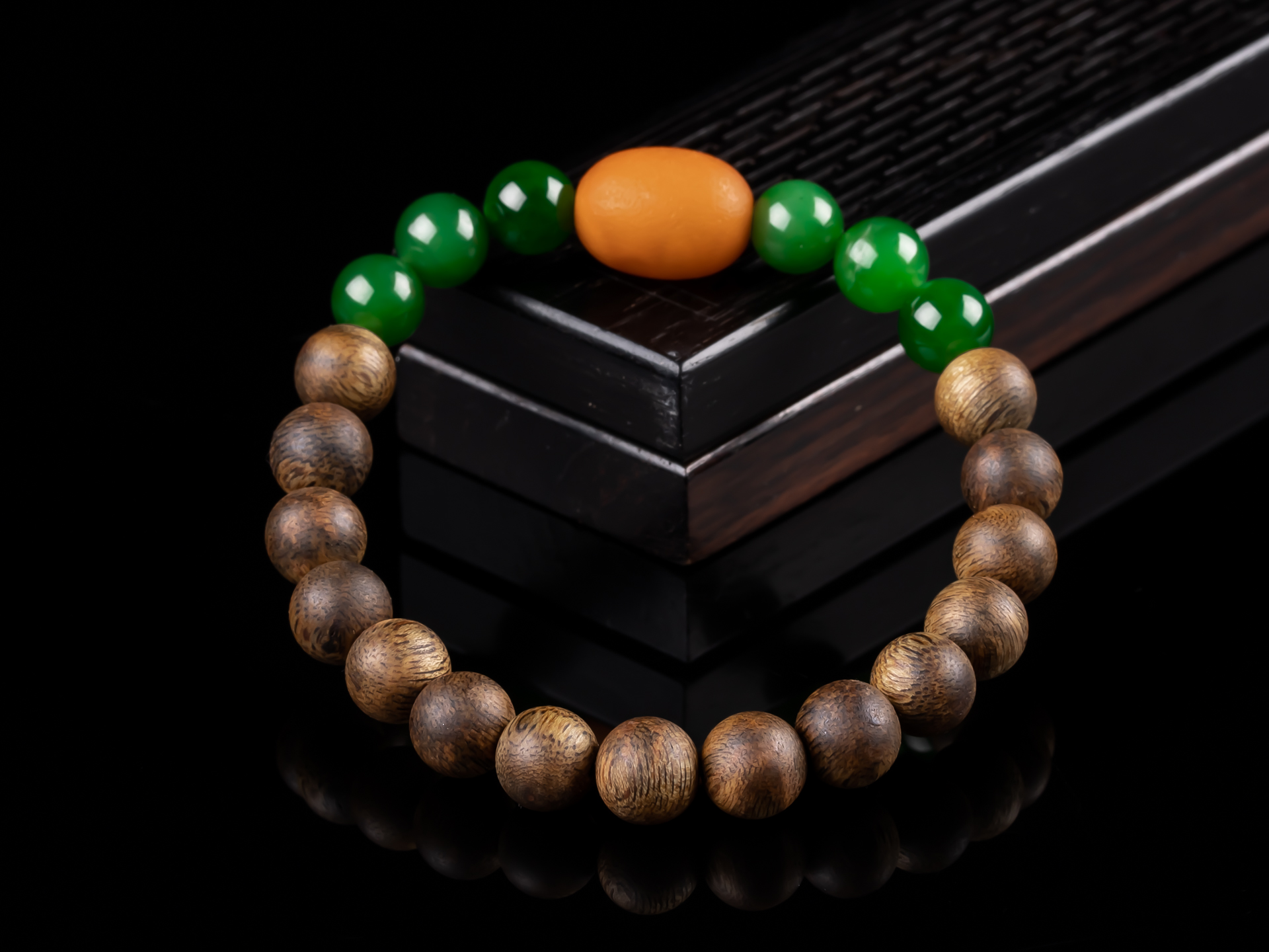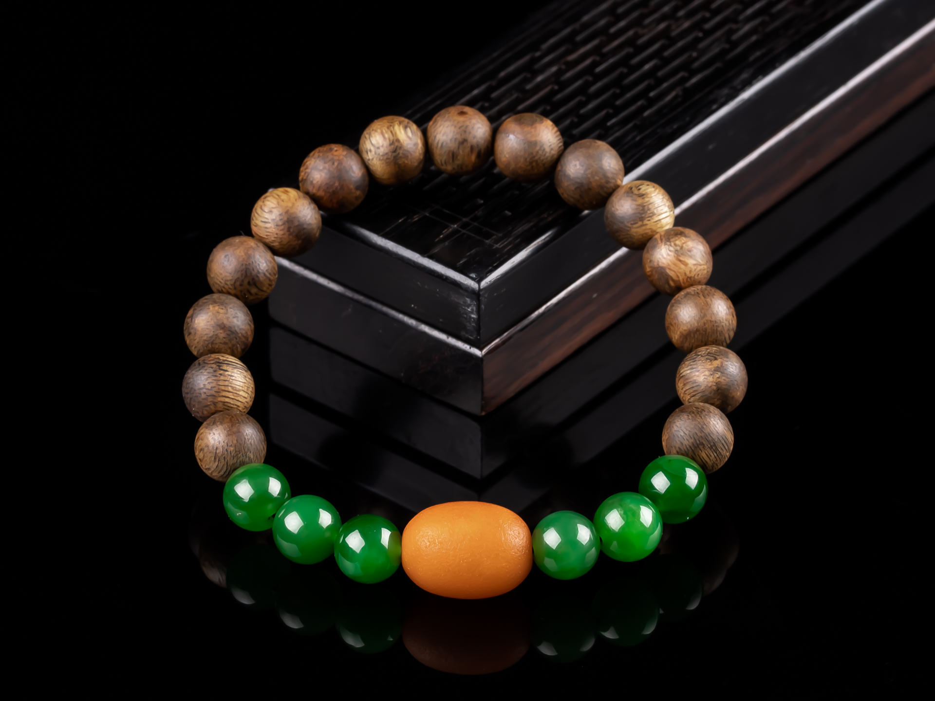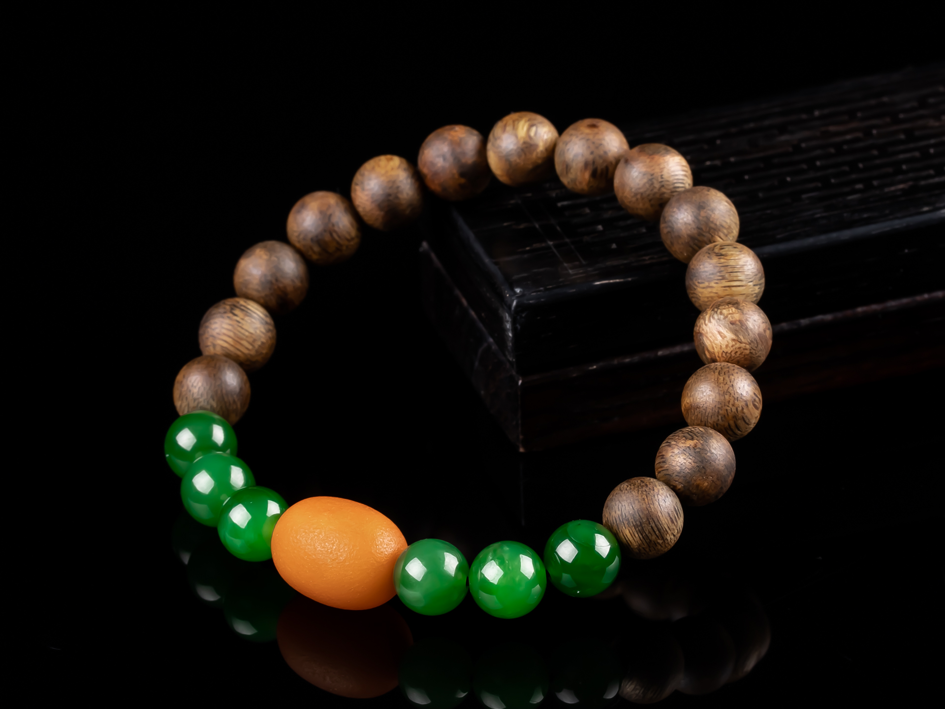 原创沉香DIY碧玉老蜡单圈手串,天然沉香圆珠约8.5mm,手围16,油脂斑驳,原色原味,香气清甜,1颗14.6*11mm老蜜蜡桶珠,再加上 8mm菠菜绿碧玉珠子,与沉香结合是高冷又炙热的沉稳雅韵,佩戴上手素雅大方。💰420