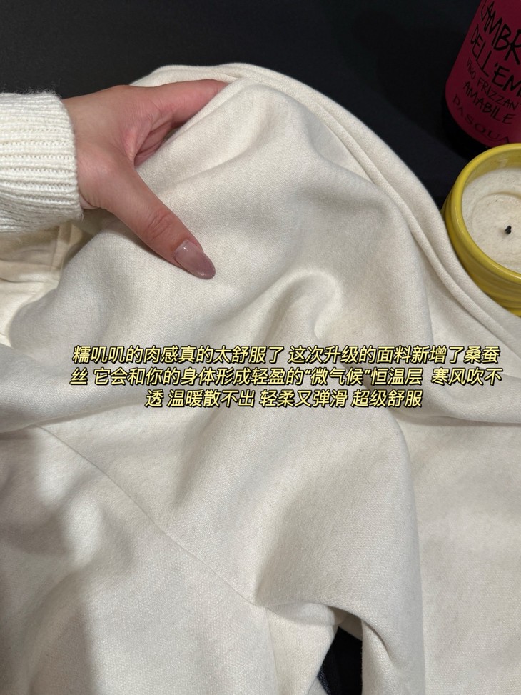 面料又柔又糯 绵羊毛和蚕丝绒的融入更柔、更暖、更舒适 同时可以更好的滋润肌肤 锁温保暖 内里都是单独做了磨毛处理工艺 贴肤即刻生热 又暖又轻!别看混纺比例少 但它的蓬松度和保暖性都要高出普通羊毛数倍!