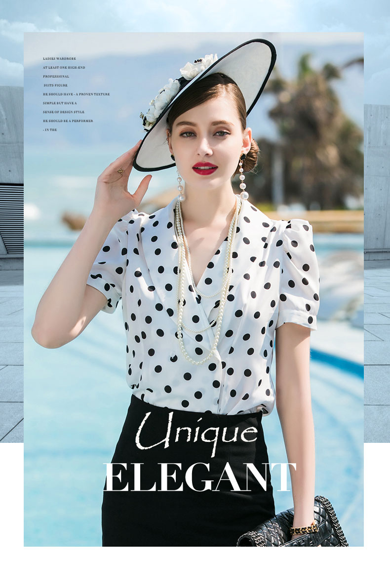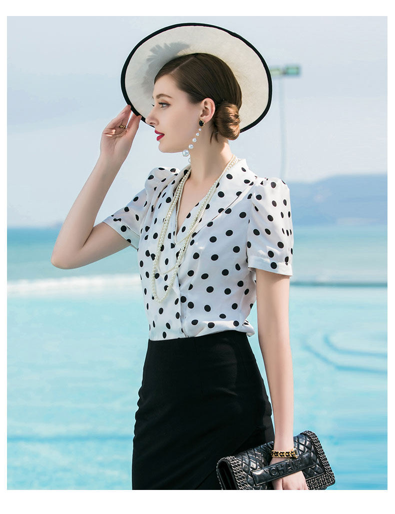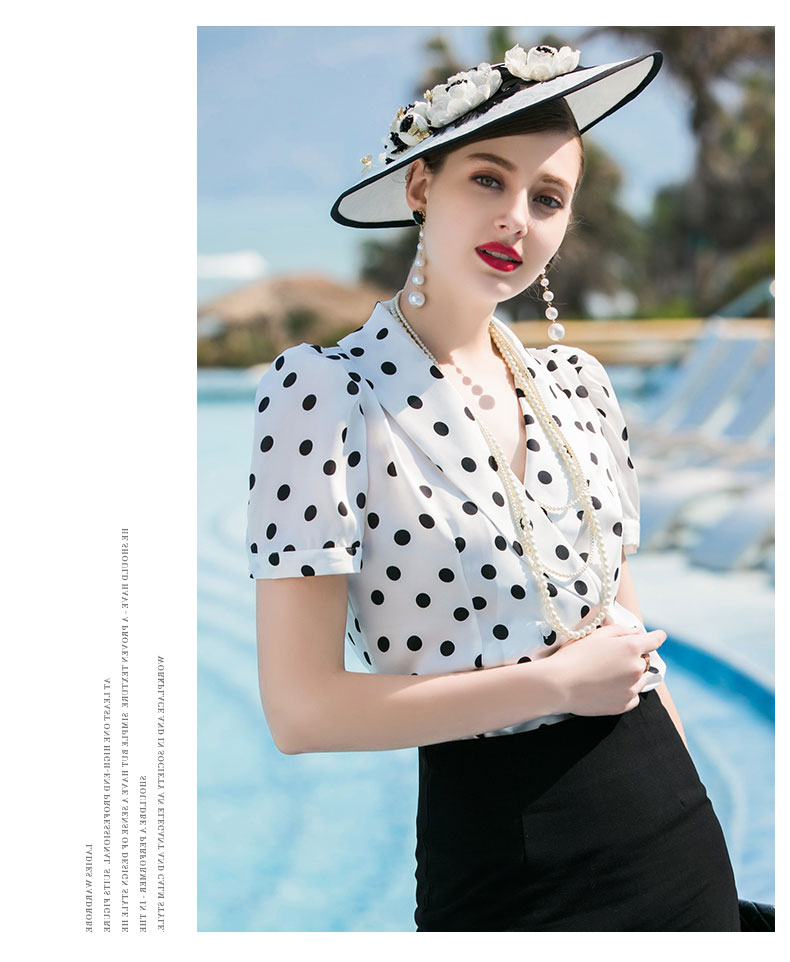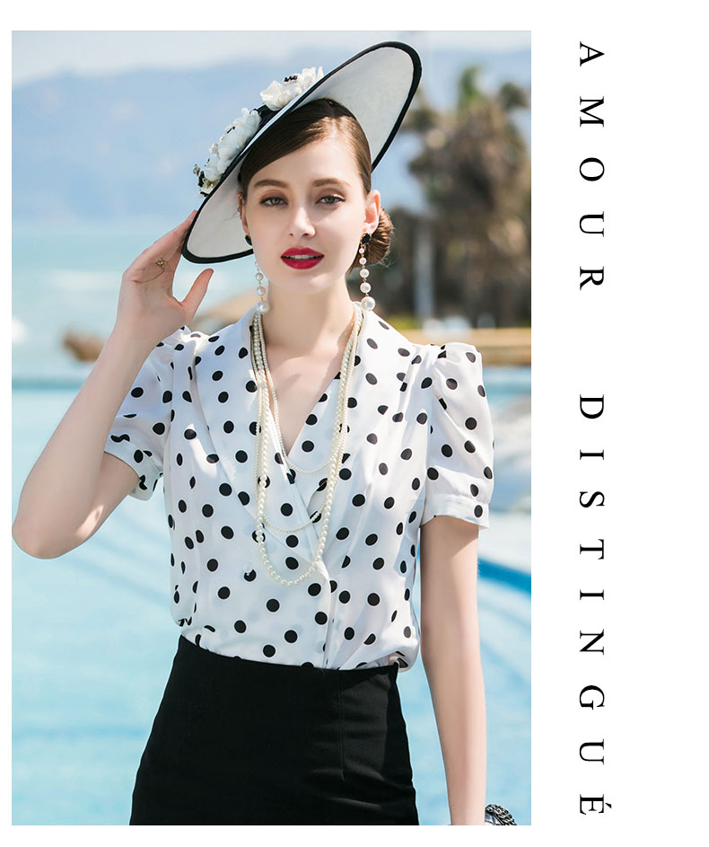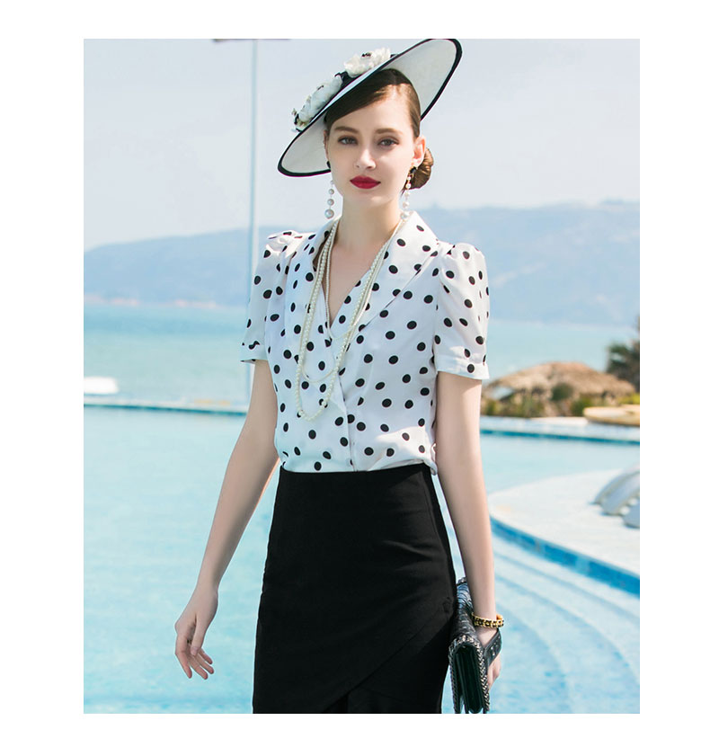 秒杀89元!AD欧美风短袖V领衬衫ol复古时尚波点黑白衬衣雪纺衫夏