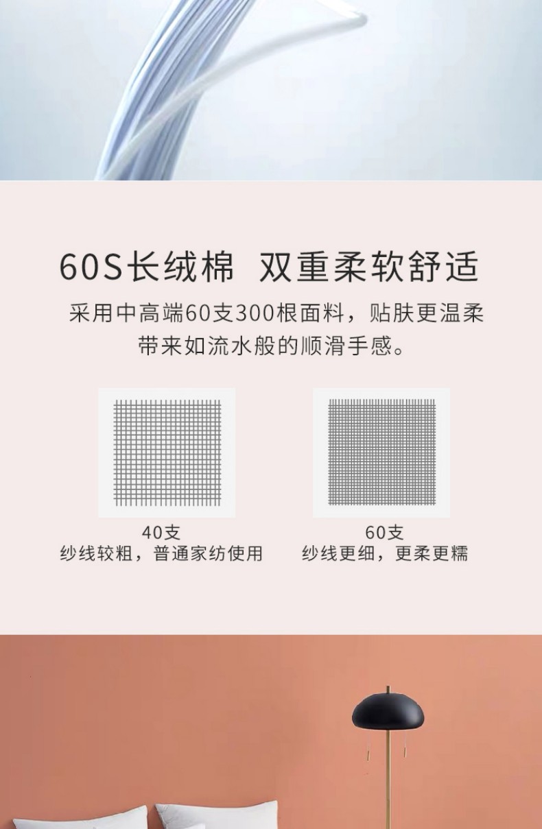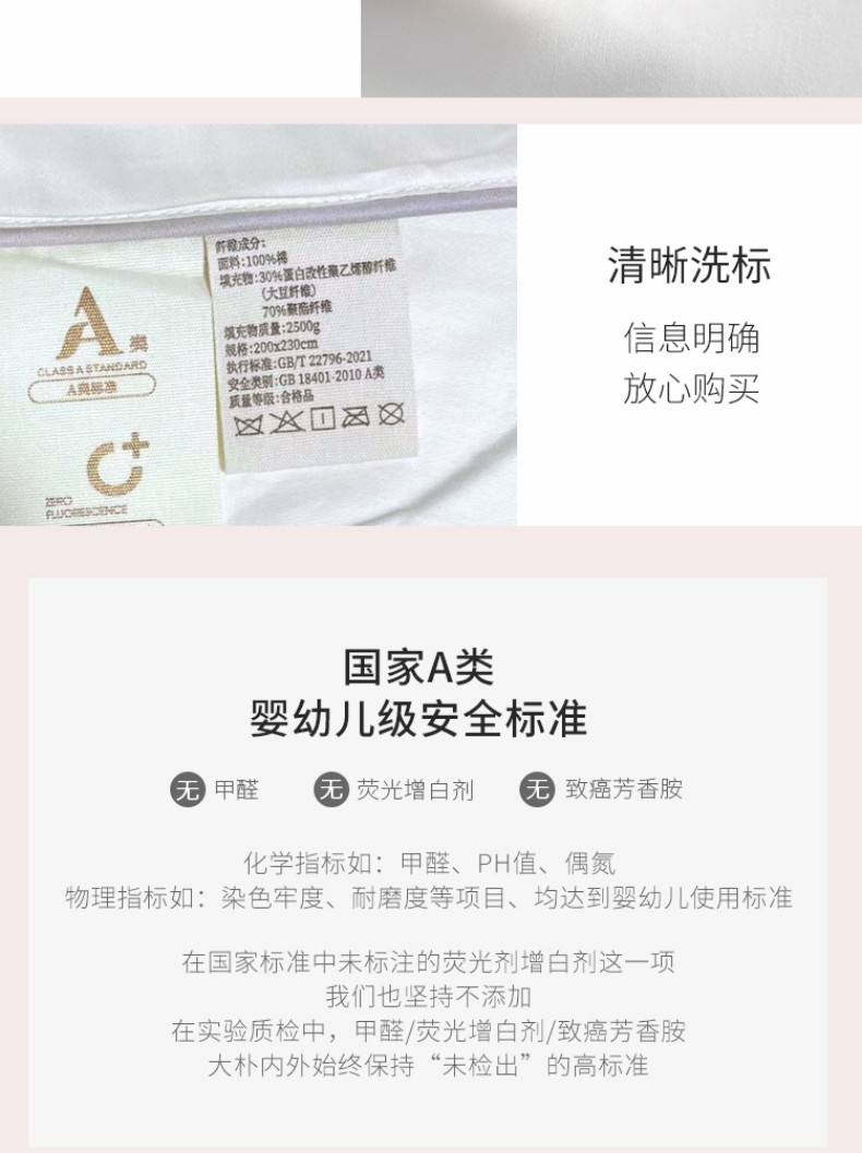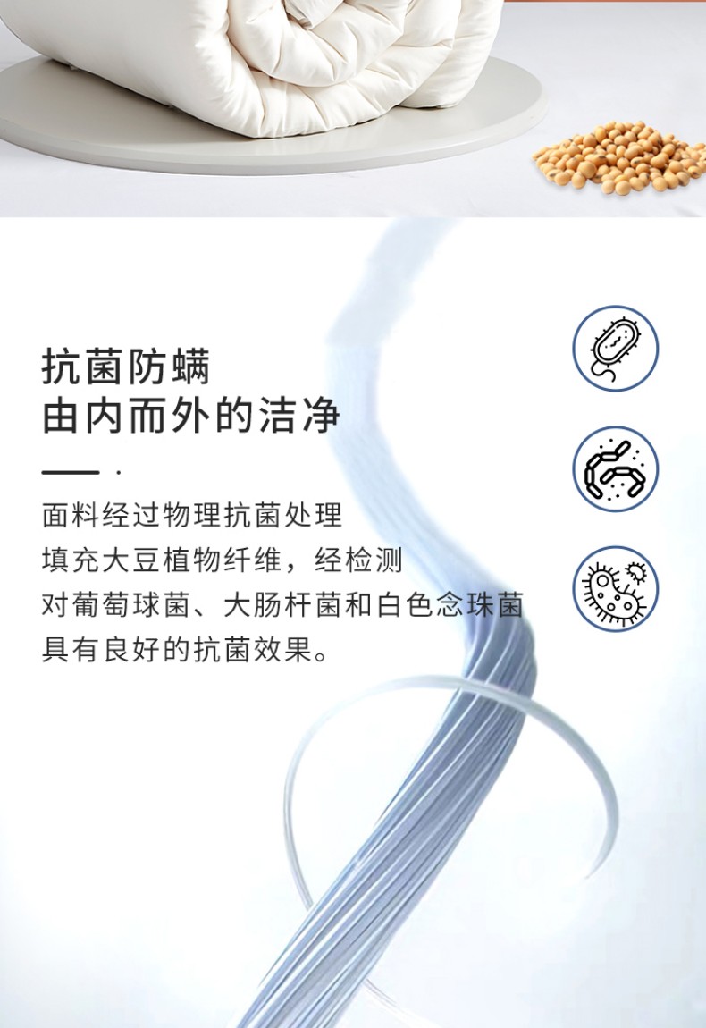 填充物采用30%大豆纤维,既有蚕丝被的柔软触感和丝滑质感,保暖性和吸湿性也毫不逊色。
