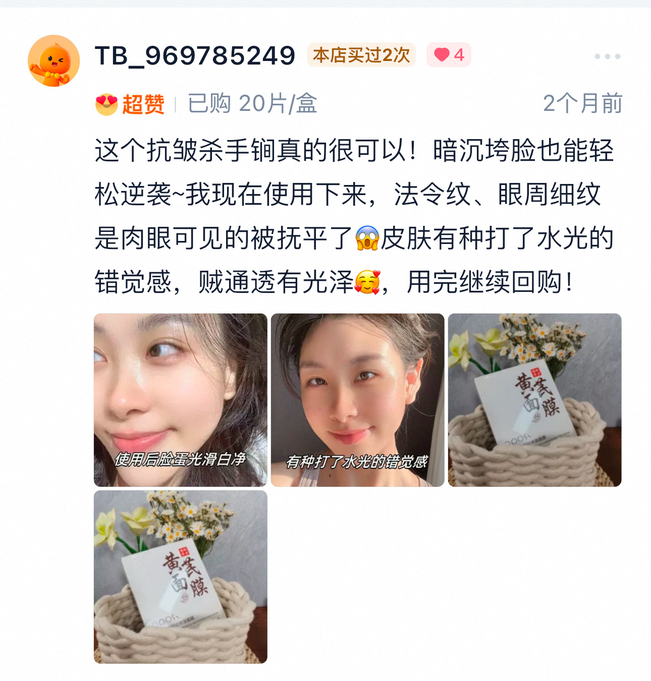 建议熬夜党,肤色暗黄,垮脸粗糙的,长期下来这个脸又亮又嫩!!