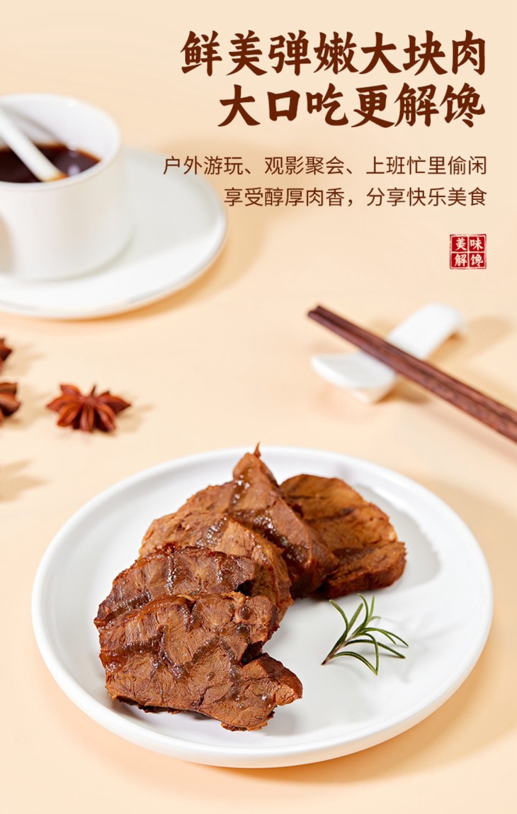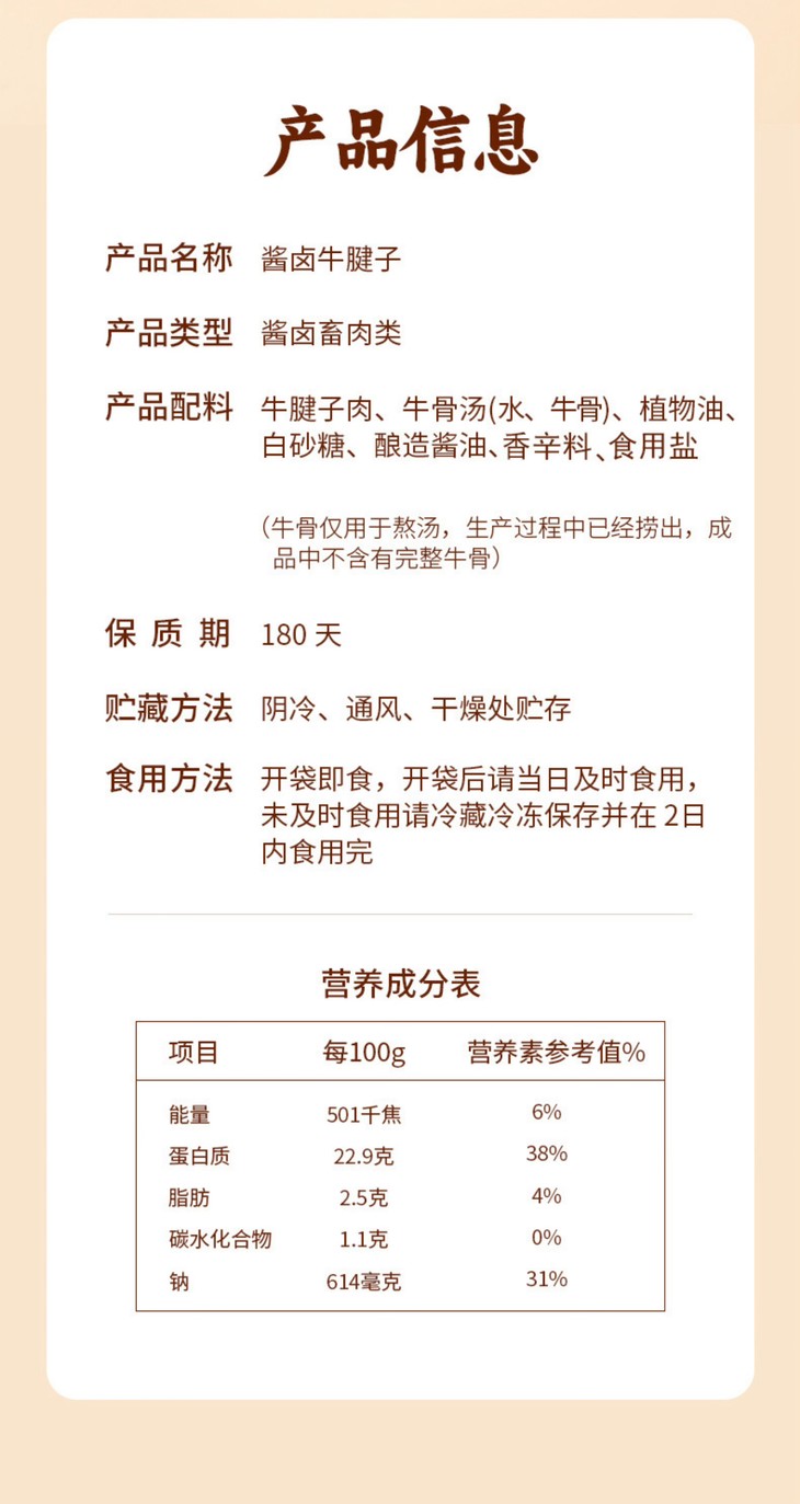 卤牛腱子绝对懒人福音,每袋100g,刚好够一餐!收到后放冷藏,妥妥锁住新鲜口感,想吃时简单切上几刀,薄厚随心,红白相间的纹理立刻显露,让人食欲大开,卤香浓郁却不腻口,是那种慢慢渗透到每一丝肉纤维里的醇厚香气,肉肉又很紧实,还带着恰到好处的筋道,越嚼越香!每100克卤牛腱子就含有22.9克优质高蛋白,下班回家累到不想动,周末赖床不想开火,都可以随手拆一袋,再也不用在厨房烟熏火燎啦!