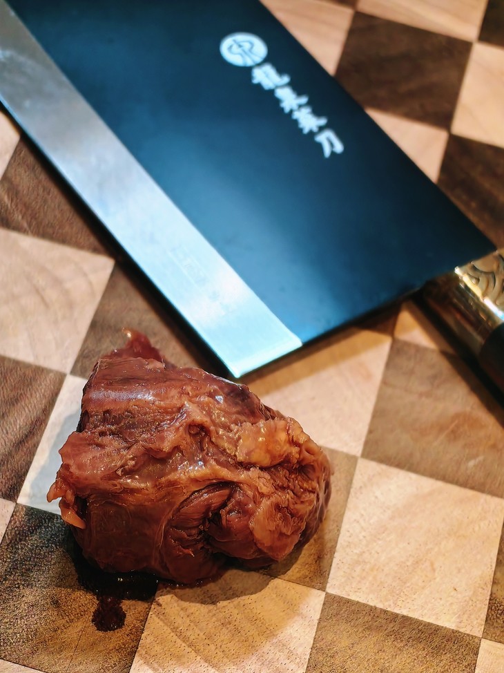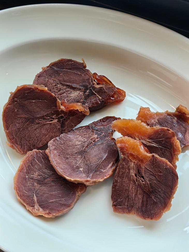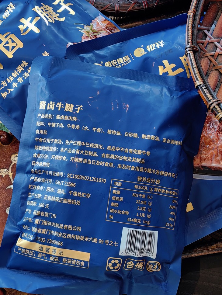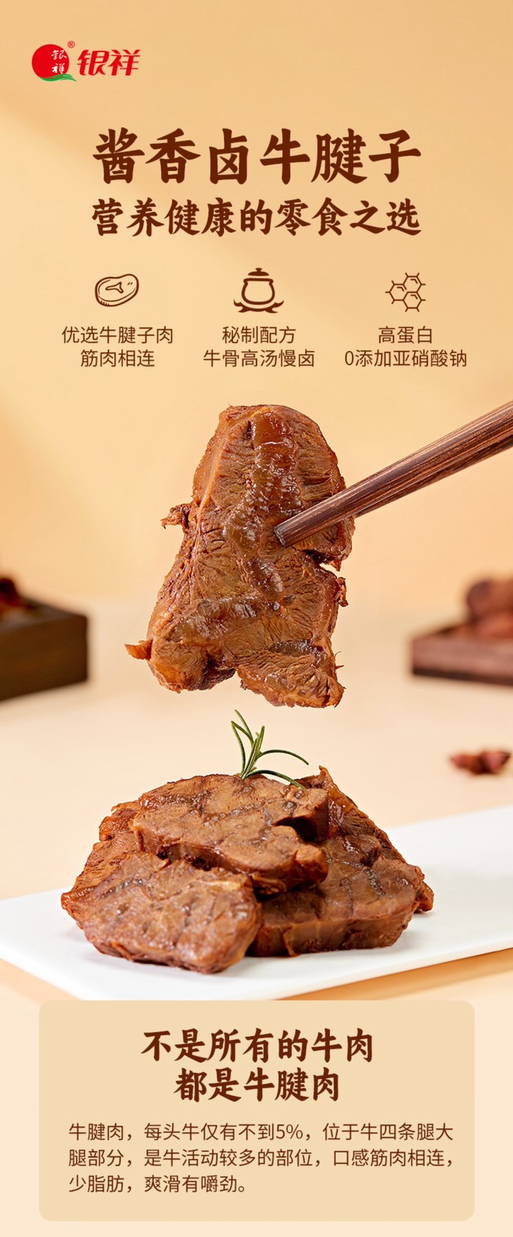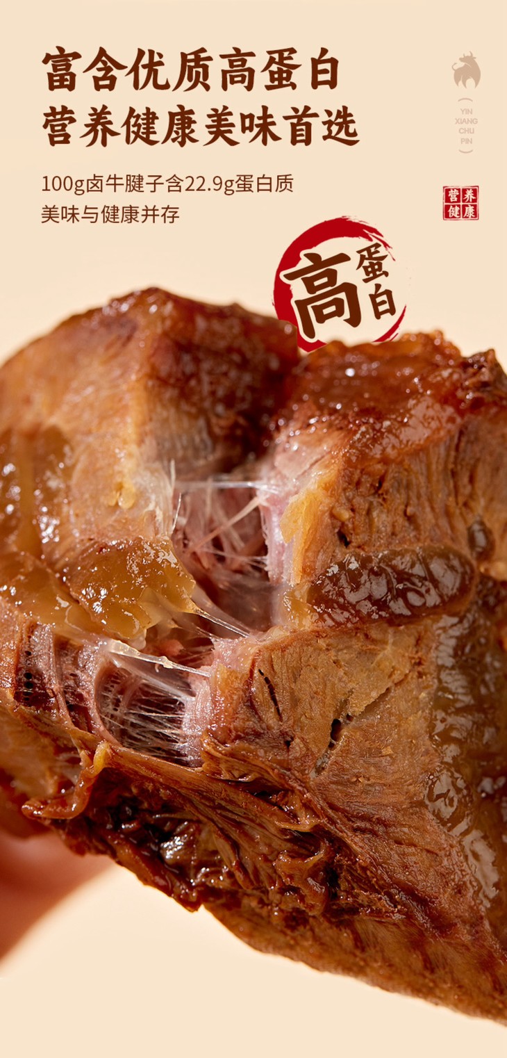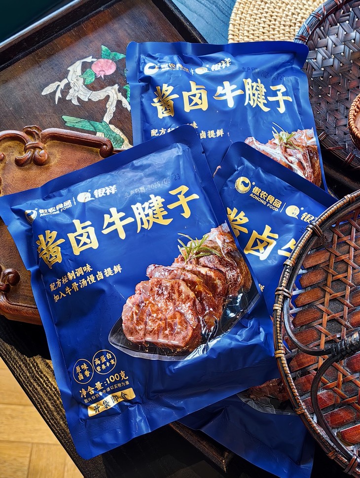 银祥酱香卤牛腱子,严选高标准牛腱肉原切,每头牛仅有不到5%,口感筋肉相连,少脂肪,爽滑有嚼劲。而每一块肉源也都经过严格安全检疫,从源头把控品质。在卤制工艺上,精熬牛骨高汤为底,搭配秘制配方文火慢卤。长时间的炖煮中,深层骨香被充分萃取,卤汁的浓郁与骨汤的醇厚层层渗入肉中,最后制成鲜嫩与丰腴完美交融的卤牛腿子肉,越嚼越有滋味!