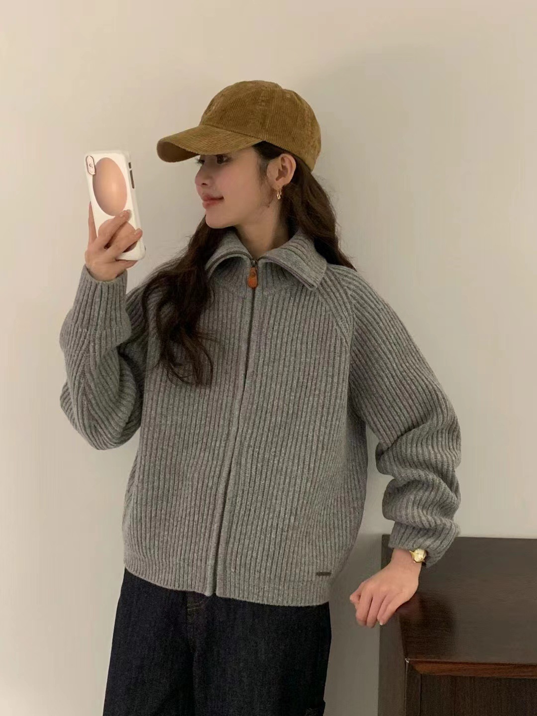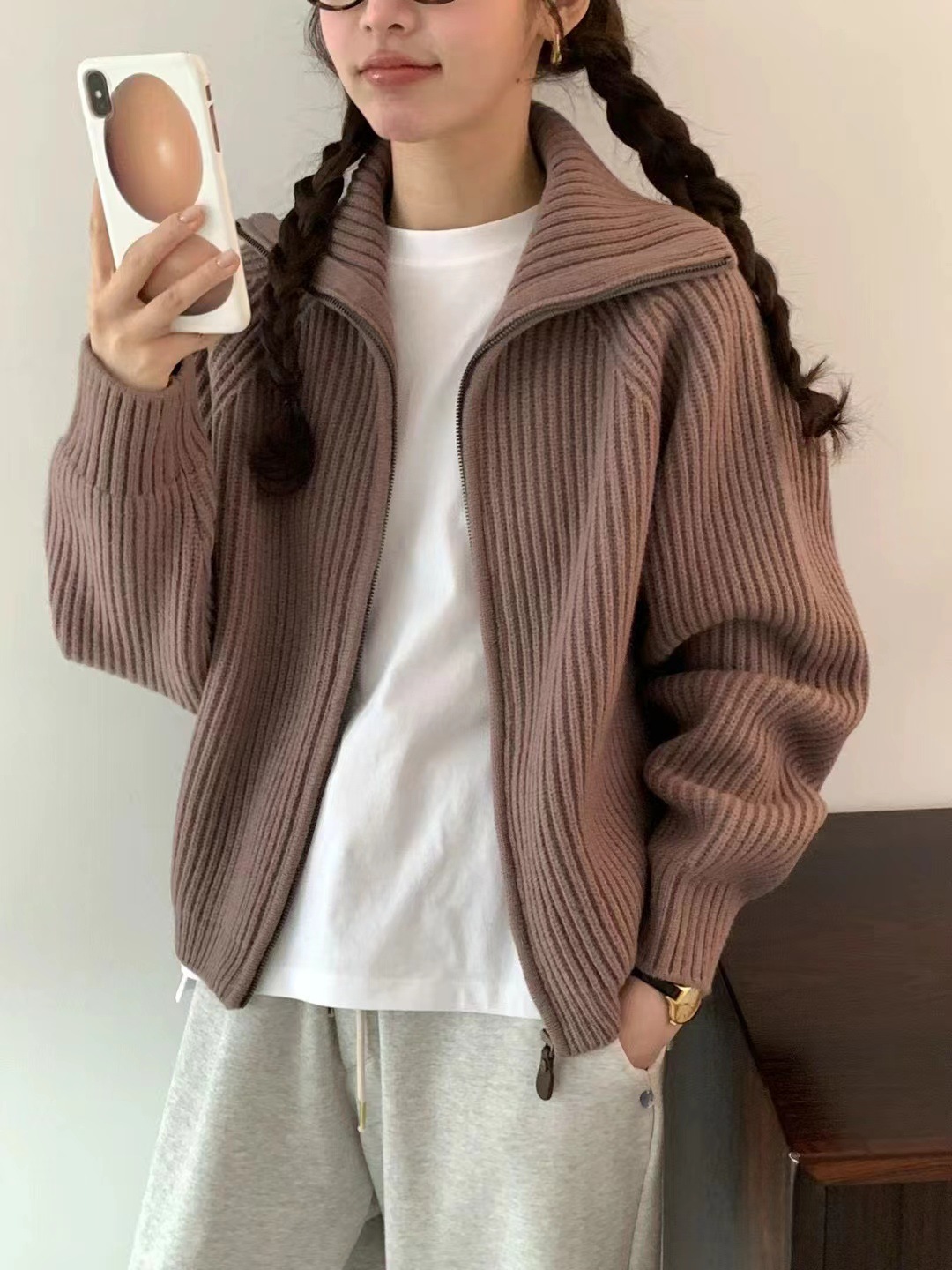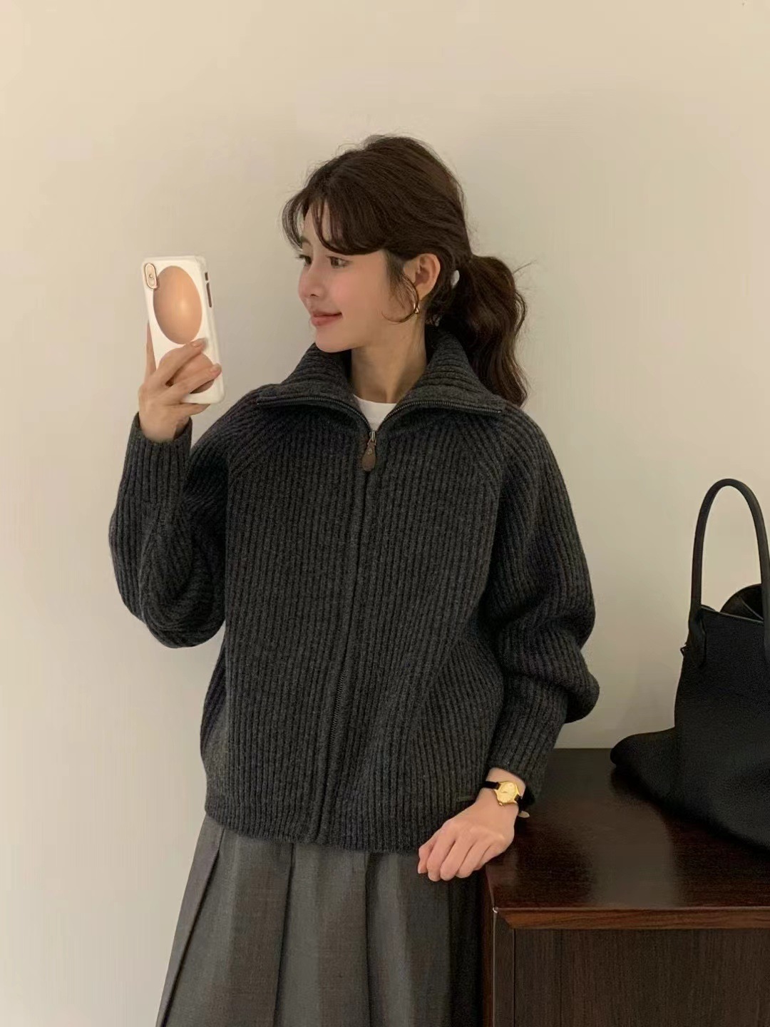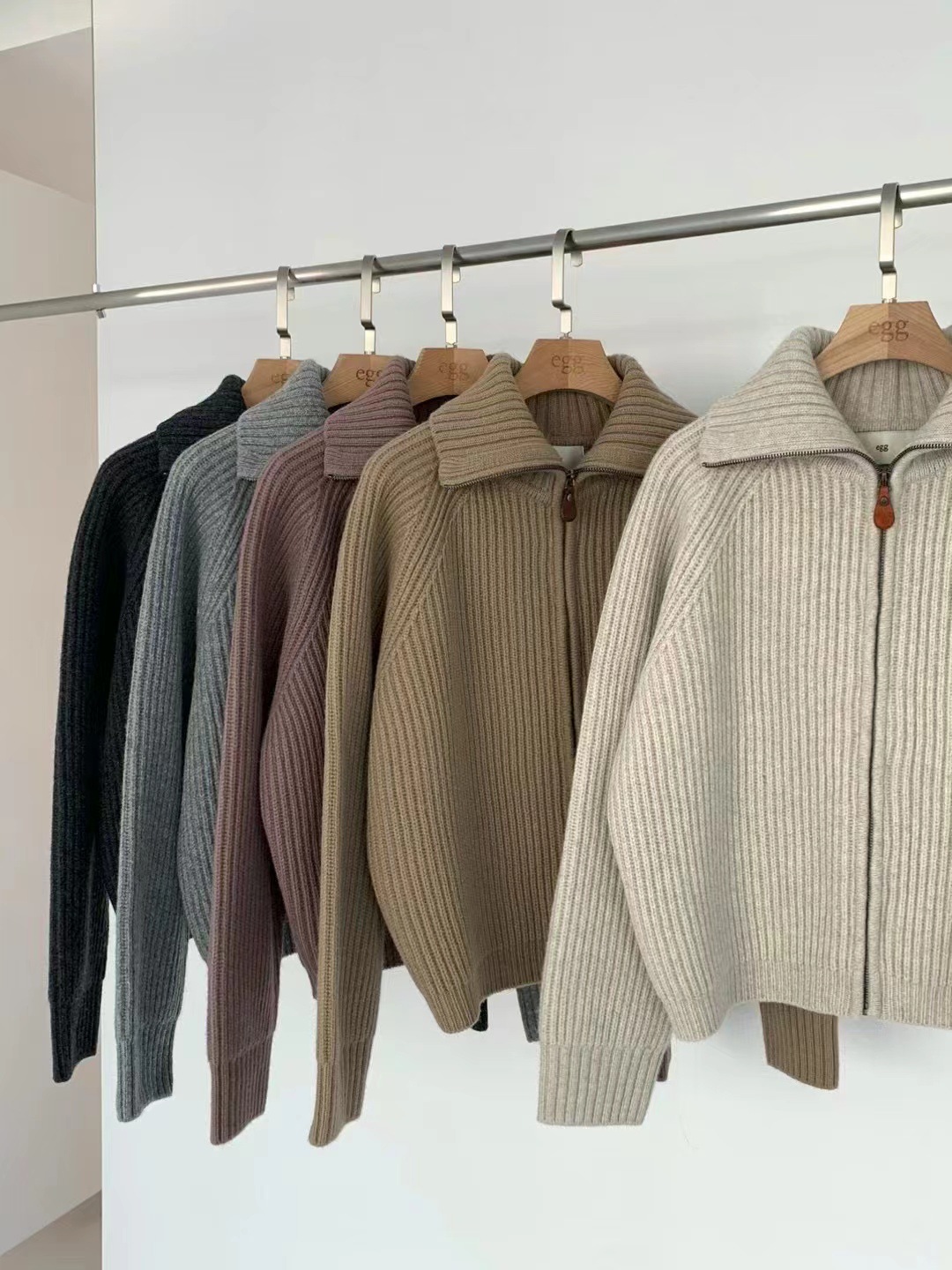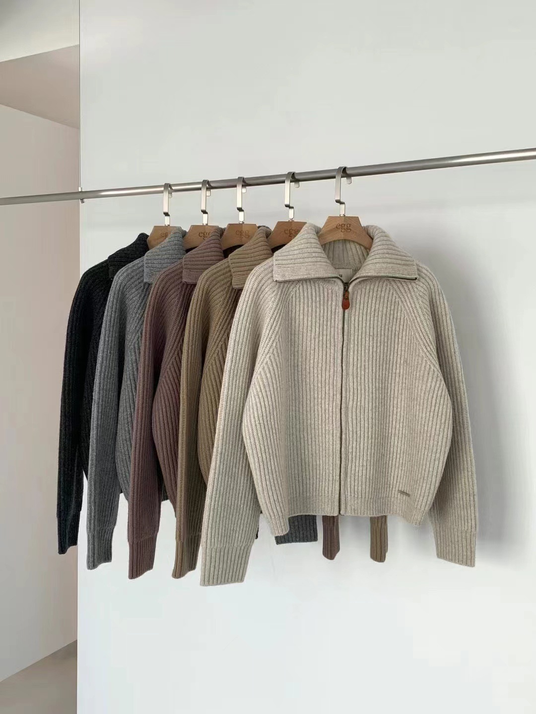 韩代同款!EGG东大门新款翻领拉链羊毛针织开衫长袖毛衣女外套!