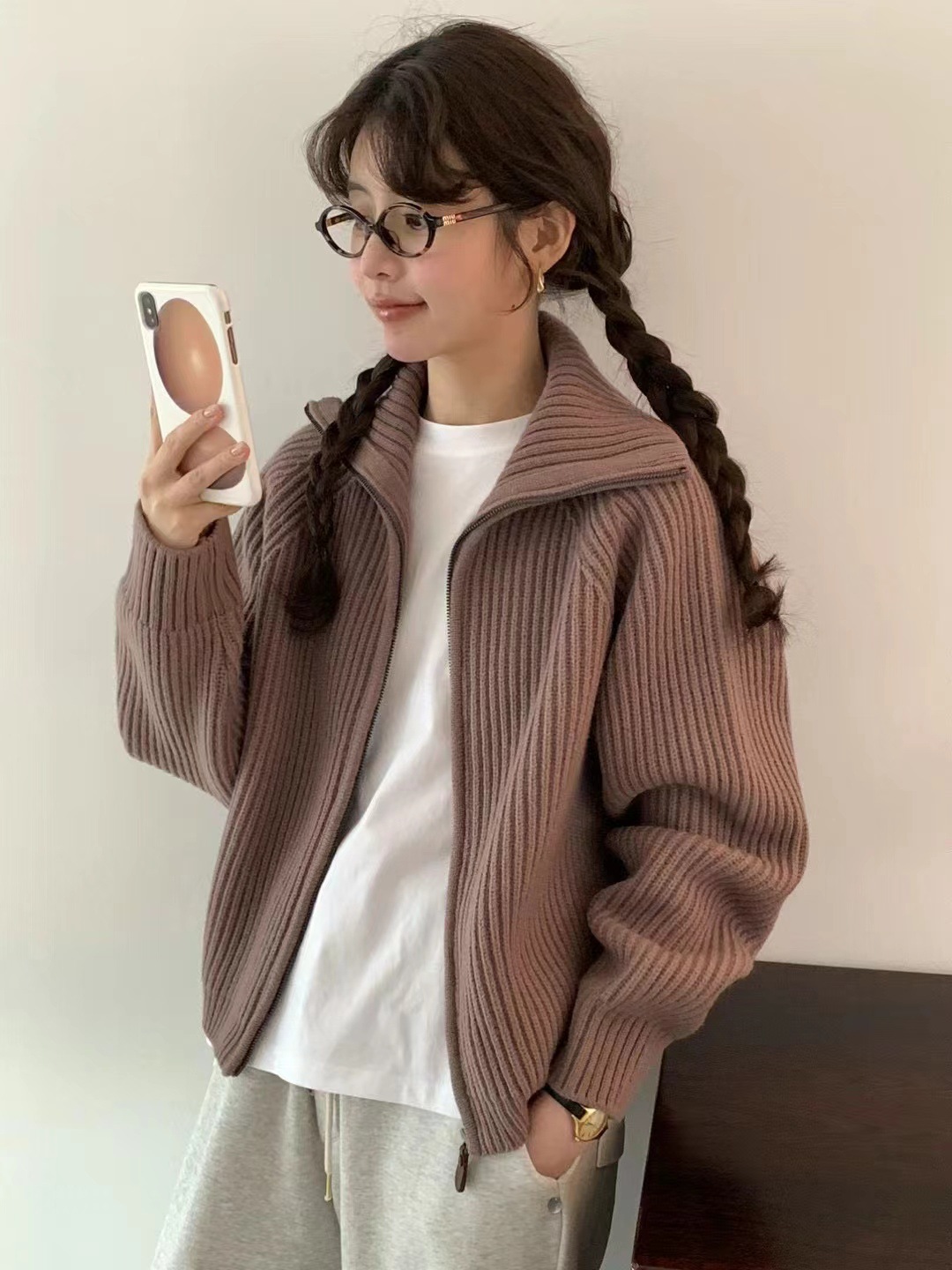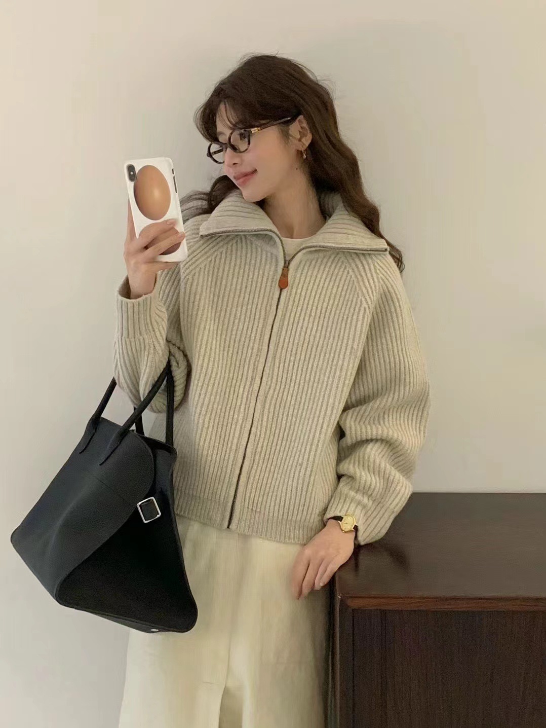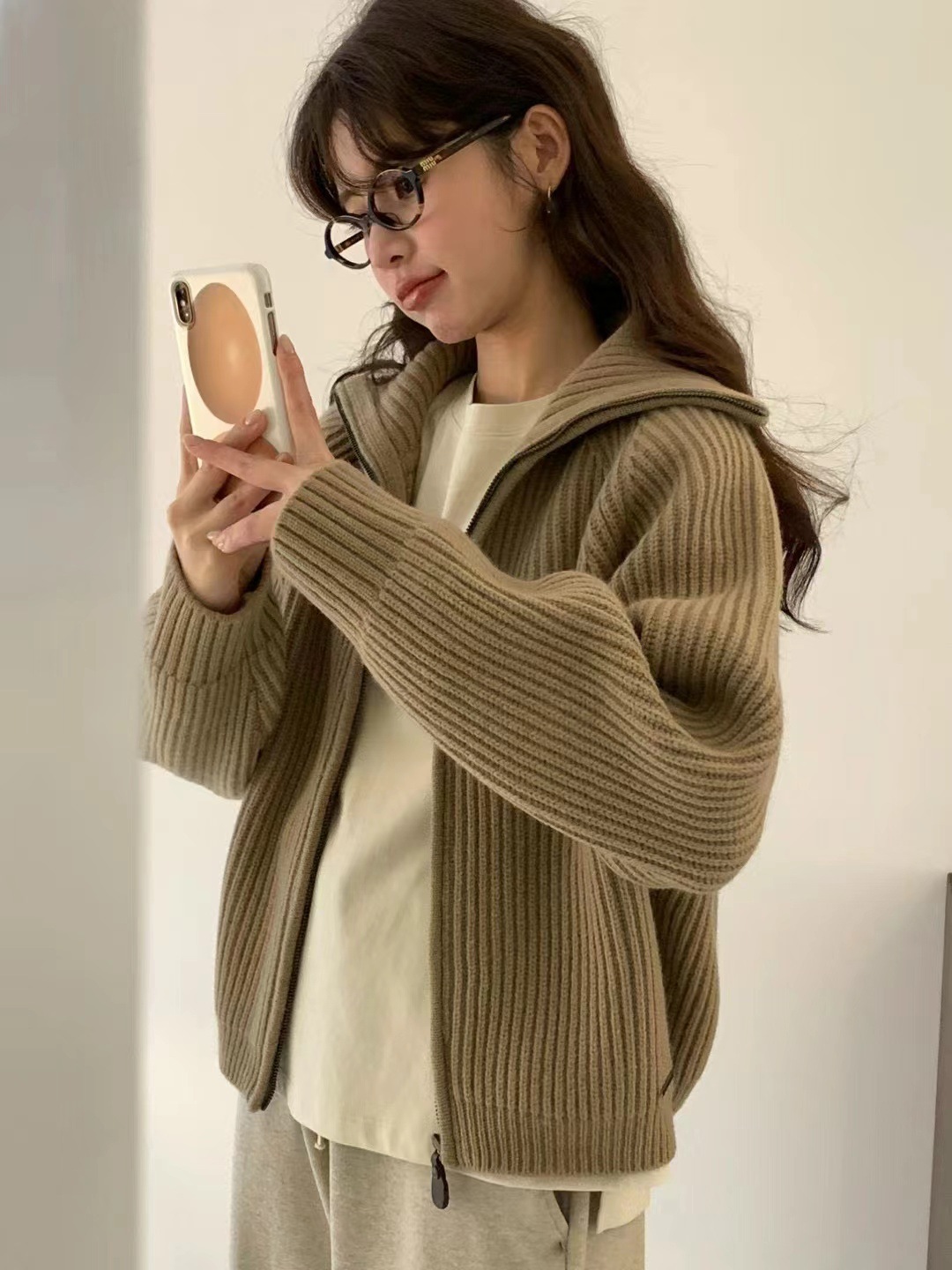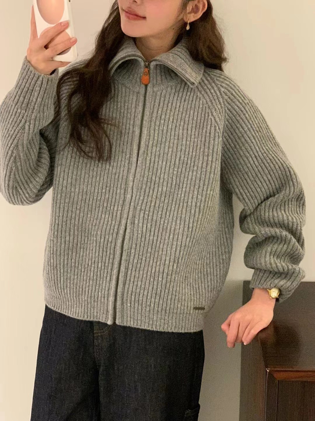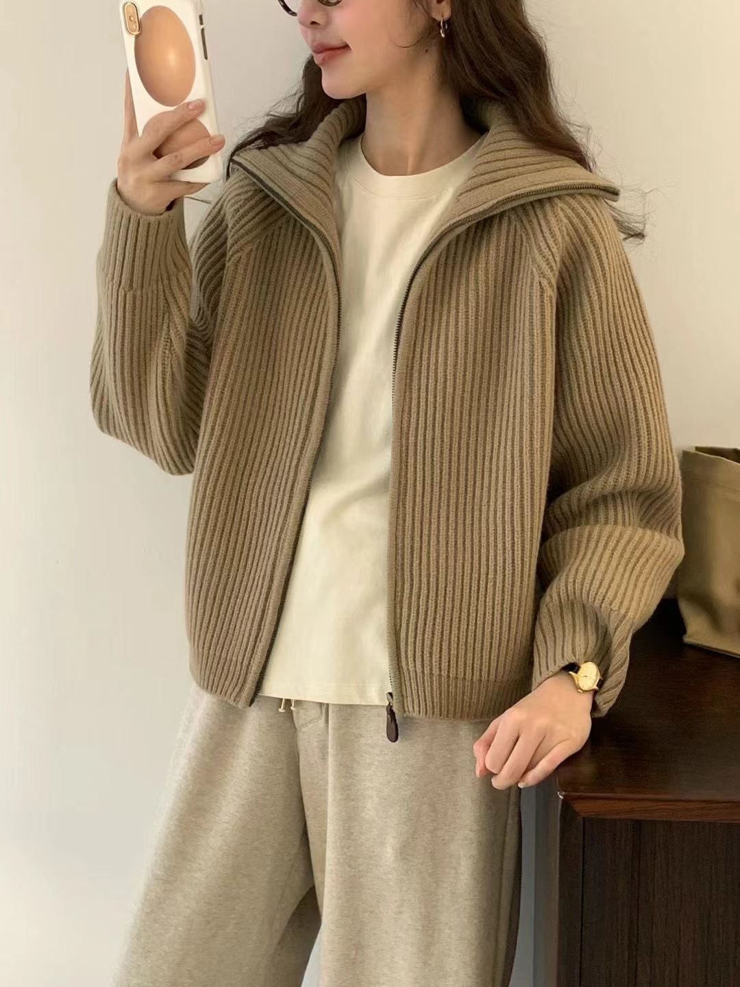 韩代同款!EGG东大门新款翻领拉链羊毛针织开衫长袖毛衣女外套!