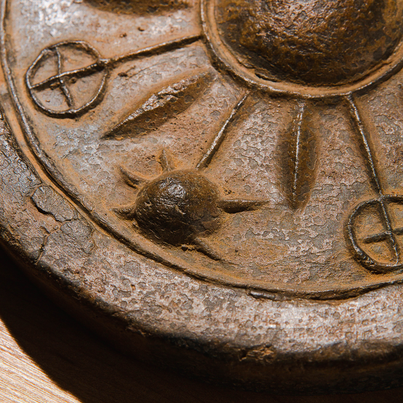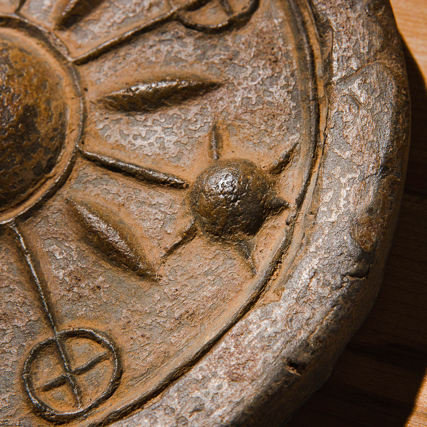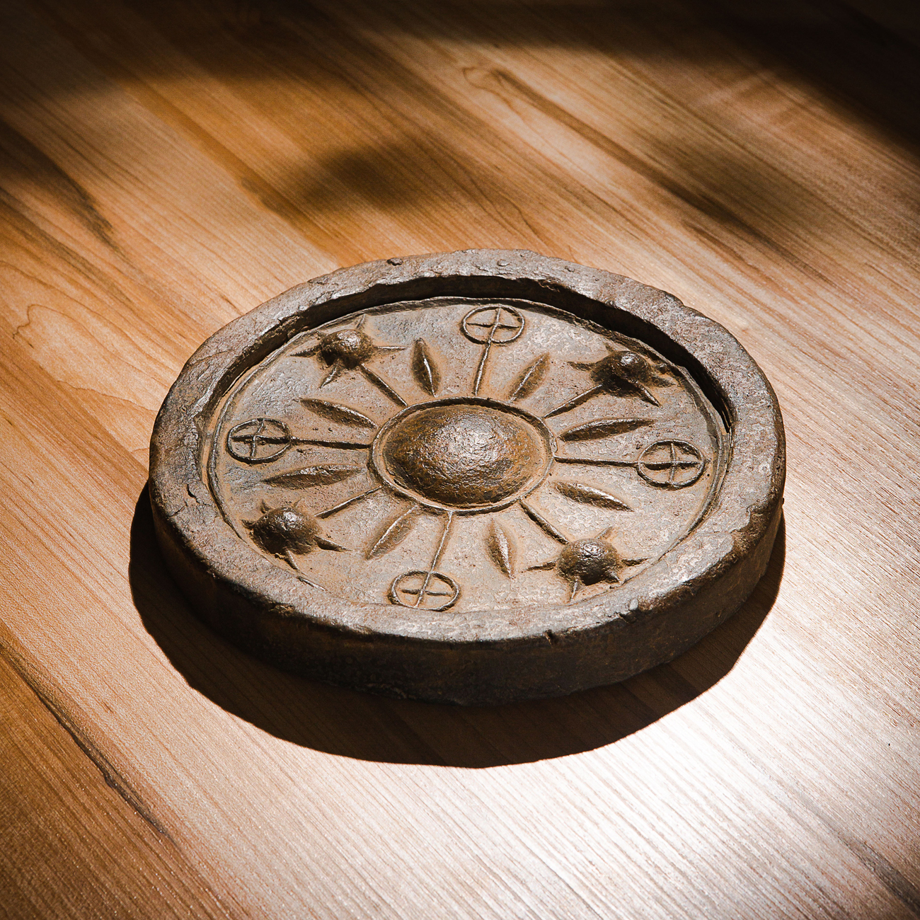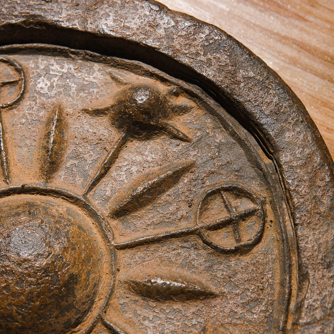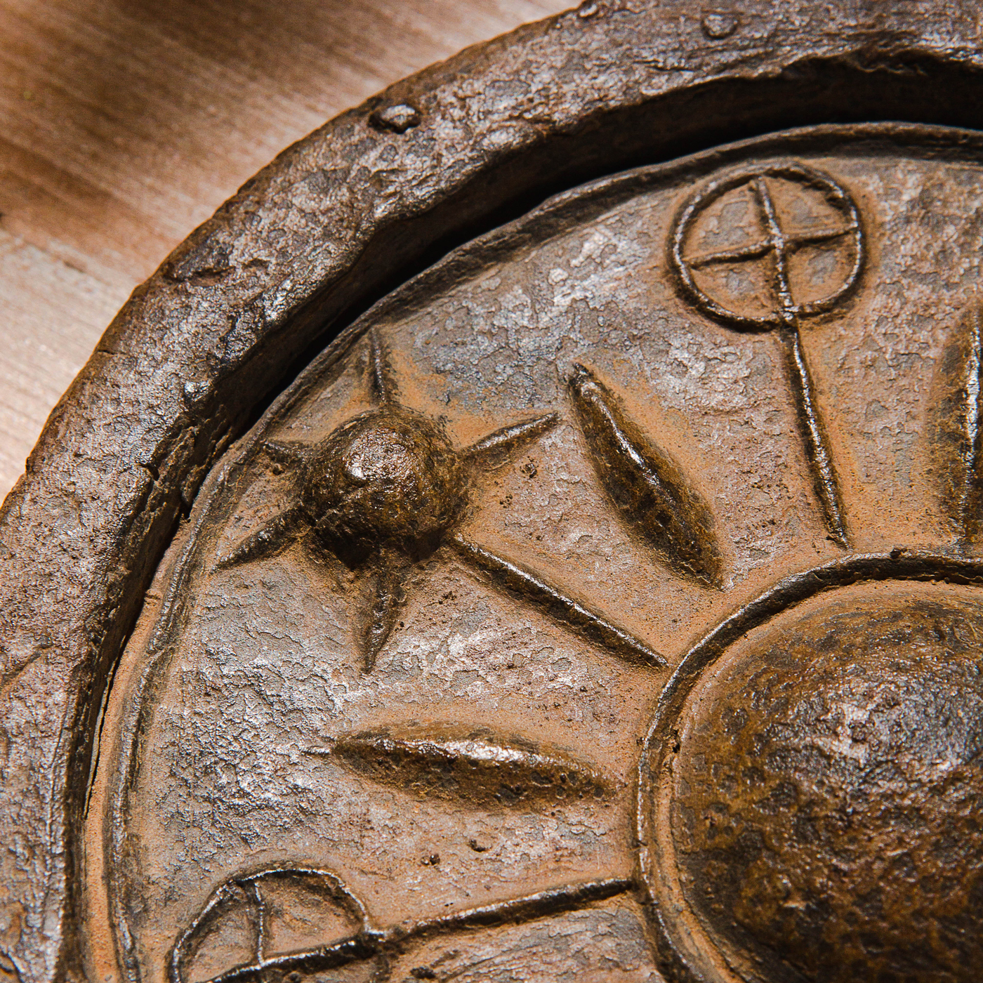南北朝“星宿”瓦当,存世少见。其纹饰古朴奇妙,品相保存完整,尺寸大。瓦当背面有“匠神梅生”四字印章,极为珍贵。此物是收藏之佳品,可遇而不可求。