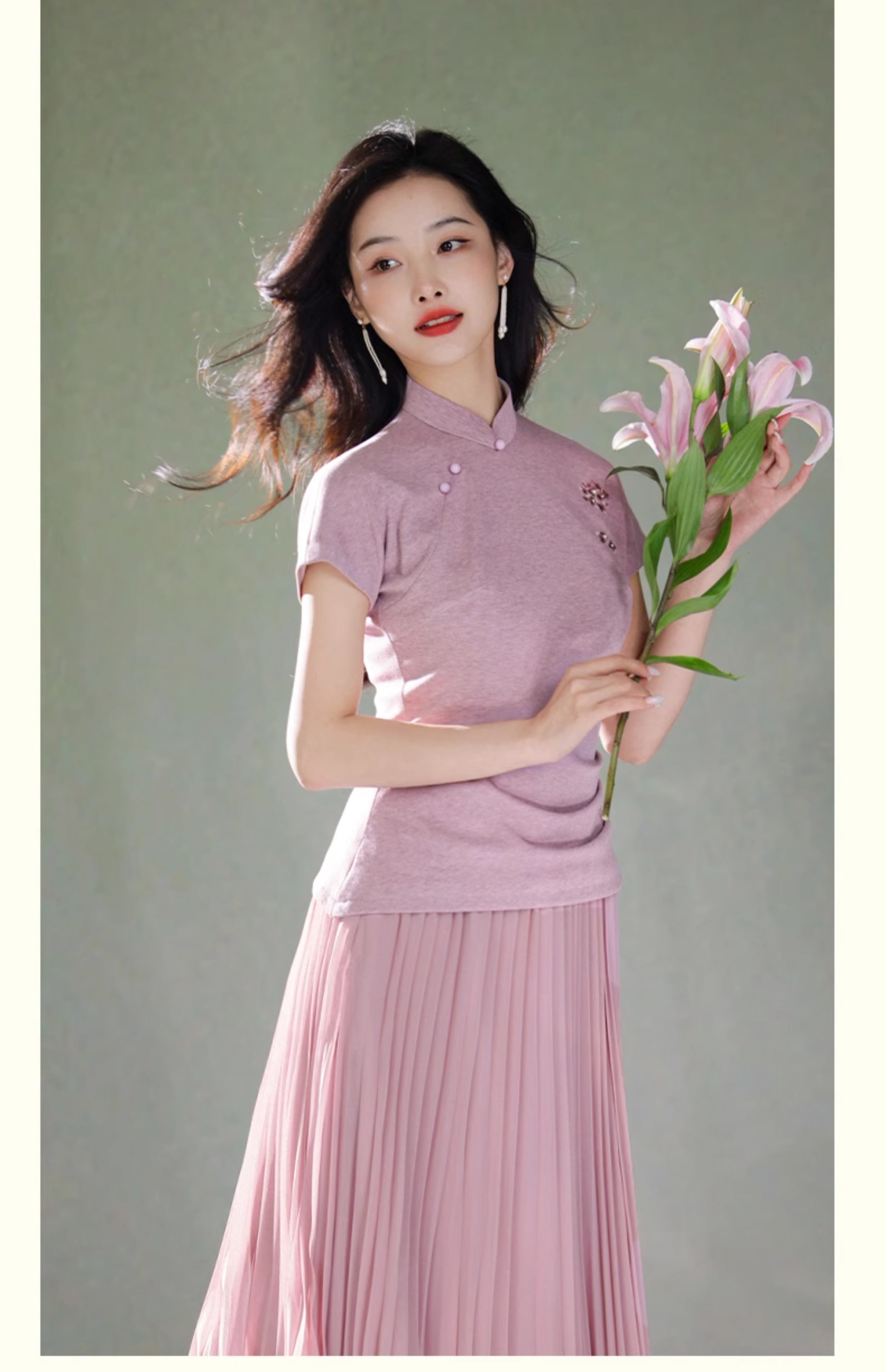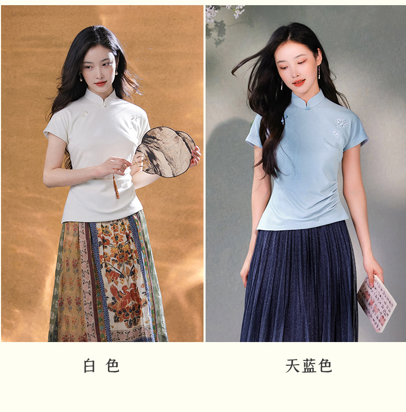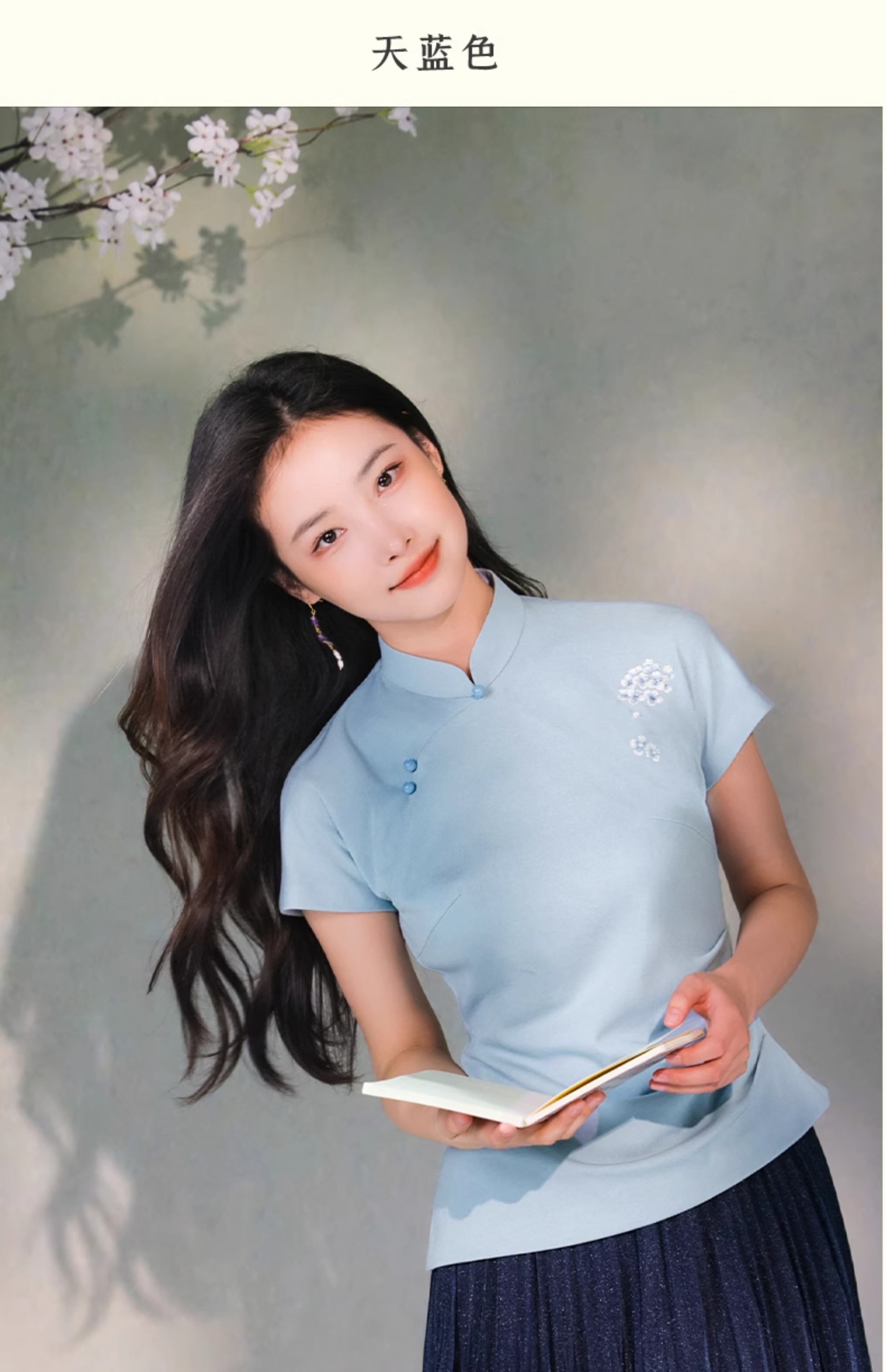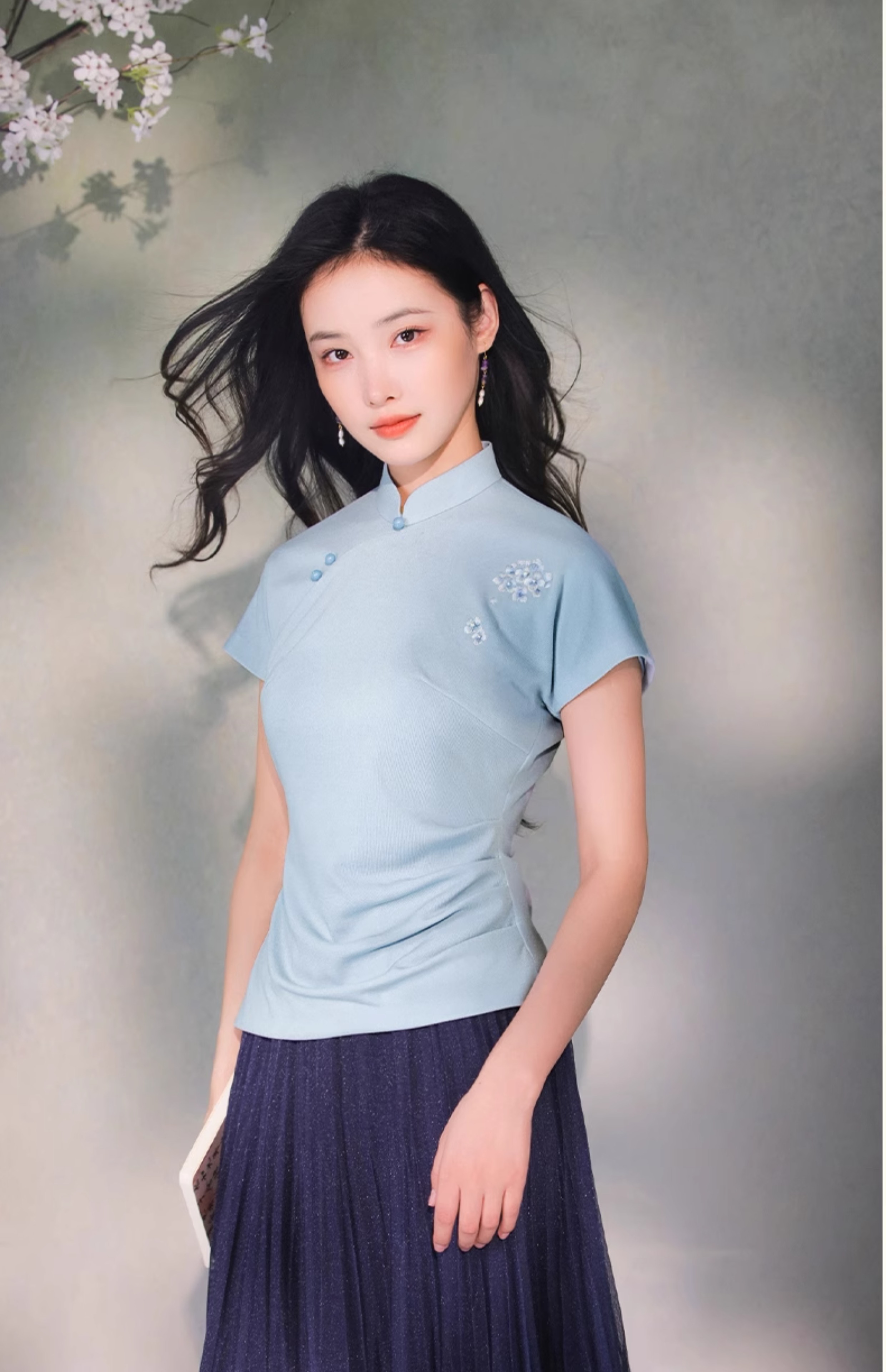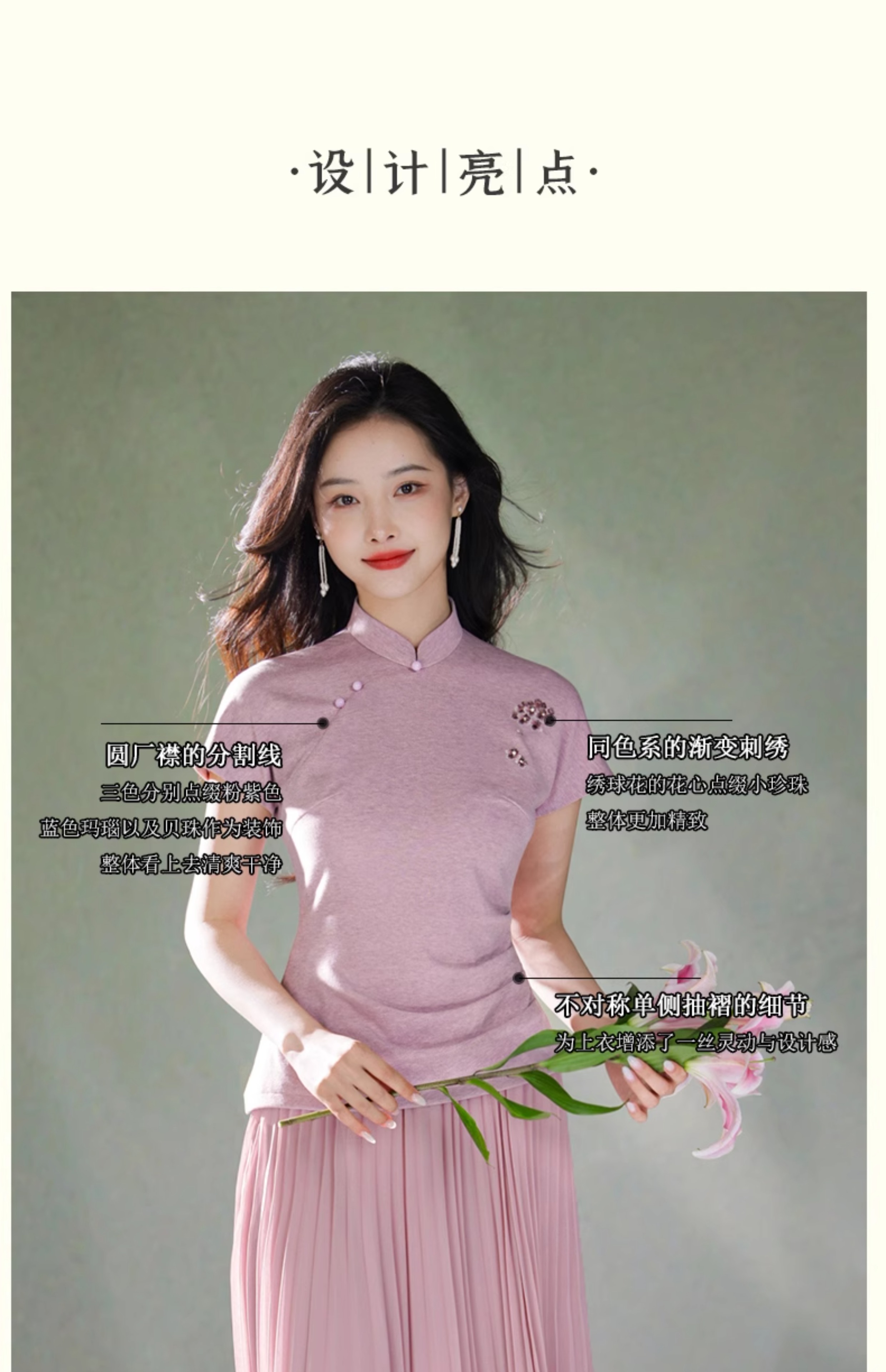 逸红颜琇苒2025夏新款不对称抽褶凉感弹力针织新中式刺绣旗袍上衣