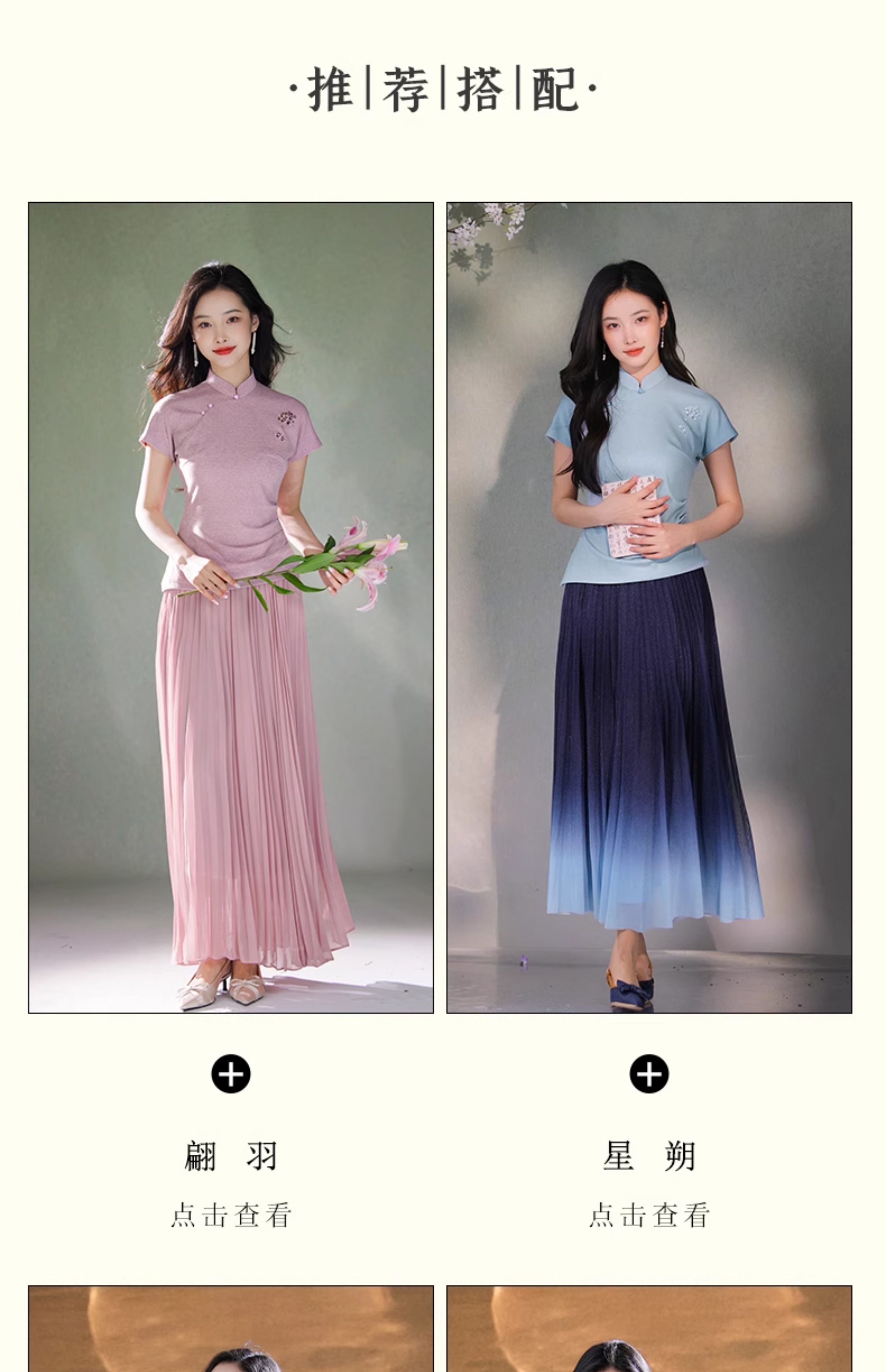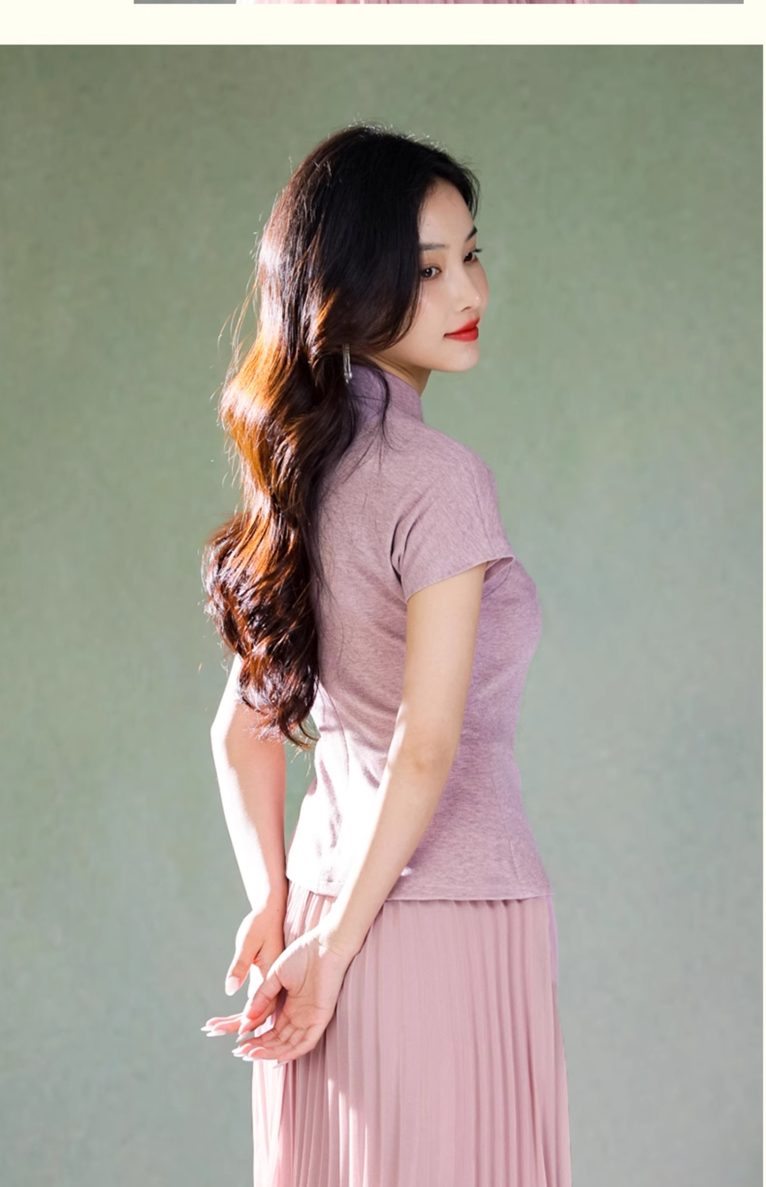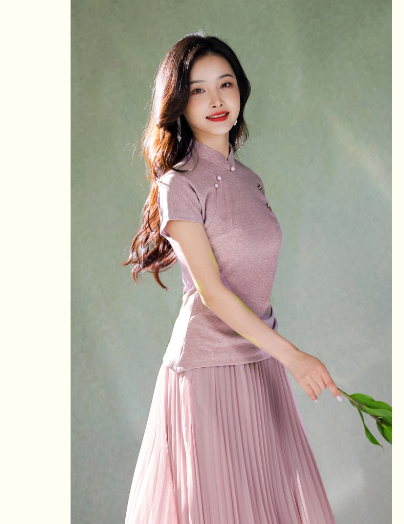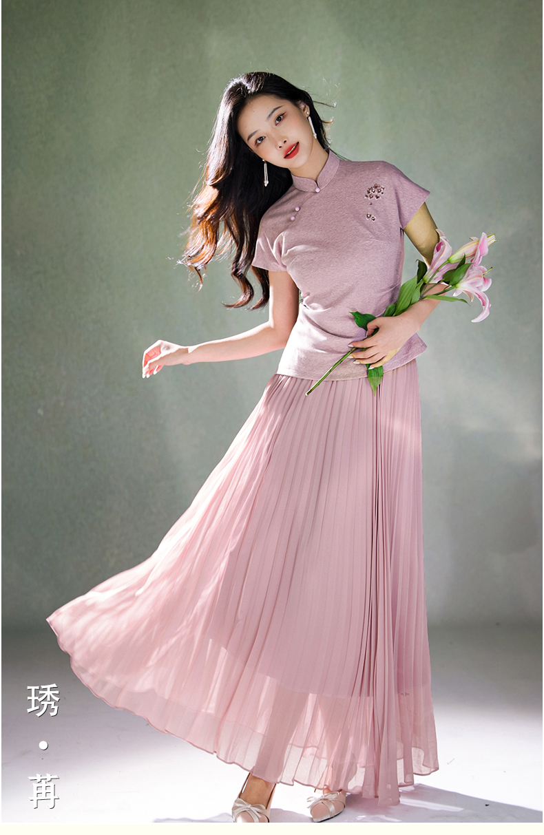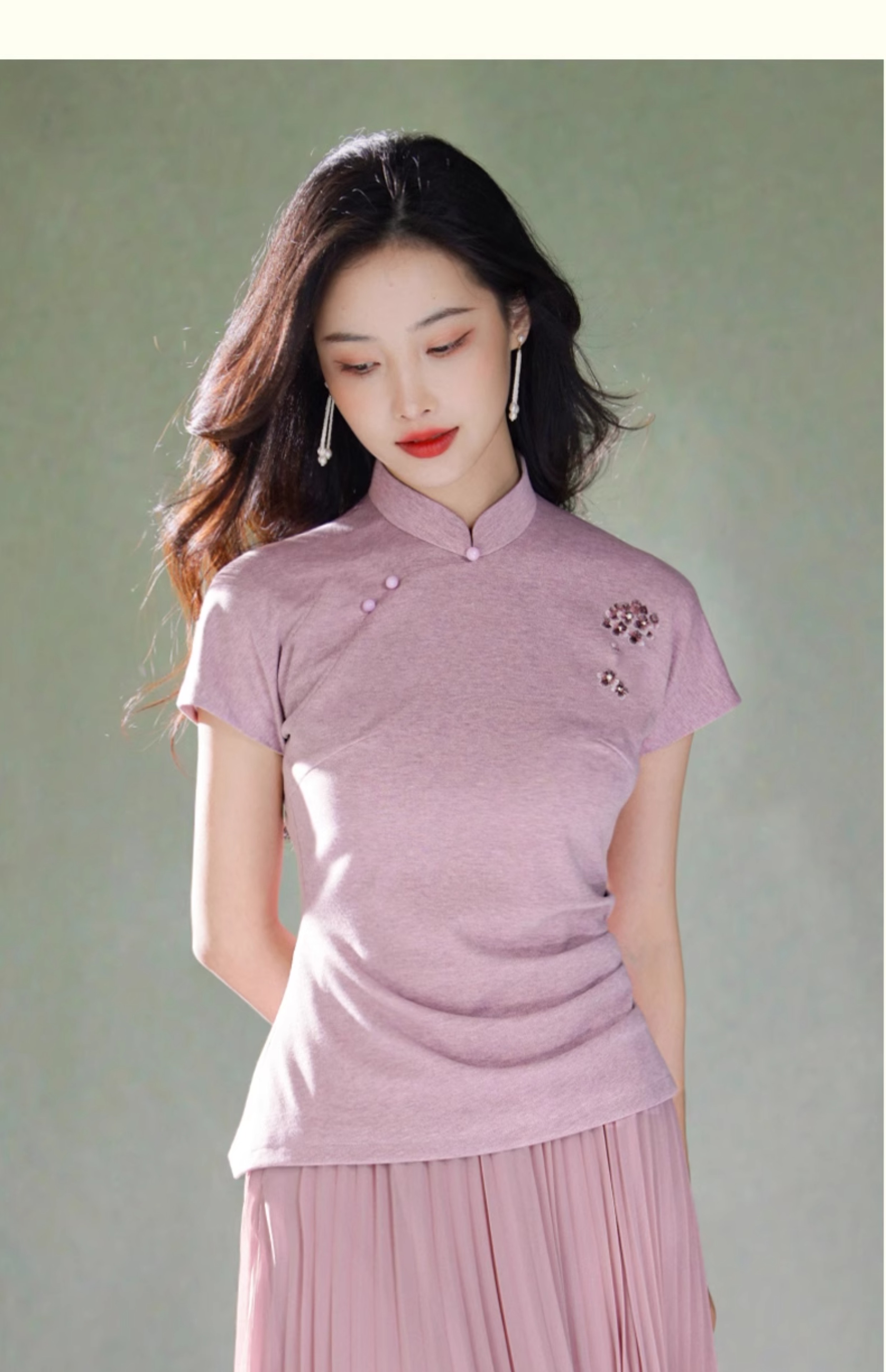 逸红颜琇苒2025夏新款不对称抽褶凉感弹力针织新中式刺绣旗袍上衣