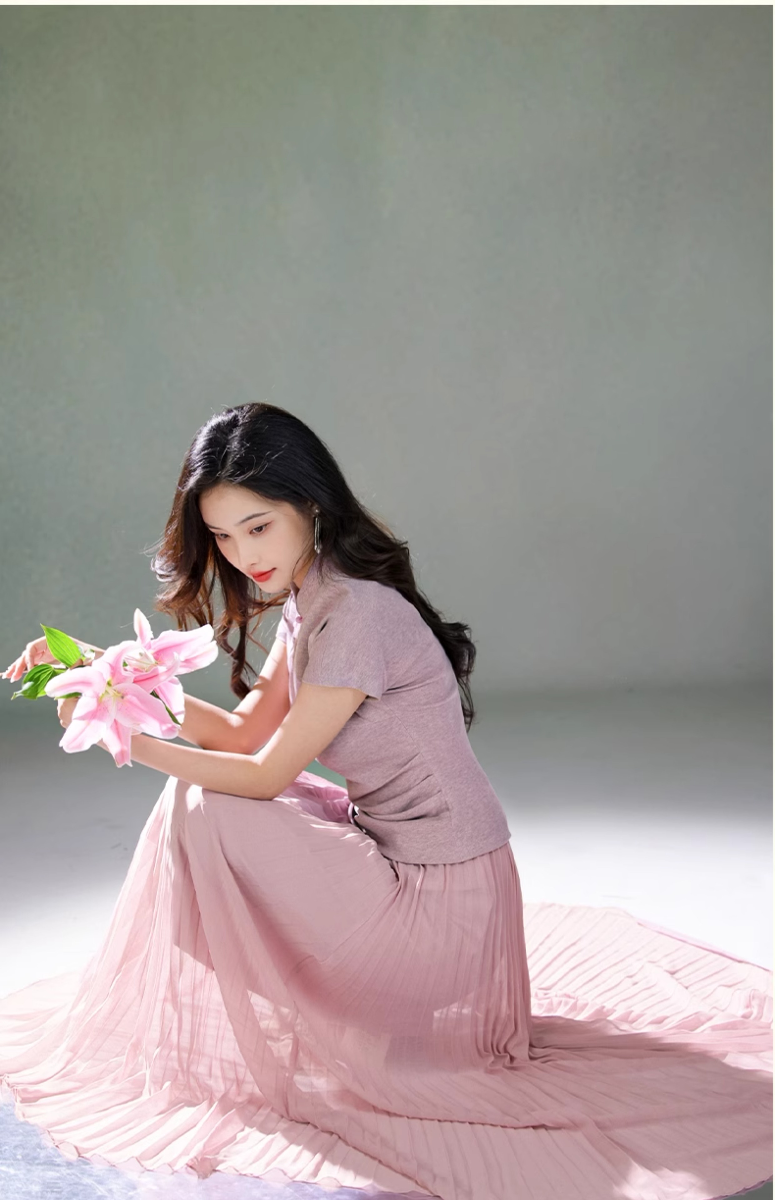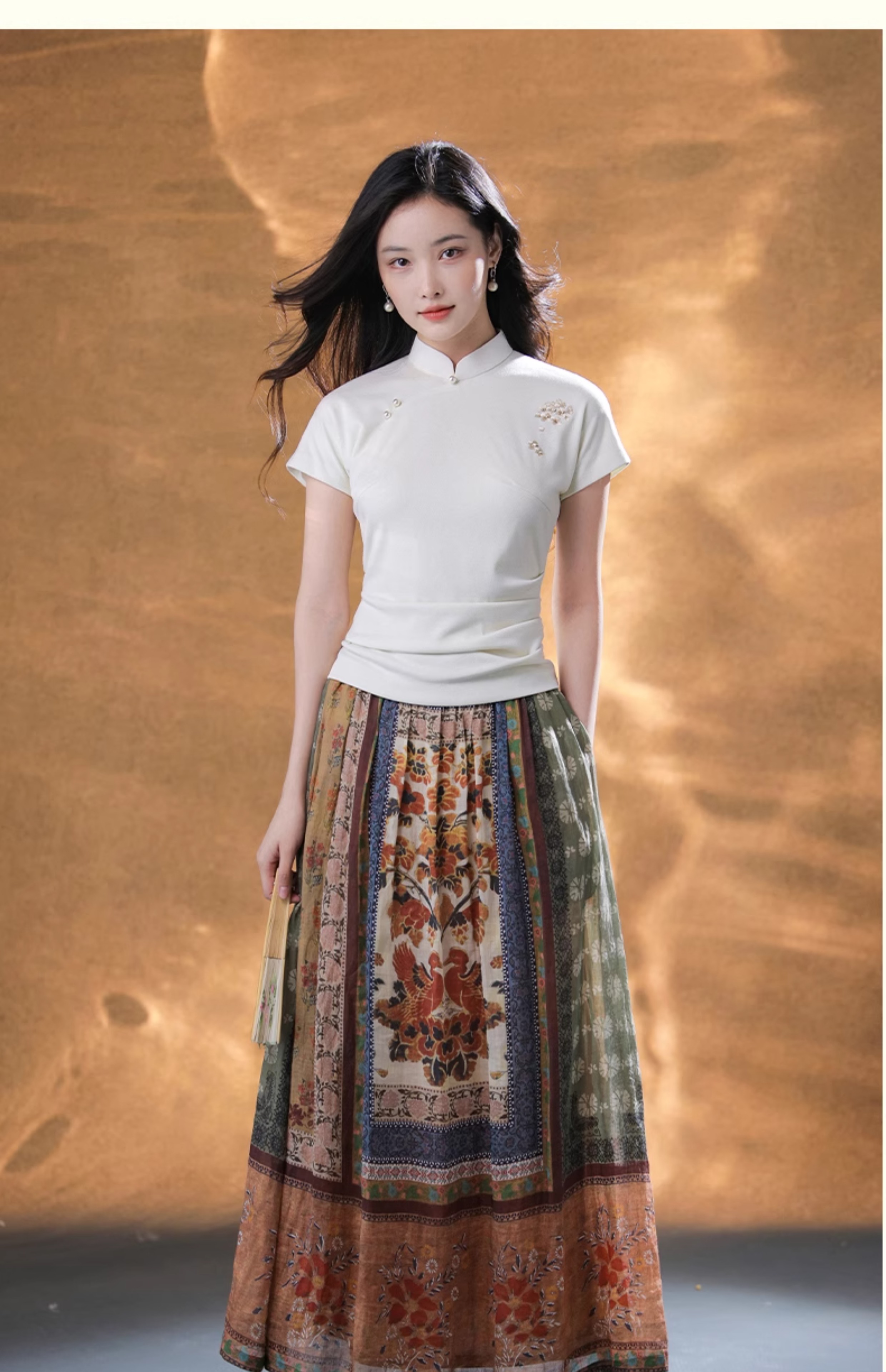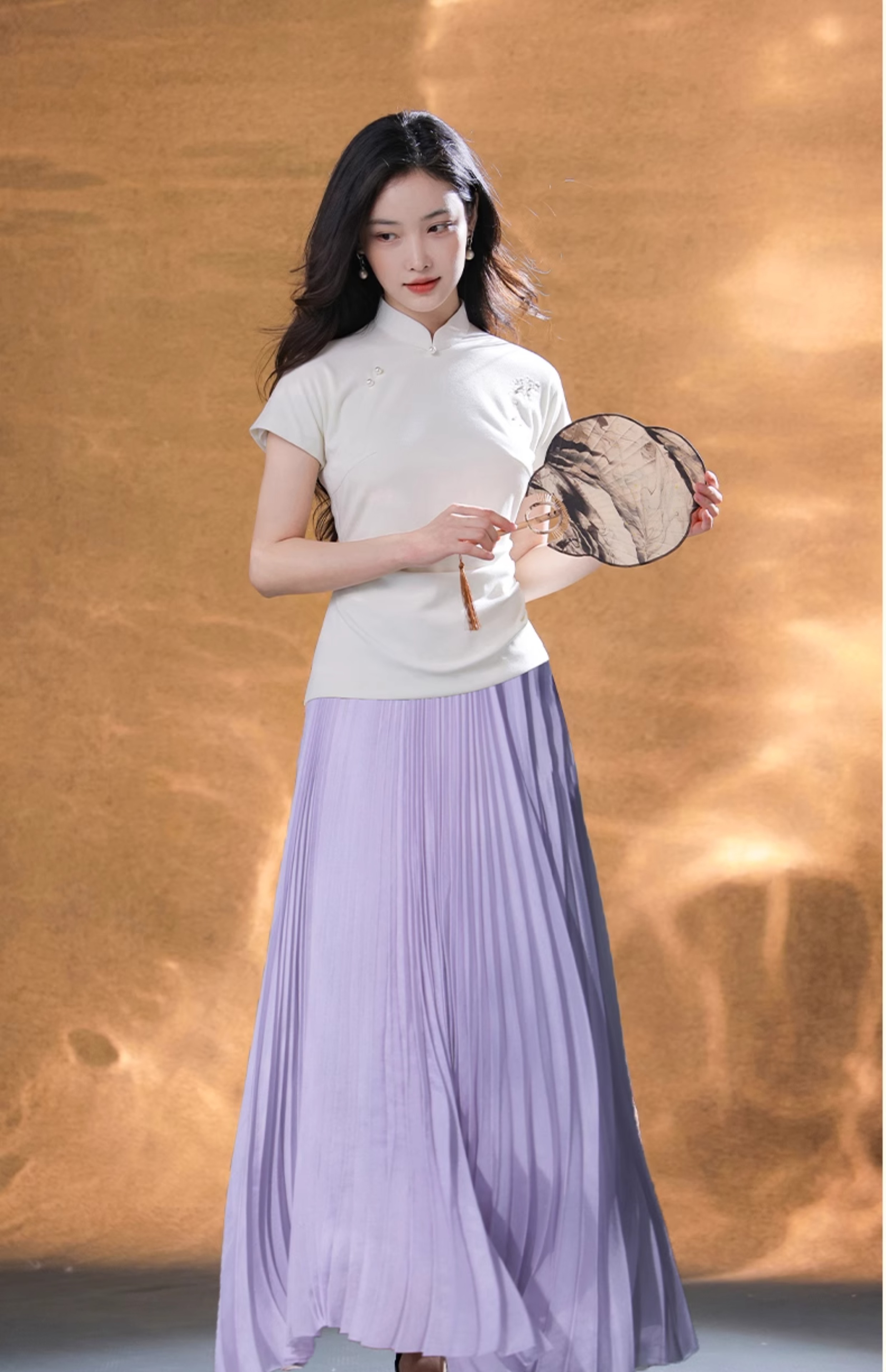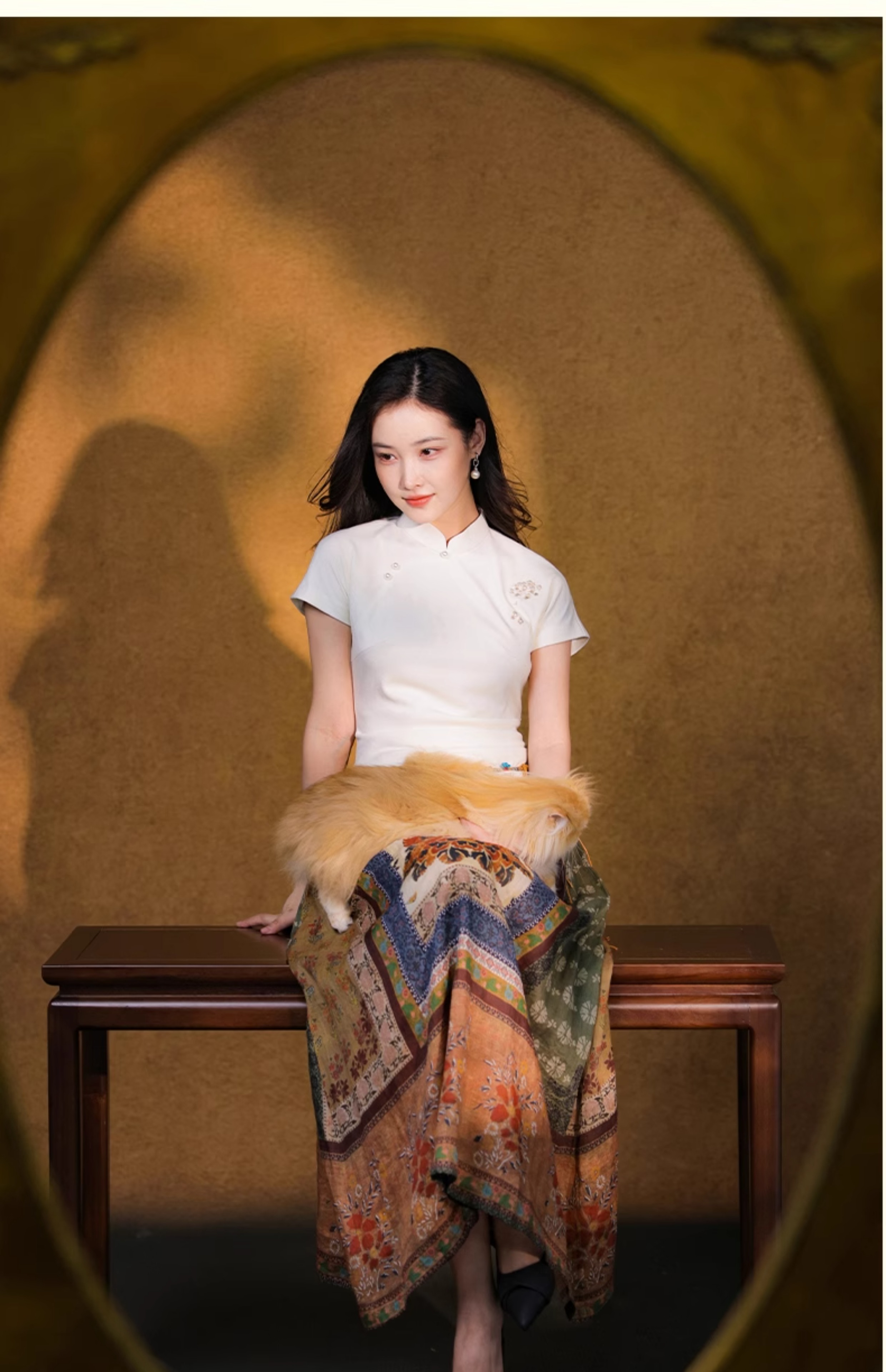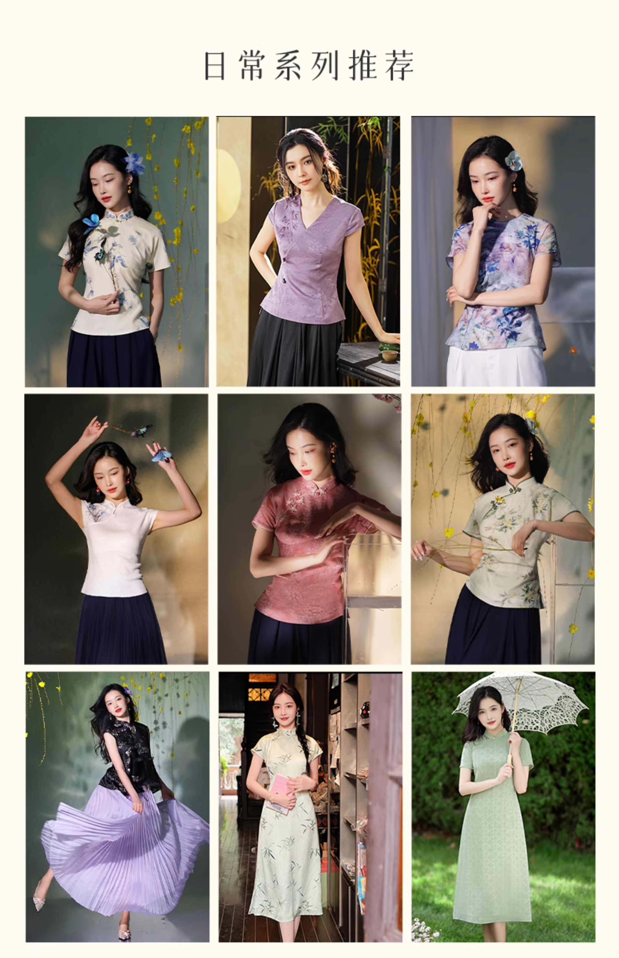 逸红颜琇苒2025夏新款不对称抽褶凉感弹力针织新中式刺绣旗袍上衣