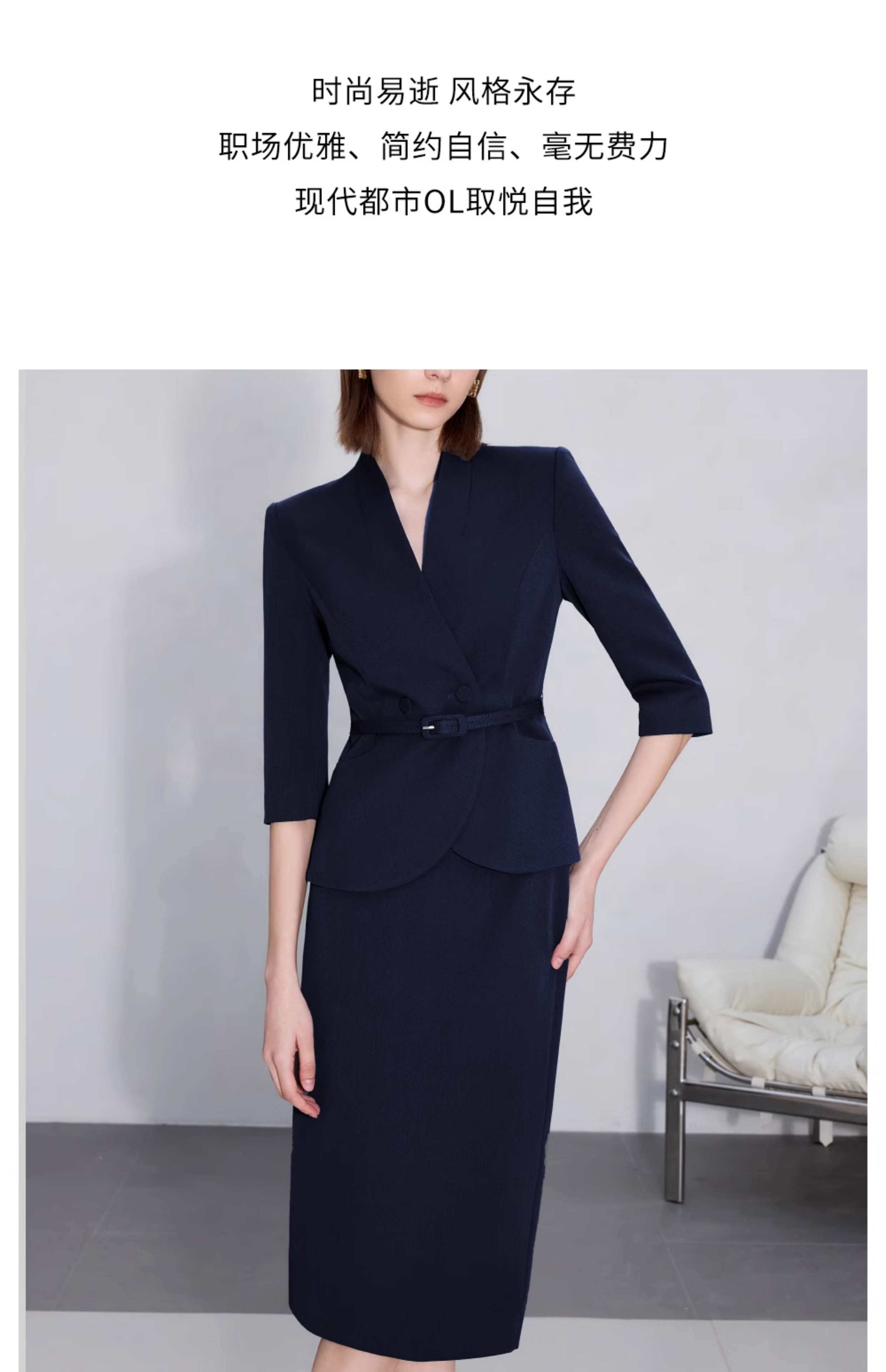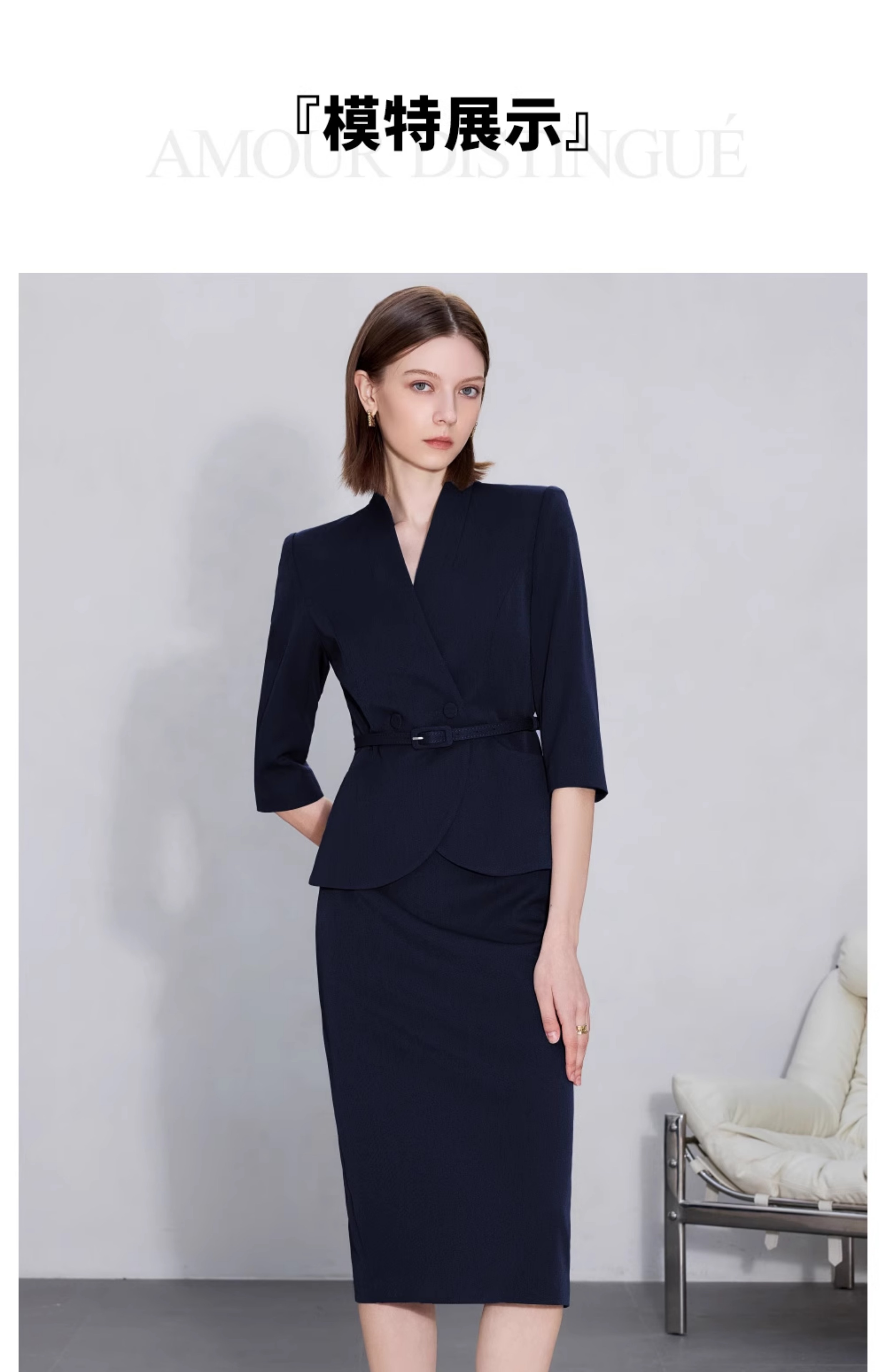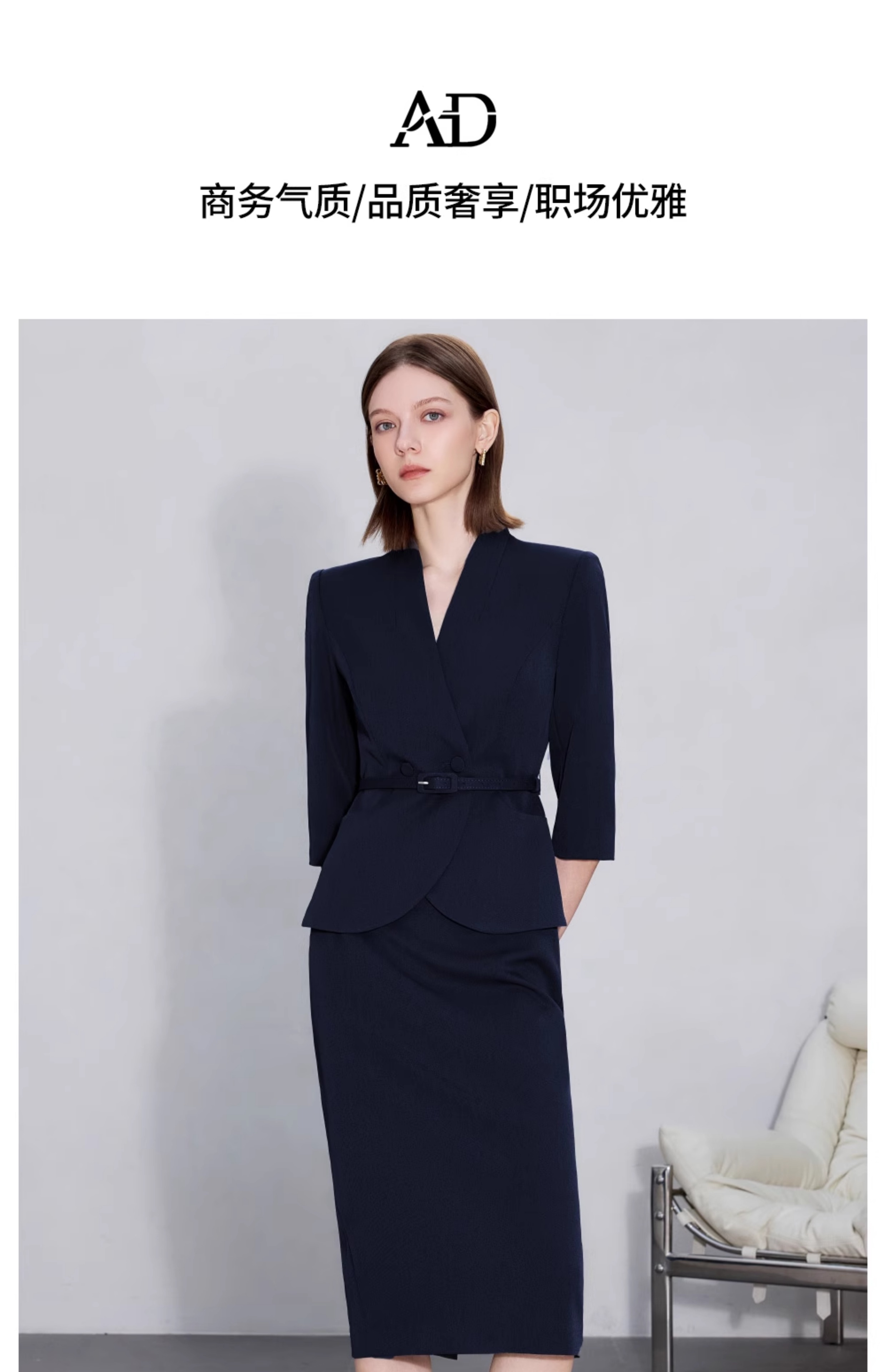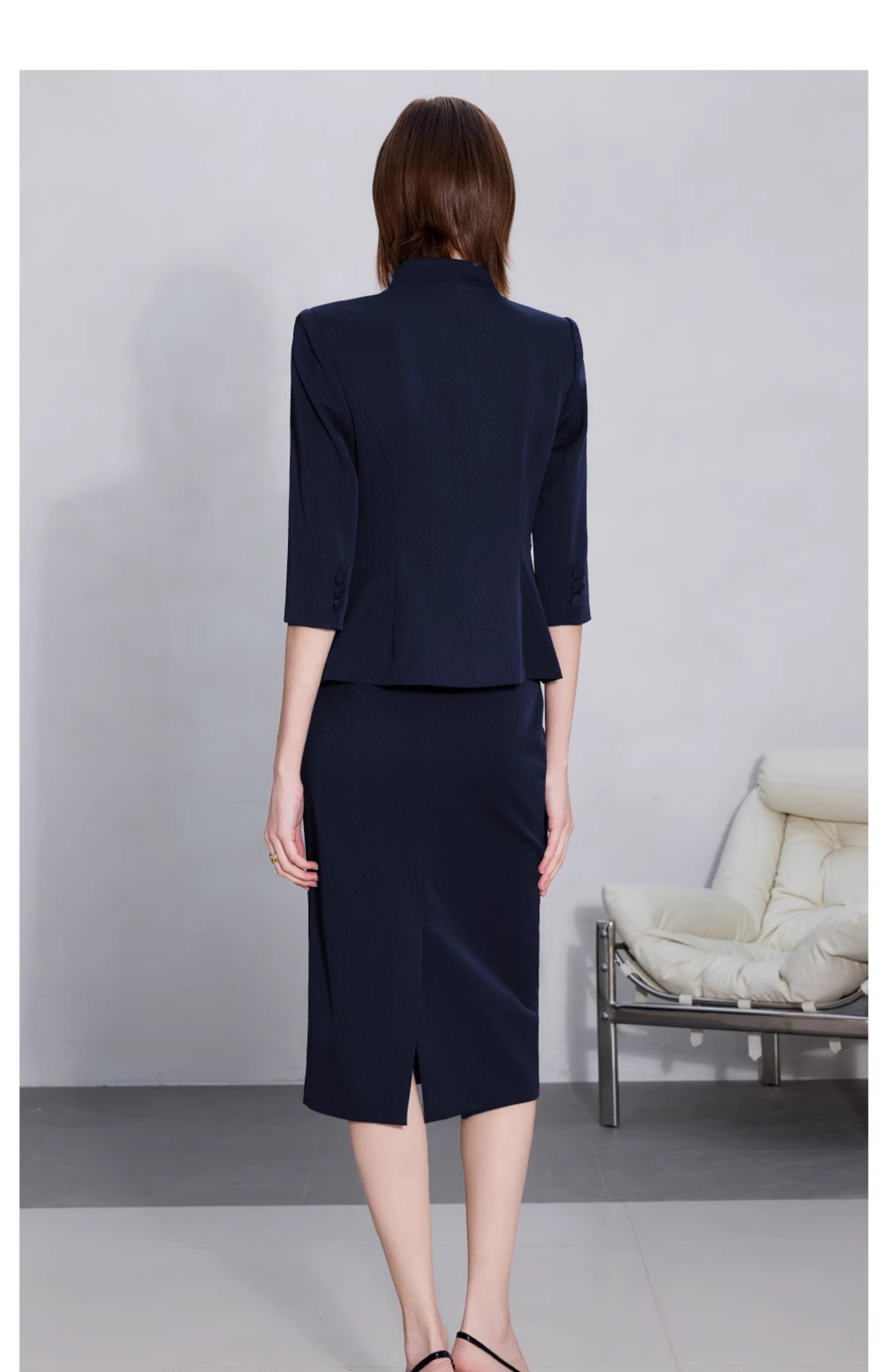 AD职场女装套装2025新款藏青色无领西装套装高级感职业装两件套裙